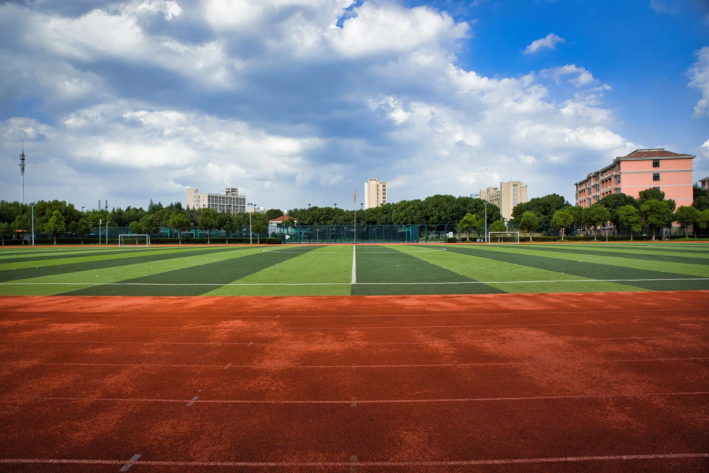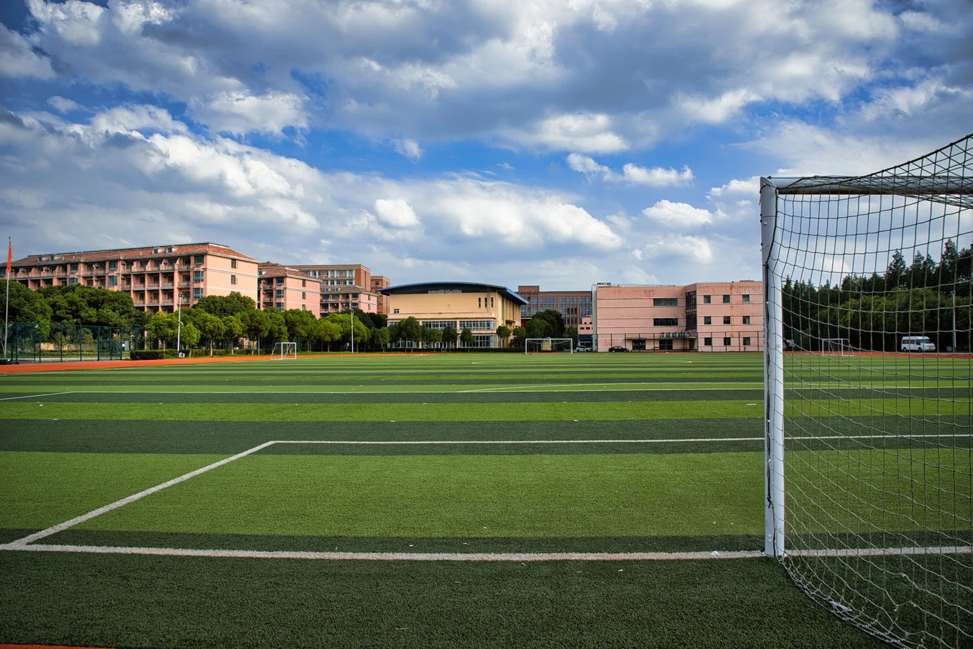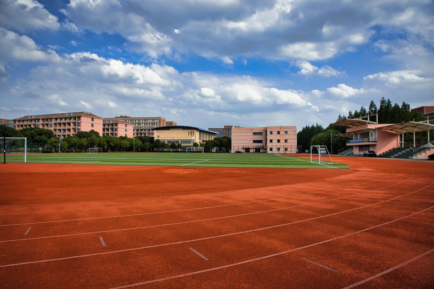 体育场整体设计科学合理,采用标准化建设理念,各项设施均按照专业运动场地标准打造。场地与校内其他体育设施相互配合,形成完整的运动场所体系,包括室内体育馆、篮球场、排球场等,共同构建出集教学、训练、比赛于一体的综合性体育空间。