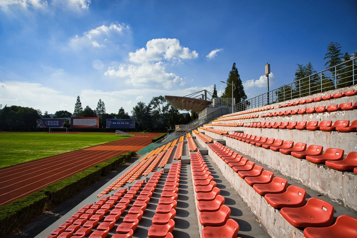 体育场采用标准400米田径场设计,配备专业塑胶跑道和真草草坪足球场,完全符合专业教学与训练要求。场地设有1440座固定看台,配备主席台和专业照明系统,确保各类体育赛事和大型活动的顺利开展。完善的更衣室和器材存储间等配套设施,为使用者提供全方位的便利服务。