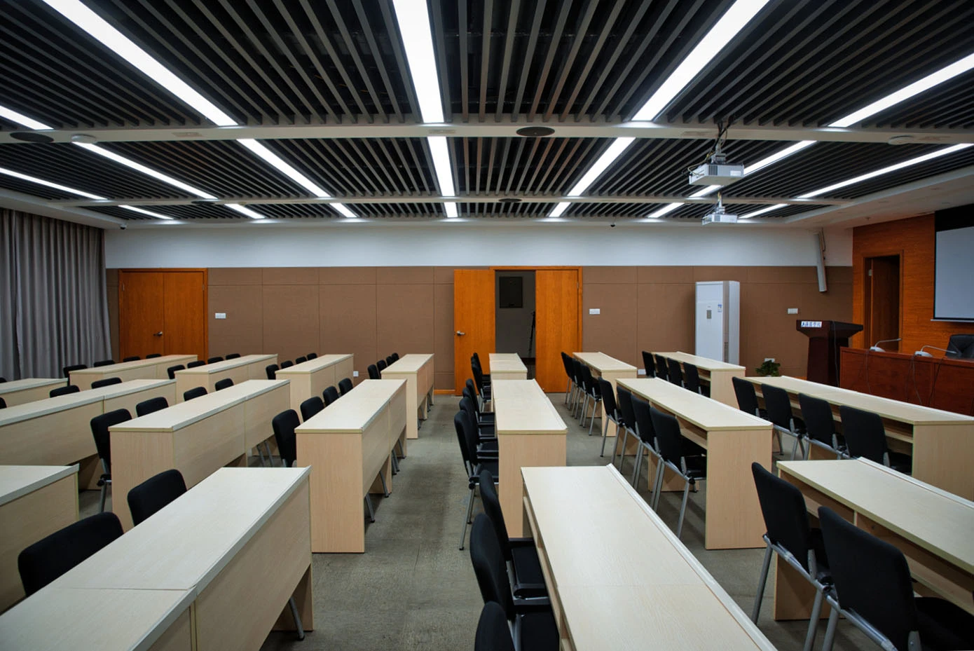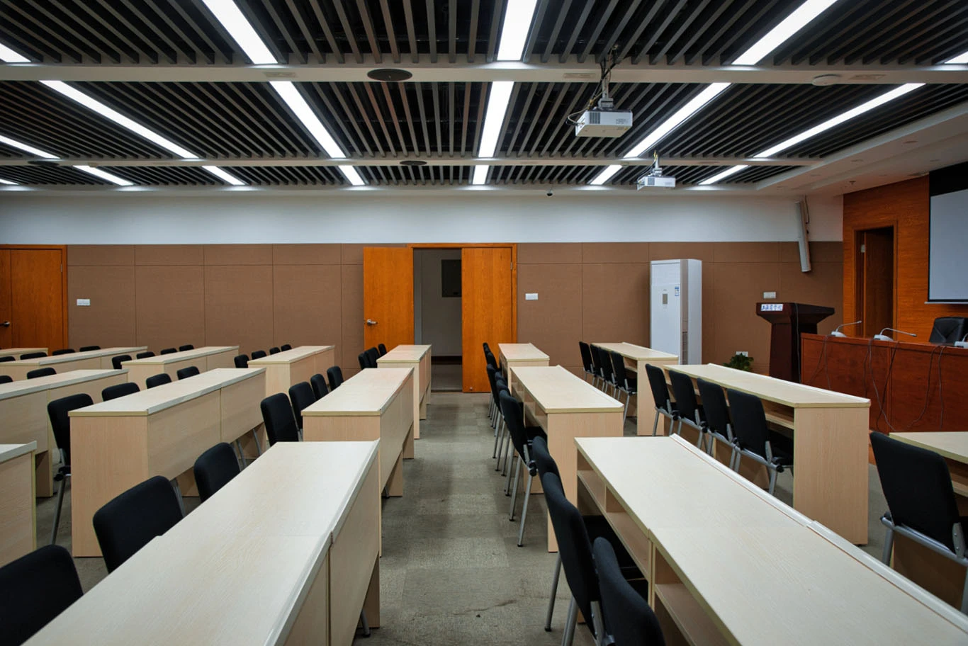 1401报告厅采用专业的课桌式布局,共设84个舒适座位,按照7排×12座的科学排列,确保每位参会者都能获得良好的视野和参会体验。场地配备3套高清投影系统,配合专业音响系统和会议话筒,为各类演示和讨论提供完善的视听支持。6人座演讲台设计满足多人同台发言需求,中央空调系统确保室内环境舒适宜人。
