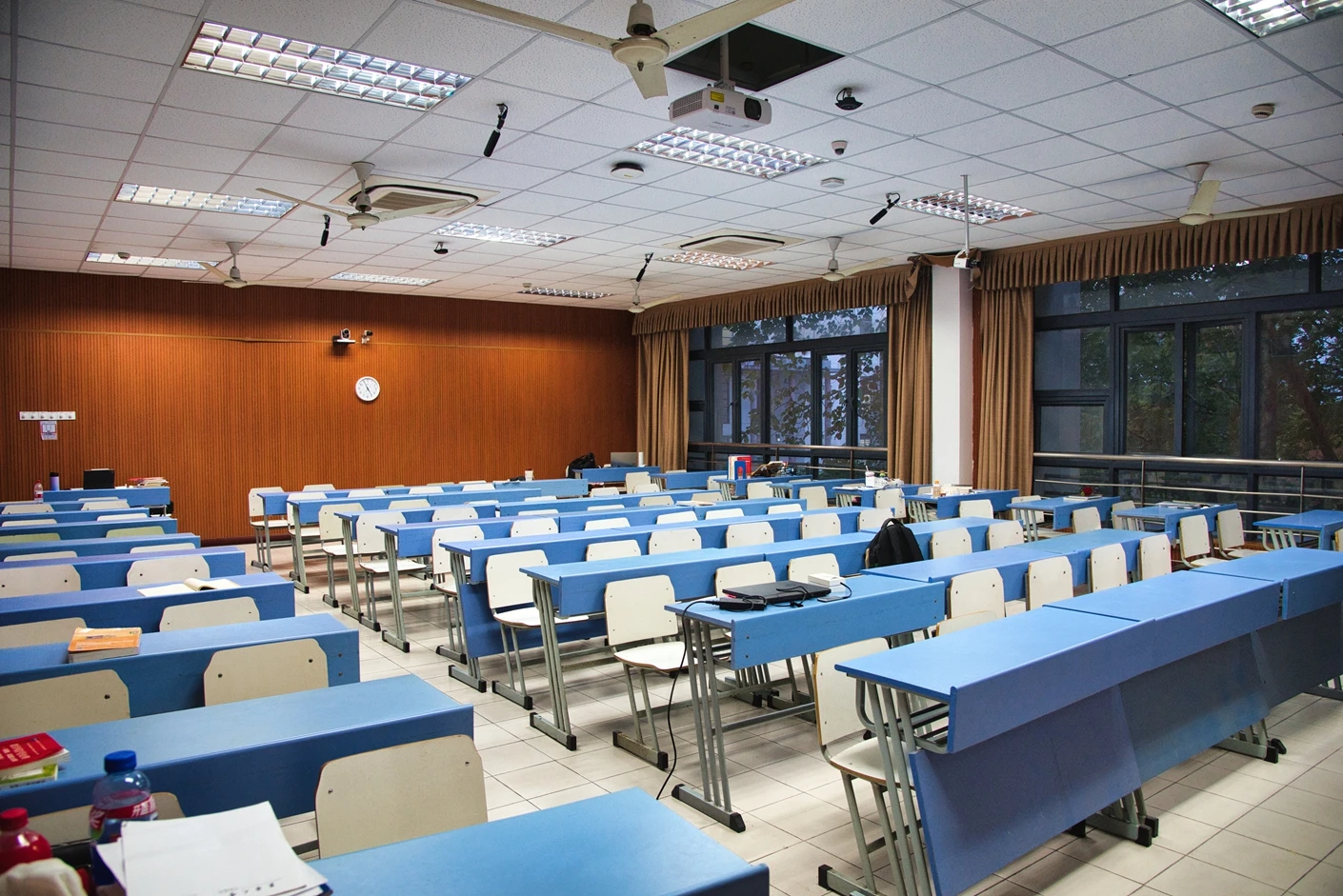在环境舒适度方面,教室安装高效吸顶空调,可根据季节变化精准调节室内温度,快速实现冷暖切换;搭配壁挂式风扇,在春秋温和季节可促进室内空气流通,避免长时间封闭空间的闷热感,双系统协同作用,满足不同天气条件下的使用需求。教室的日常管理由学校后勤部门专人负责,定期对投影仪、音响、吊麦、空调等设备进行检修与维护,确保各类设施始终处于最佳运行状态;保洁人员在每次使用后及时清理教室卫生,擦拭桌面、规整座椅,为下一次使用提供整洁干净的环境。