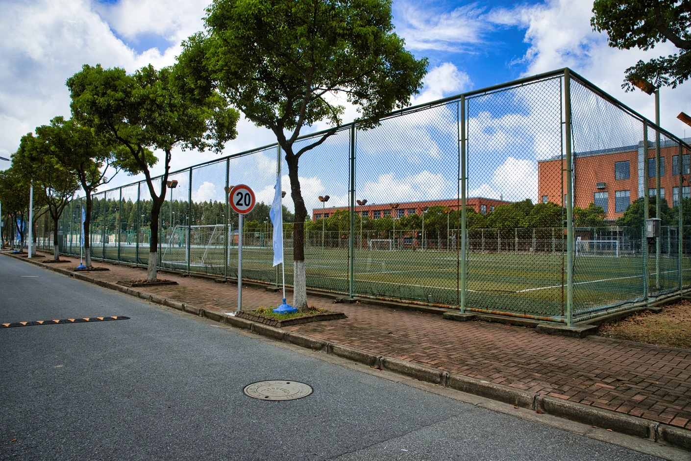 该足球场以78*59 米的开阔空间为基础,科学规划布局了2 个标准化五人制足球场,采用高品质人工草坪铺设,草坪表层柔软且弹性适中,能有效缓冲运动冲击,降低急停、变向时的关节损伤风险,同时具备出色的排水性能,即便雨后也能快速恢复使用,保障全天候运动需求。场地四周设置了4 米高的坚固铁丝围网,经过专业加固处理,既能清晰界定运动区域、防止足球飞出场外,保障运动安全与场地独立性,又能在隔绝外部干扰的同时保持视野通透,让场外观众清晰观赏赛事,营造热烈有序的运动氛围。每片场地均配备标准五人制球门与清晰的场地标线,完全契合竞赛规则;同时配备6 米高的专业夜间照明灯杆,灯光布局科学,光线均匀柔和、无眩光,可满足夜间教学训练与赛事活动需求,彻底打破日间运动的时间限制,为师生课后健身提供充足保障。