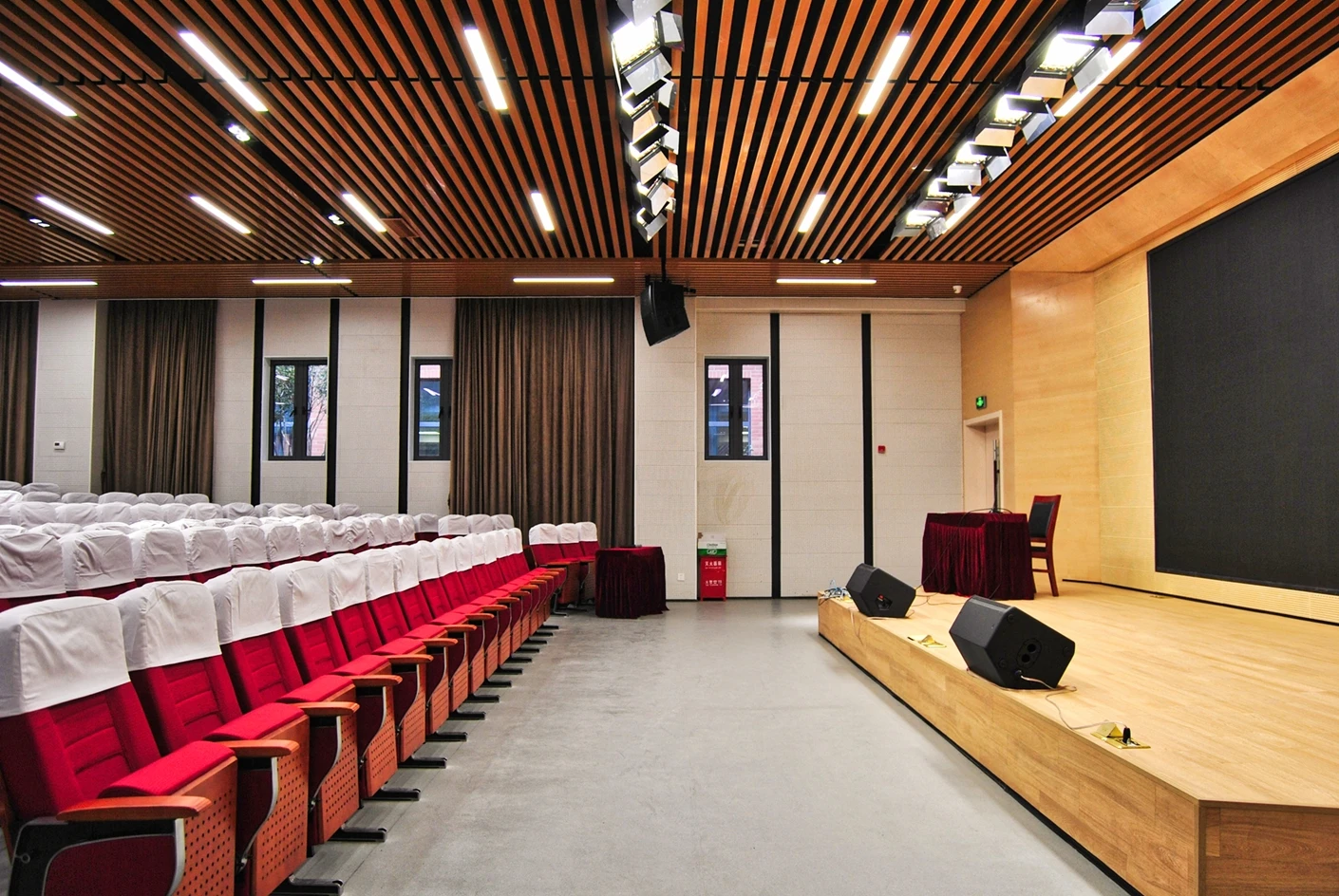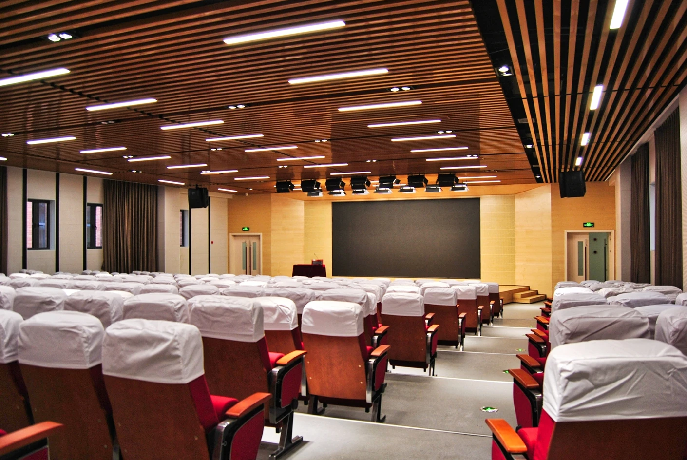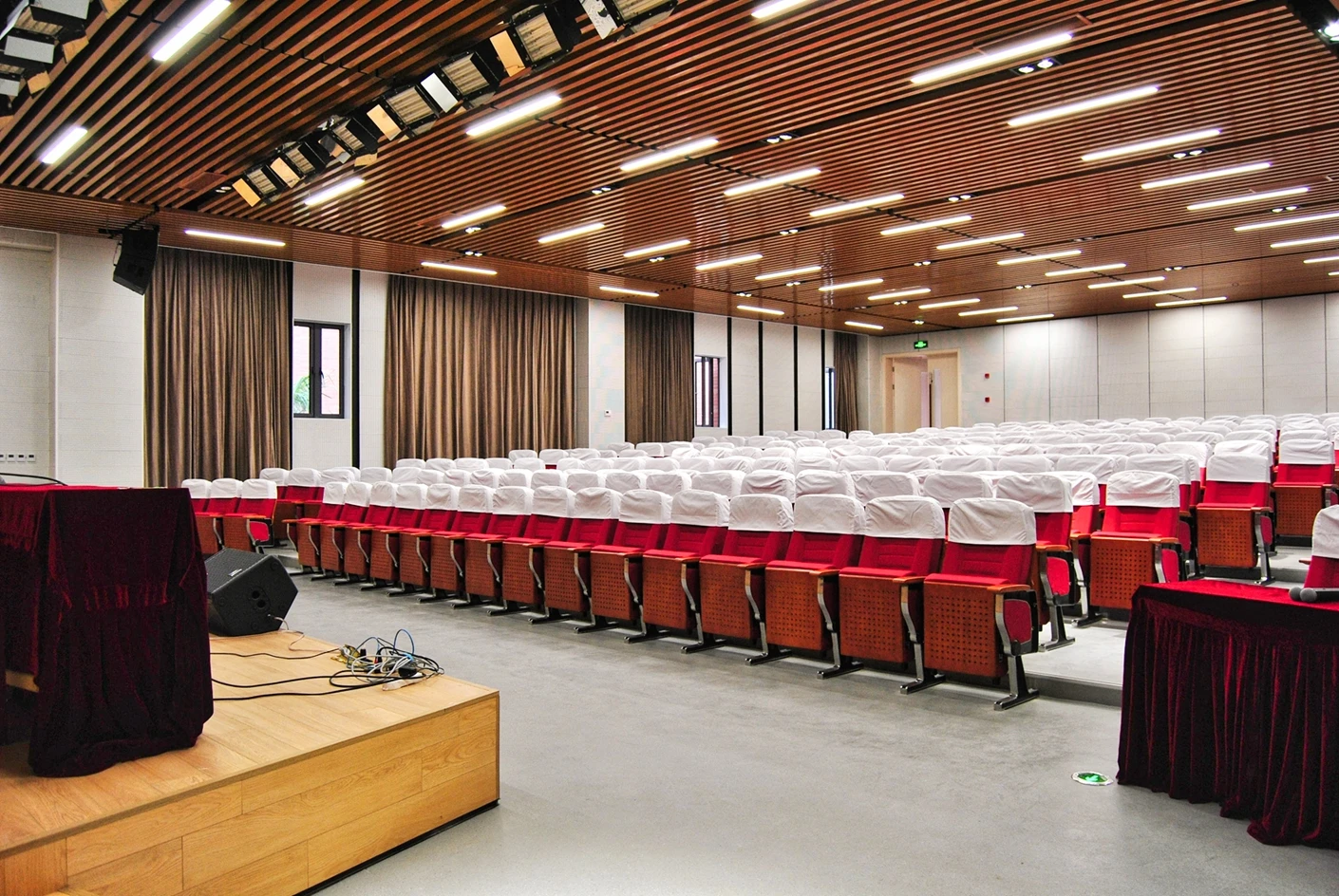 匠兴苑学术报告厅的专业音响系统实现了声场均匀覆盖,会议音响搭配反听设备,既让全场参会者都能清晰接收声音信息,也能让台上的演讲者、表演者实时听到现场音效,提升表达与展示的流畅度;6*2米演讲台台面规整、高度适配,满足各类发言、主持、表演的舞台需求,面光灯则对台上区域进行精准补光,让人物形象与展示内容更清晰,提升整体视觉效果。独立设置的音控室是场地的核心调控枢纽,可实现灯光、音响、大屏、拾音等所有设备的一体化专业调控,无需在活动现场进行临时操作,既保障了设备调控的精准性与高效性,也让活动现场的秩序更整洁,大幅提升活动的执行效率。300个固定座椅按合理间距排布,座椅舒适度高,观影与听音视角俱佳,既适配数小时的学术报告、培训讲座,也能满足赛事活动、文艺展演的全程就坐需求,让参会者拥有良好的体验感。