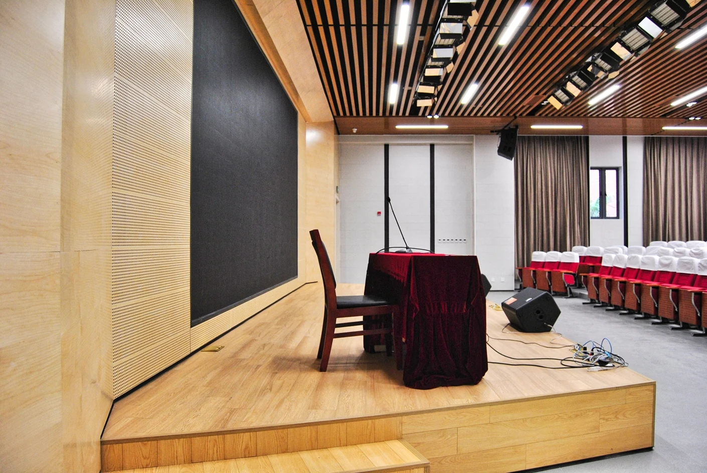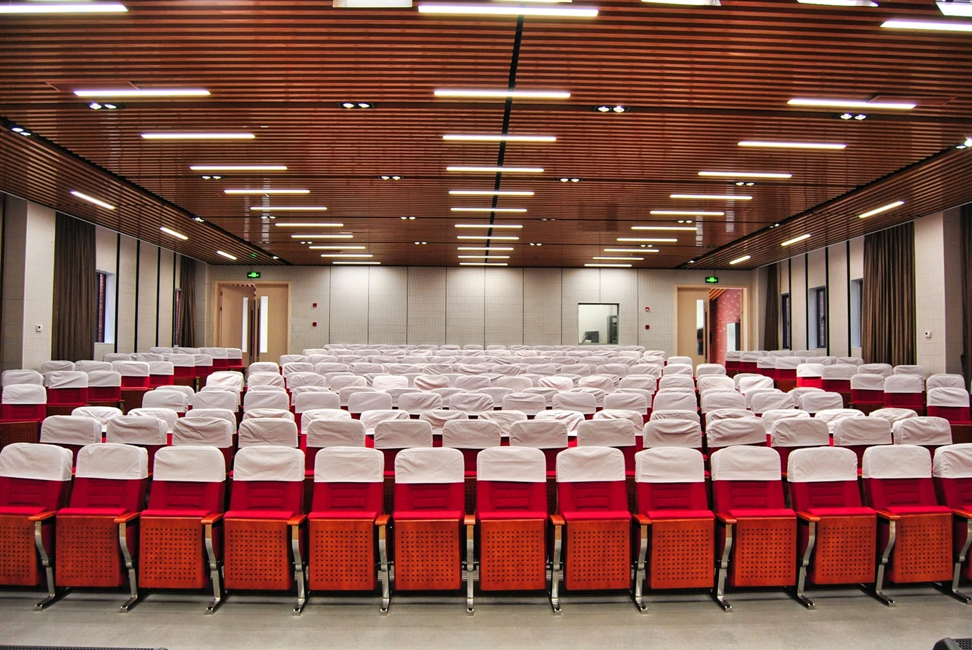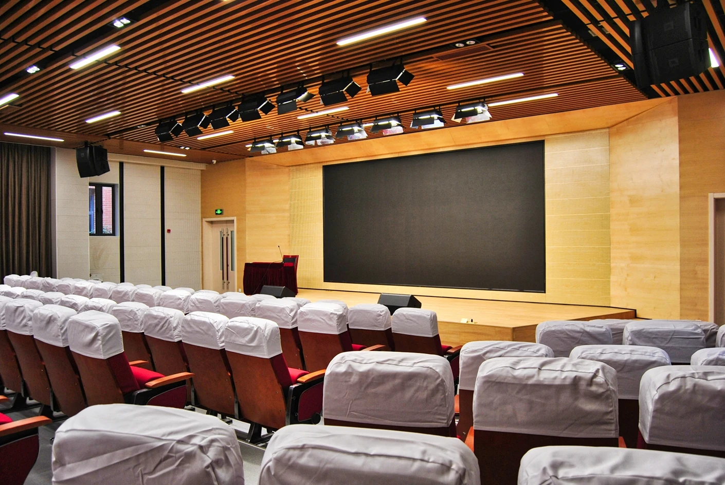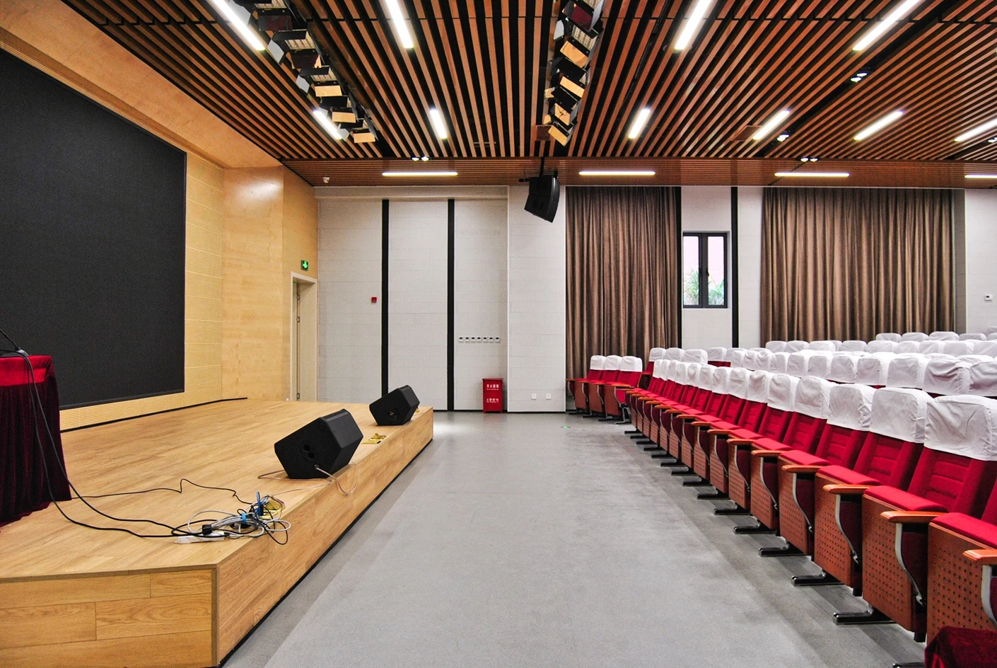 匠兴苑学术报告厅的专业音响系统实现了声场均匀覆盖,会议音响搭配反听设备,既让全场参会者都能清晰接收声音信息,也能让台上的演讲者、表演者实时听到现场音效,提升表达与展示的流畅度;6*2米演讲台台面规整、高度适配,满足各类发言、主持、表演的舞台需求,面光灯则对台上区域进行精准补光,让人物形象与展示内容更清晰,提升整体视觉效果。独立设置的音控室是场地的核心调控枢纽,可实现灯光、音响、大屏、拾音等所有设备的一体化专业调控,无需在活动现场进行临时操作,既保障了设备调控的精准性与高效性,也让活动现场的秩序更整洁,大幅提升活动的执行效率。300个固定座椅按合理间距排布,座椅舒适度高,观影与听音视角俱佳,既适配数小时的学术报告、培训讲座,也能满足赛事活动、文艺展演的全程就坐需求,让参会者拥有良好的体验感。