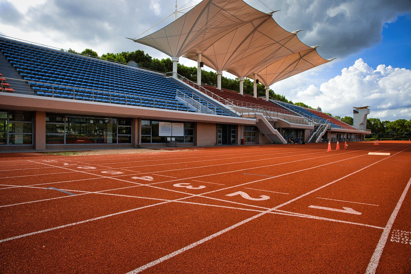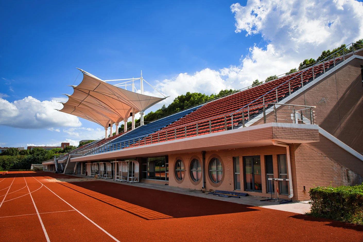 体育场整体设计科学合理,拥有标准400米环形塑胶跑道和优质人造草皮内场,既满足专业田径训练与正式比赛需求,也为足球等团队运动项目提供了理想的运动条件。场地设有2763个固定看台座位,视野开阔、布局规整,同时配备专业的灯光设备和音响系统,可保障日间与夜间各类体育活动、文化集会顺利开展。配套建设的乒乓球室和功能休息室,进一步完善了场地服务体系,提升了综合使用体验与承载能力。