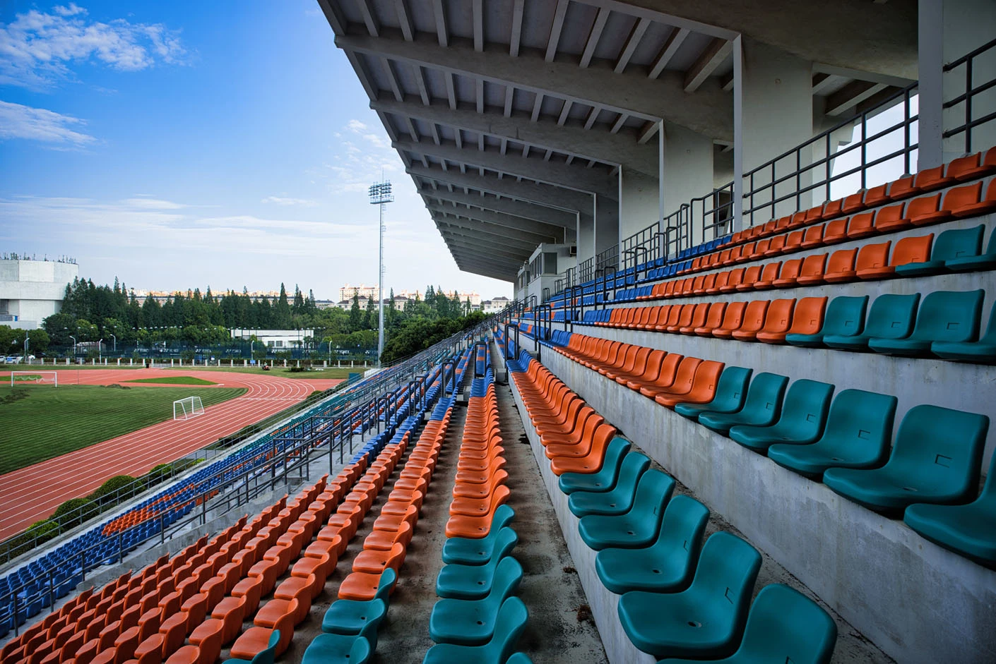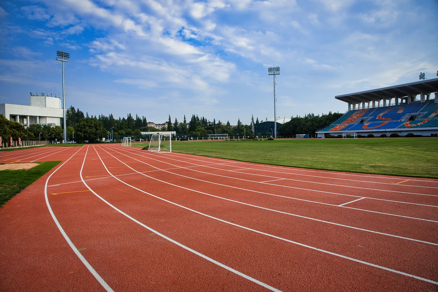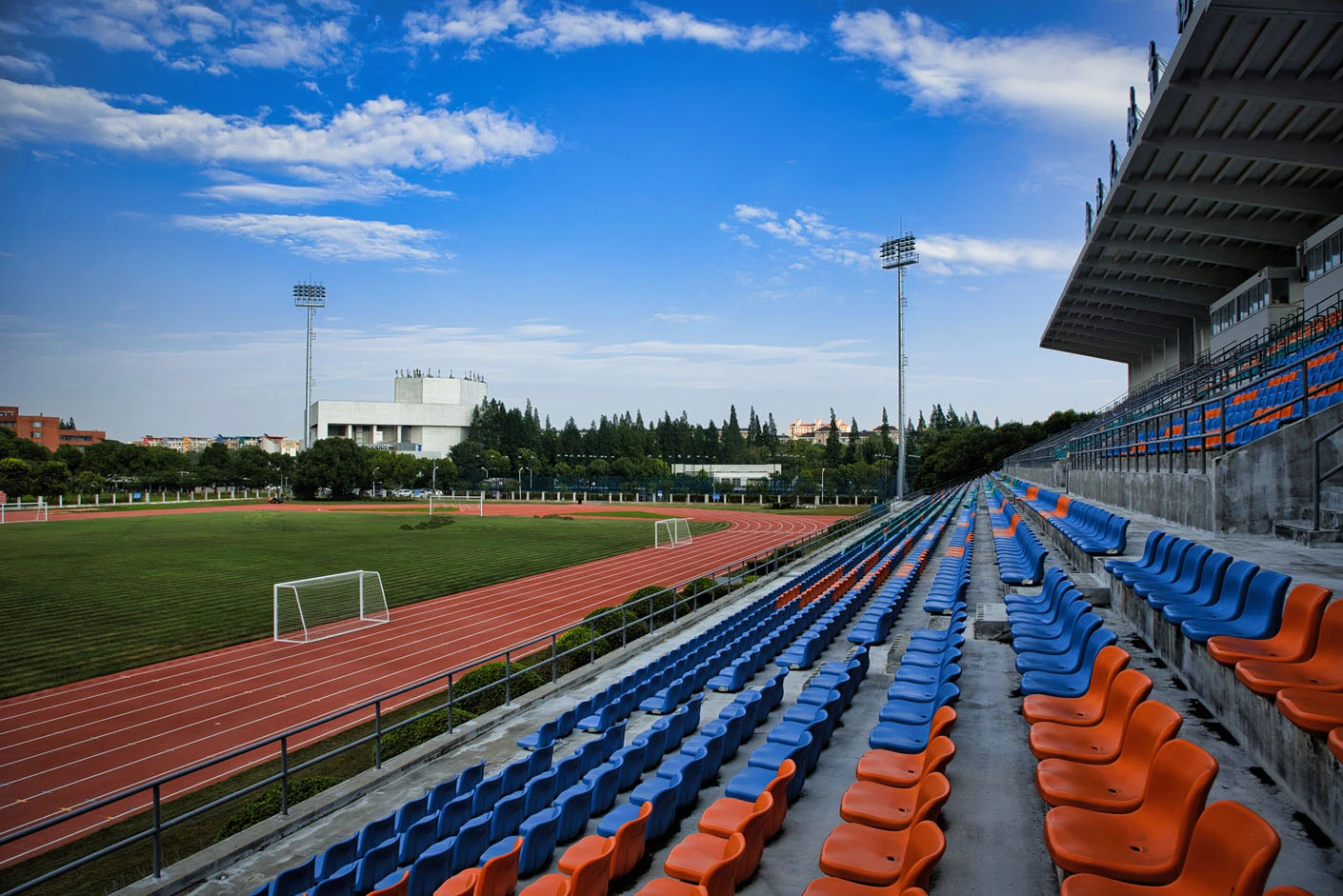 作为闵行校区西北片区的核心体育建筑,体育场总建筑面积达5711平方米,占地6300平方米,整体设计充分兼顾高校专业体育教学、竞技赛事与大型校园活动的多元需求,布局科学、功能完备。体育场西临城市主干道,东、南两侧紧邻校园核心干道,地理位置得天独厚,校内校外通行均十分便捷,与周边菁菁堂、胡晓明网球场等文体设施联动呼应,共同构成闵行校区西北角规模完善、氛围浓厚的文体活动集聚区。