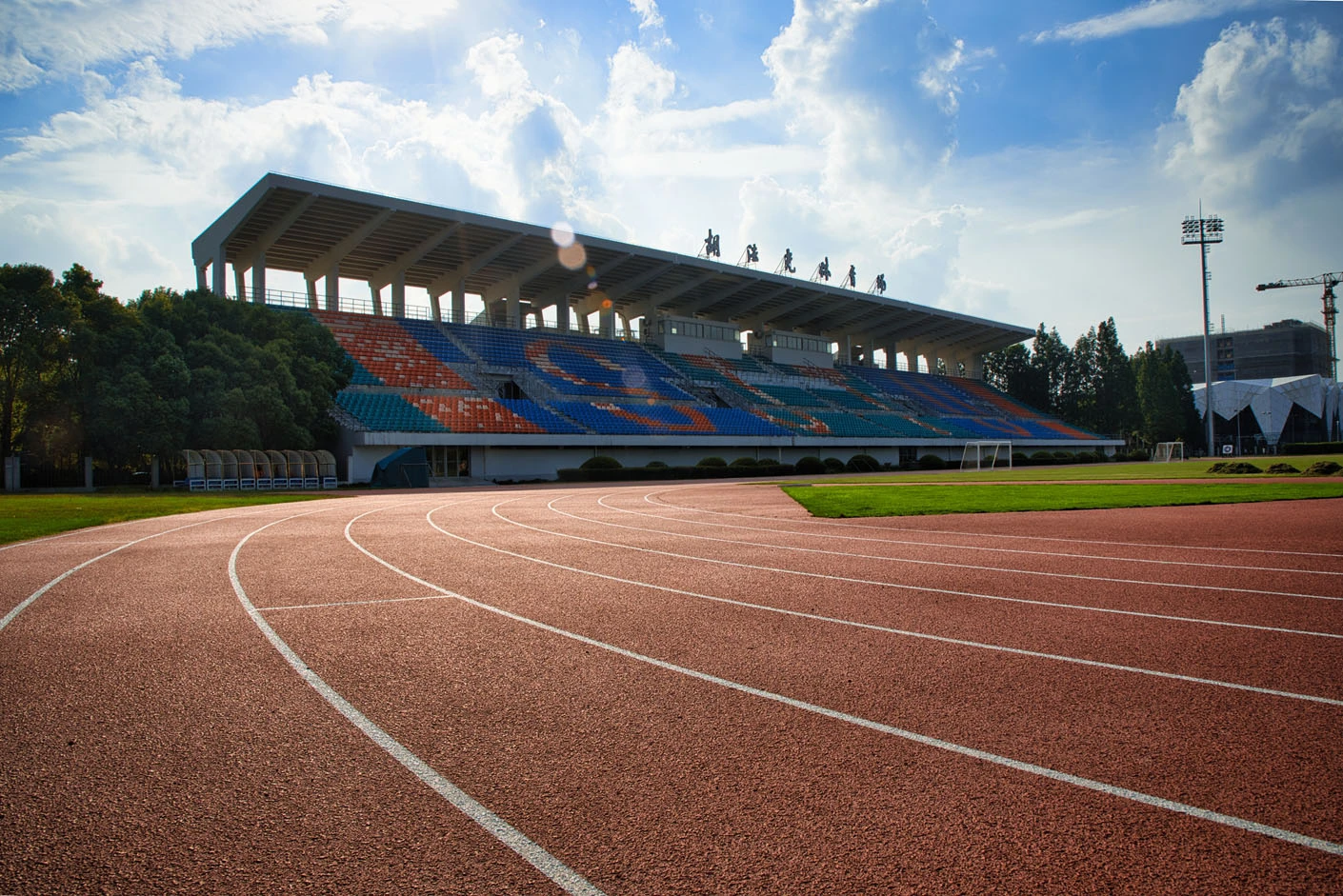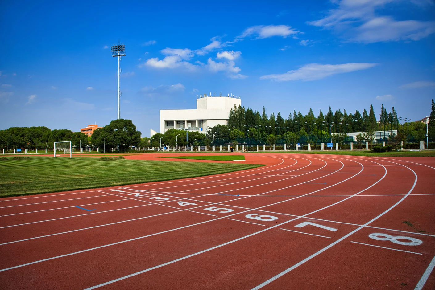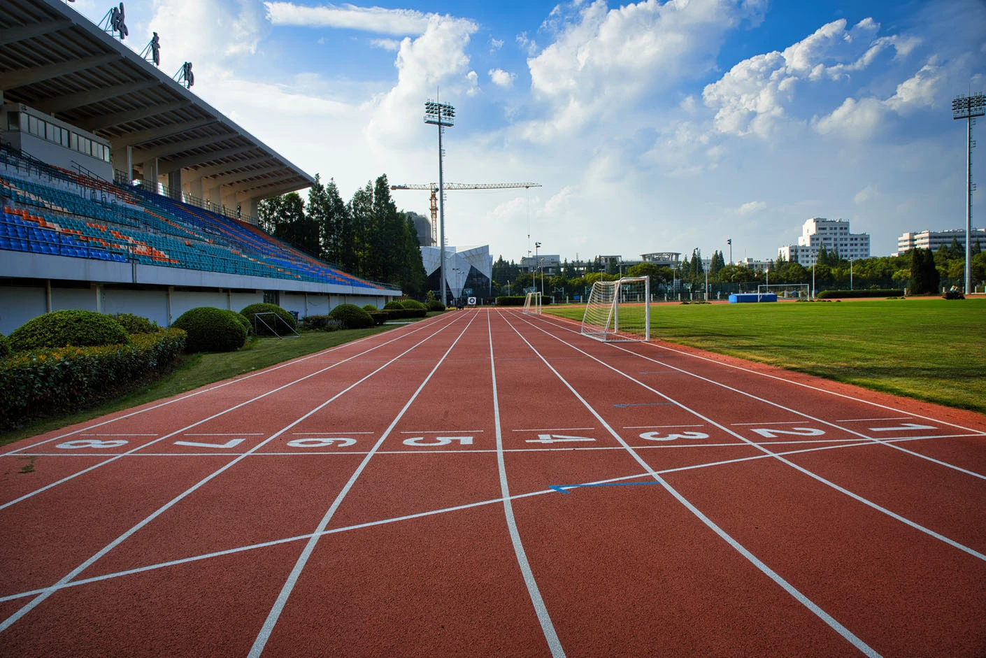 作为闵行校区西北片区的核心体育建筑,体育场总建筑面积达5711平方米,占地6300平方米,整体设计充分兼顾高校专业体育教学、竞技赛事与大型校园活动的多元需求,布局科学、功能完备。体育场西临城市主干道,东、南两侧紧邻校园核心干道,地理位置得天独厚,校内校外通行均十分便捷,与周边菁菁堂、胡晓明网球场等文体设施联动呼应,共同构成闵行校区西北角规模完善、氛围浓厚的文体活动集聚区。