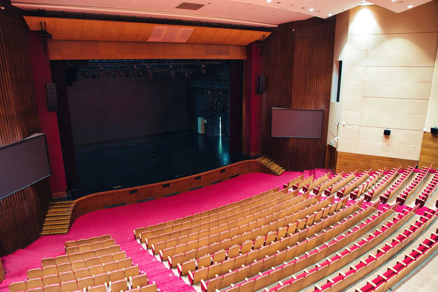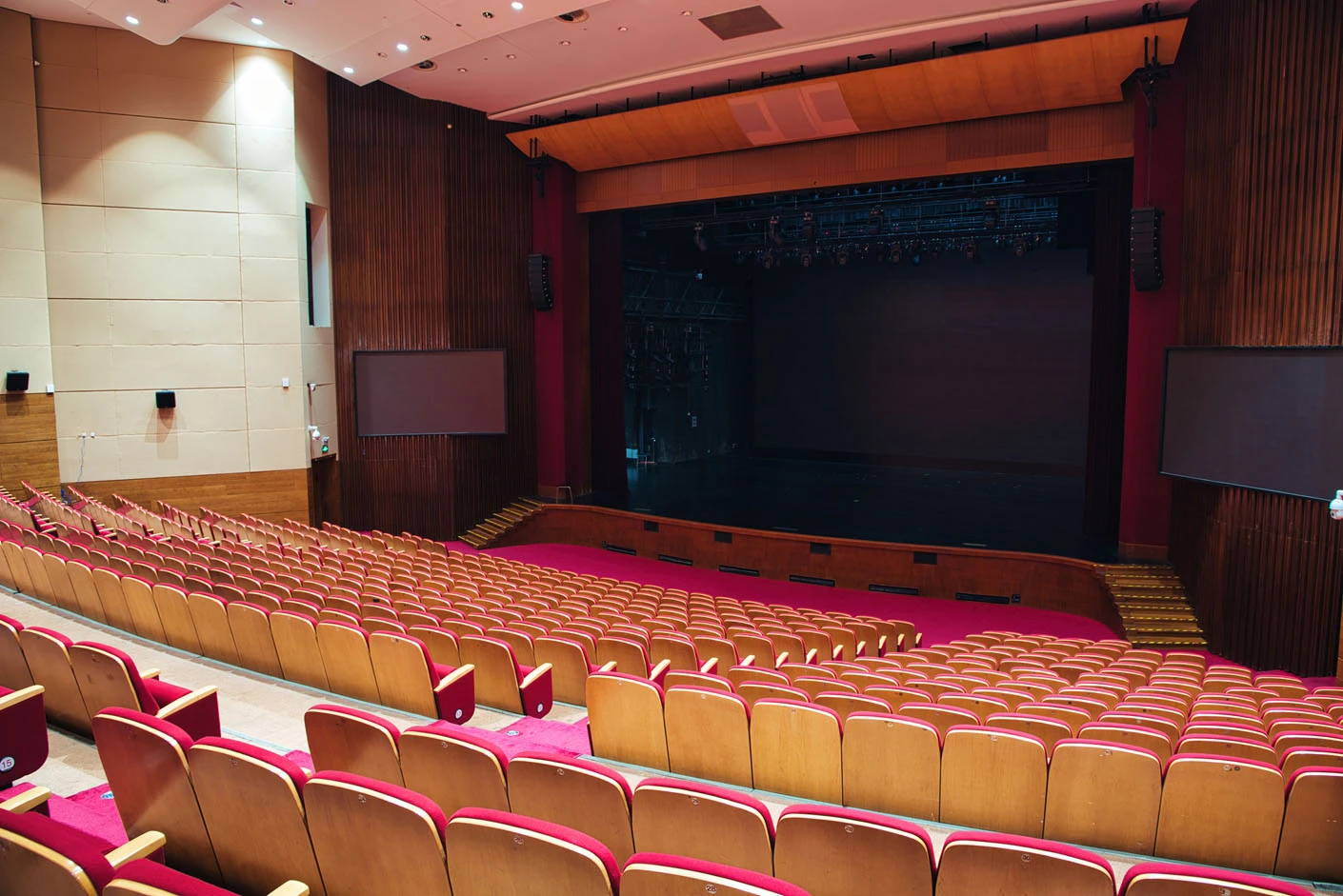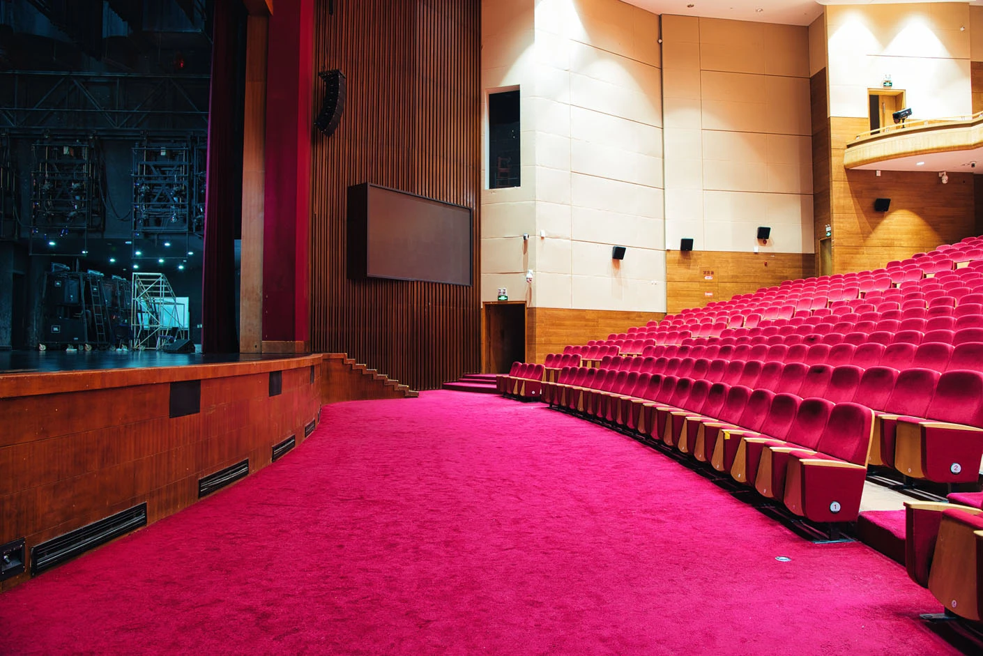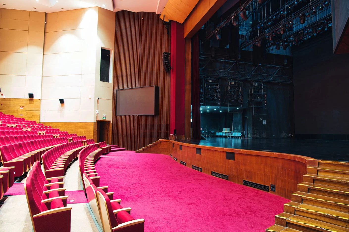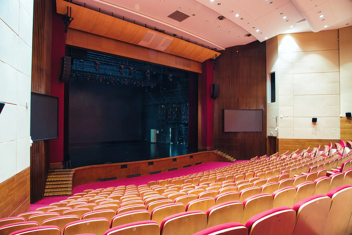 剧场内部遵循专业剧场标准打造,整体空间布局科学合理,声学环境经过专业调试,音质通透均衡,可充分满足话剧、音乐会、歌舞剧等不同艺术形式的听觉呈现需求。舞台上方配备先进的灯光升降设备,搭载全套专业灯光音响系统,可精准营造多元舞台氛围,保障演出效果的完美呈现。同时,剧场配备两架大型多媒体投影设备、专业射灯以及中央空调系统,从视觉、听觉、体感等多方面,为各类演出与活动提供全方位、高品质的技术支撑。
