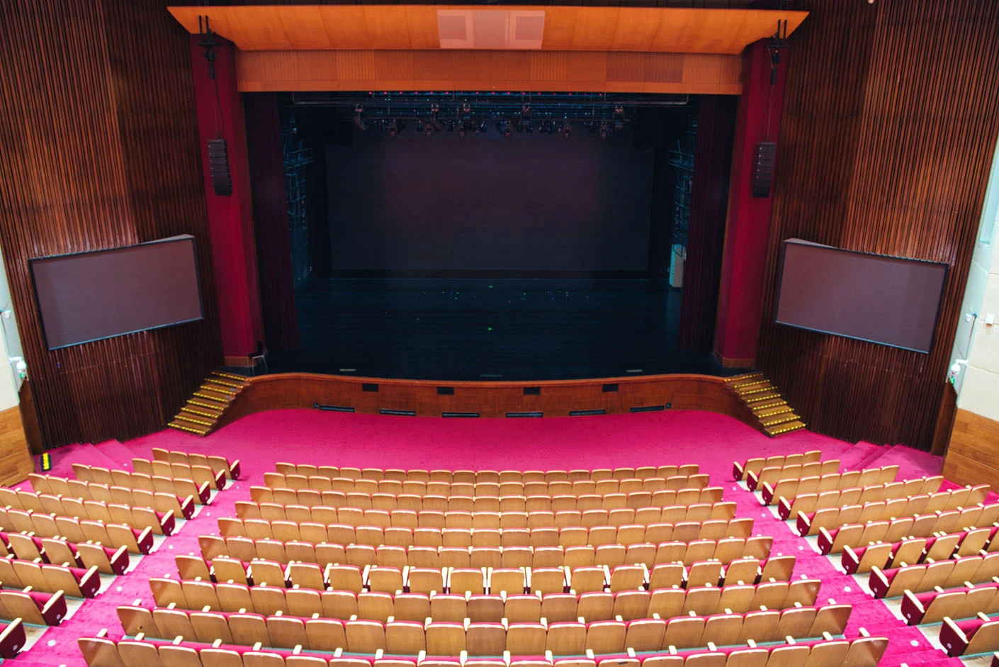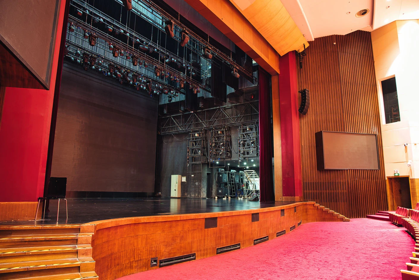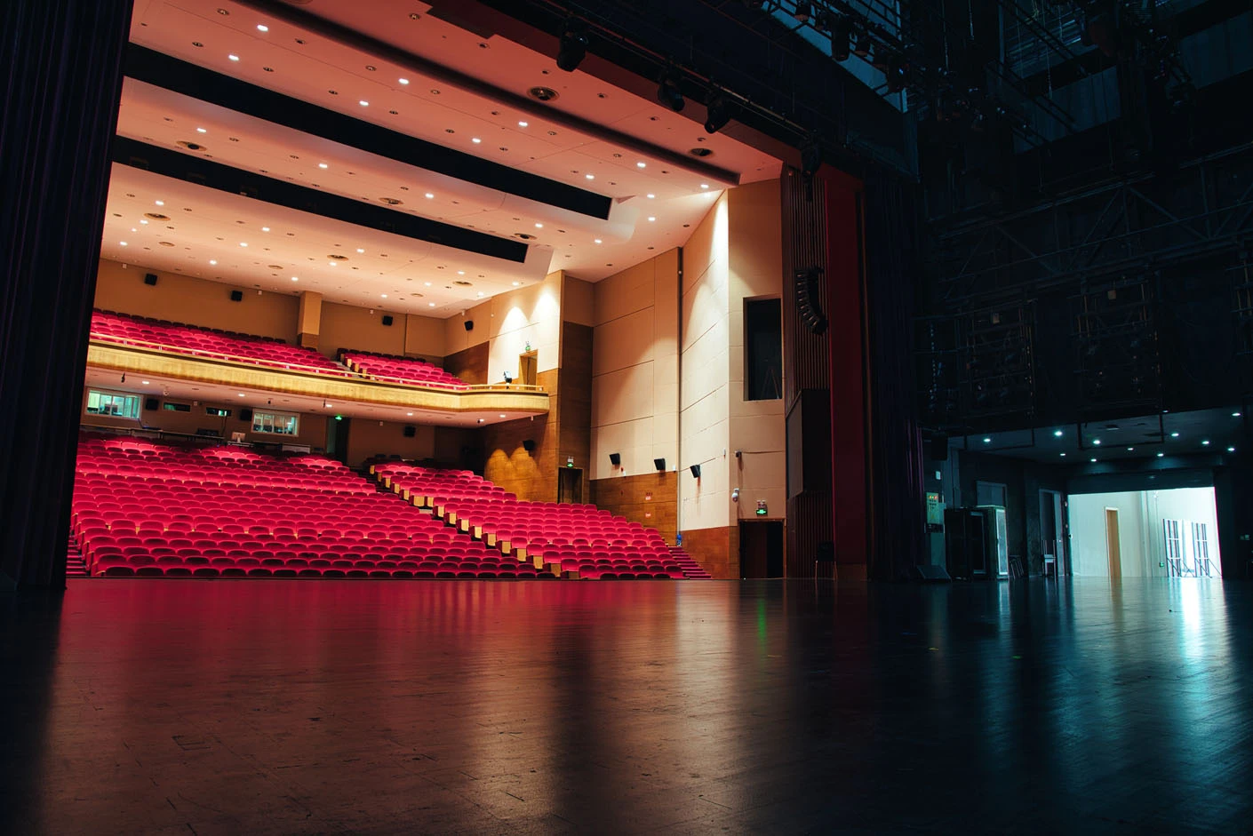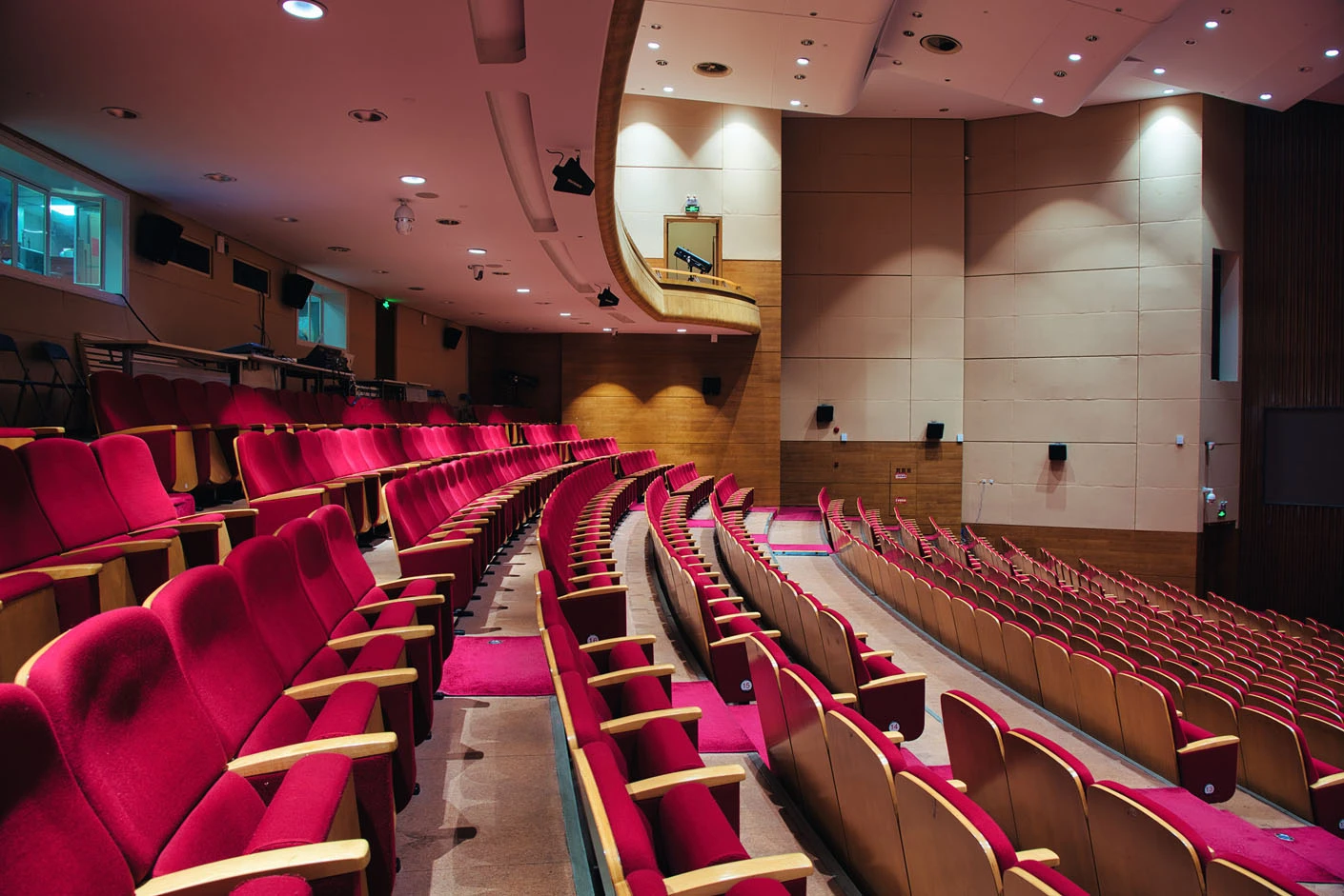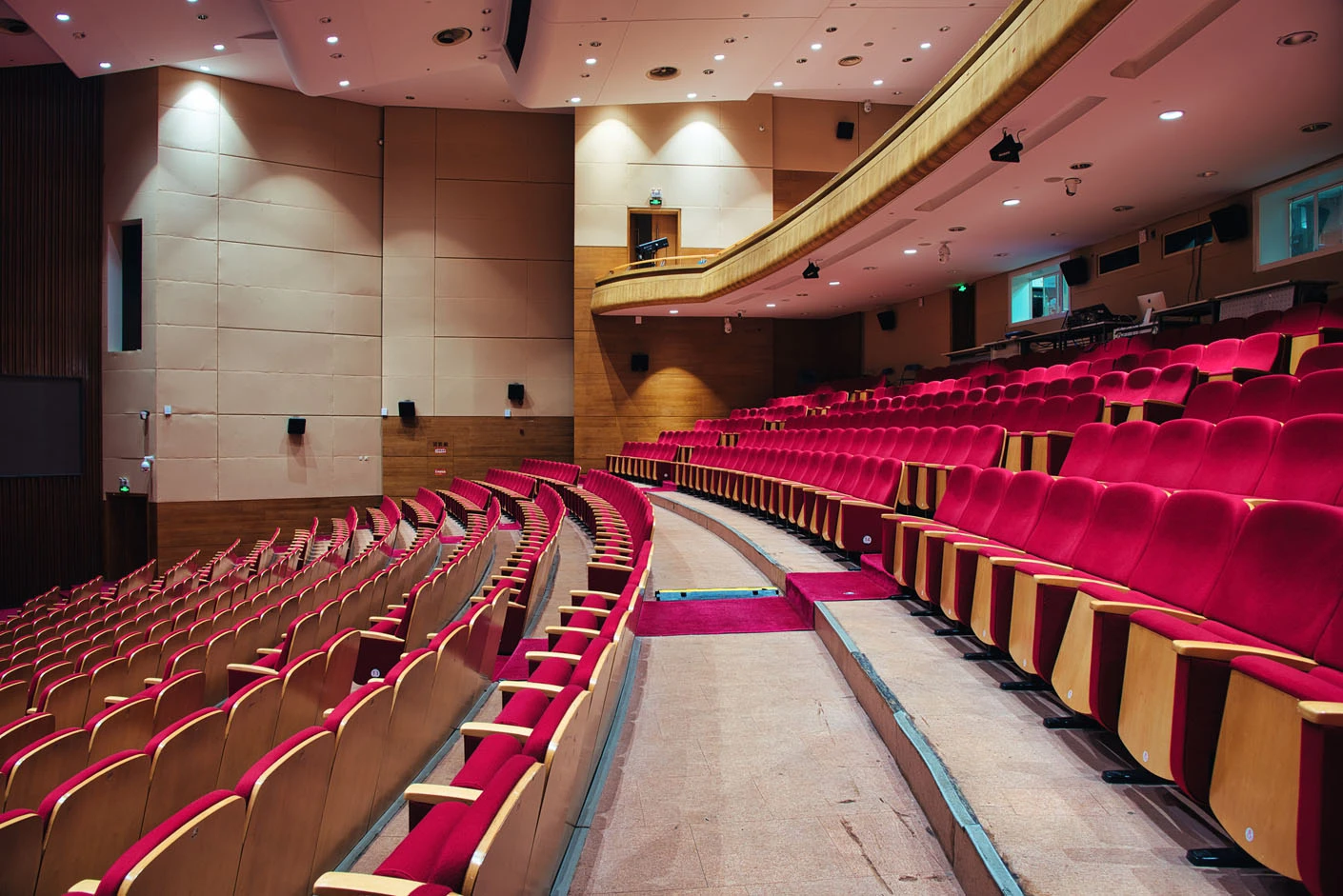 剧场内部遵循专业剧场标准打造,整体空间布局科学合理,声学环境经过专业调试,音质通透均衡,可充分满足话剧、音乐会、歌舞剧等不同艺术形式的听觉呈现需求。舞台上方配备先进的灯光升降设备,搭载全套专业灯光音响系统,可精准营造多元舞台氛围,保障演出效果的完美呈现。同时,剧场配备两架大型多媒体投影设备、专业射灯以及中央空调系统,从视觉、听觉、体感等多方面,为各类演出与活动提供全方位、高品质的技术支撑。