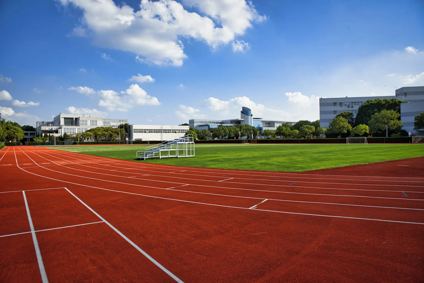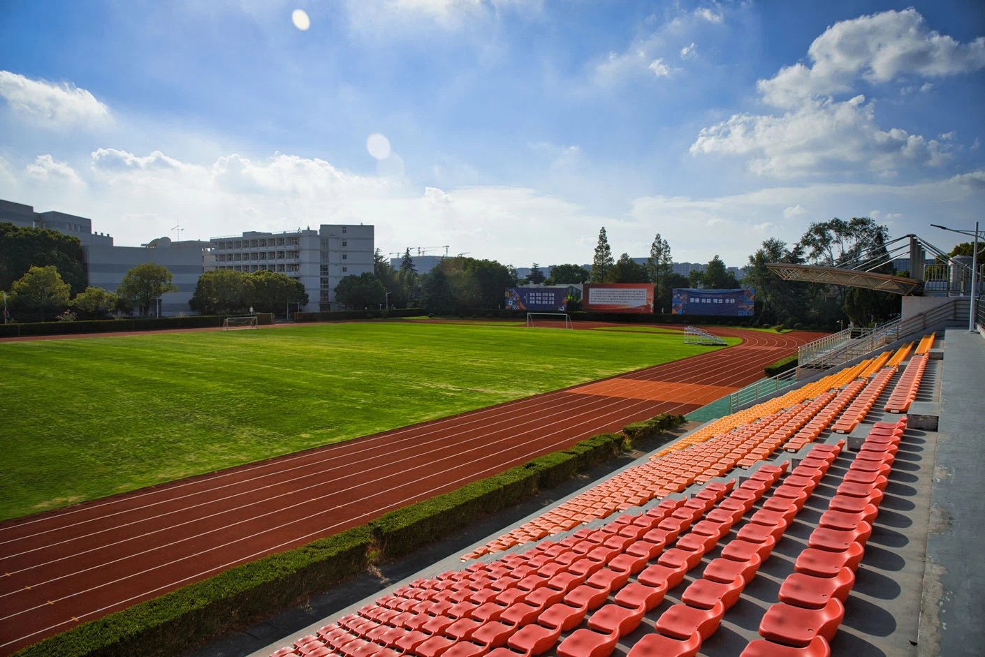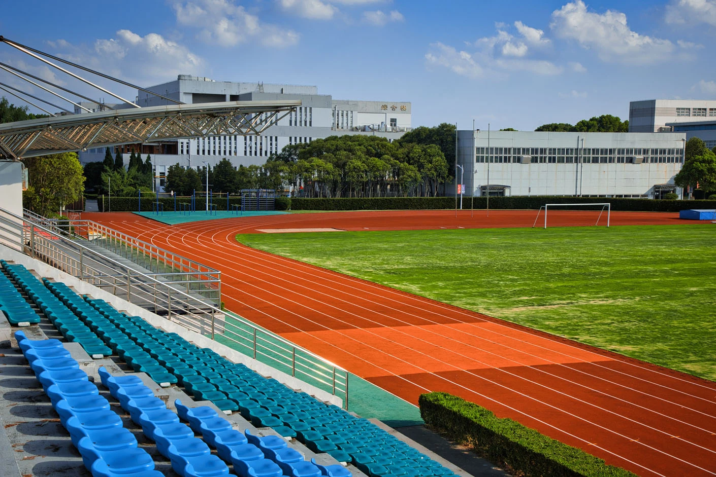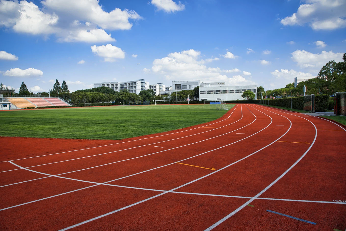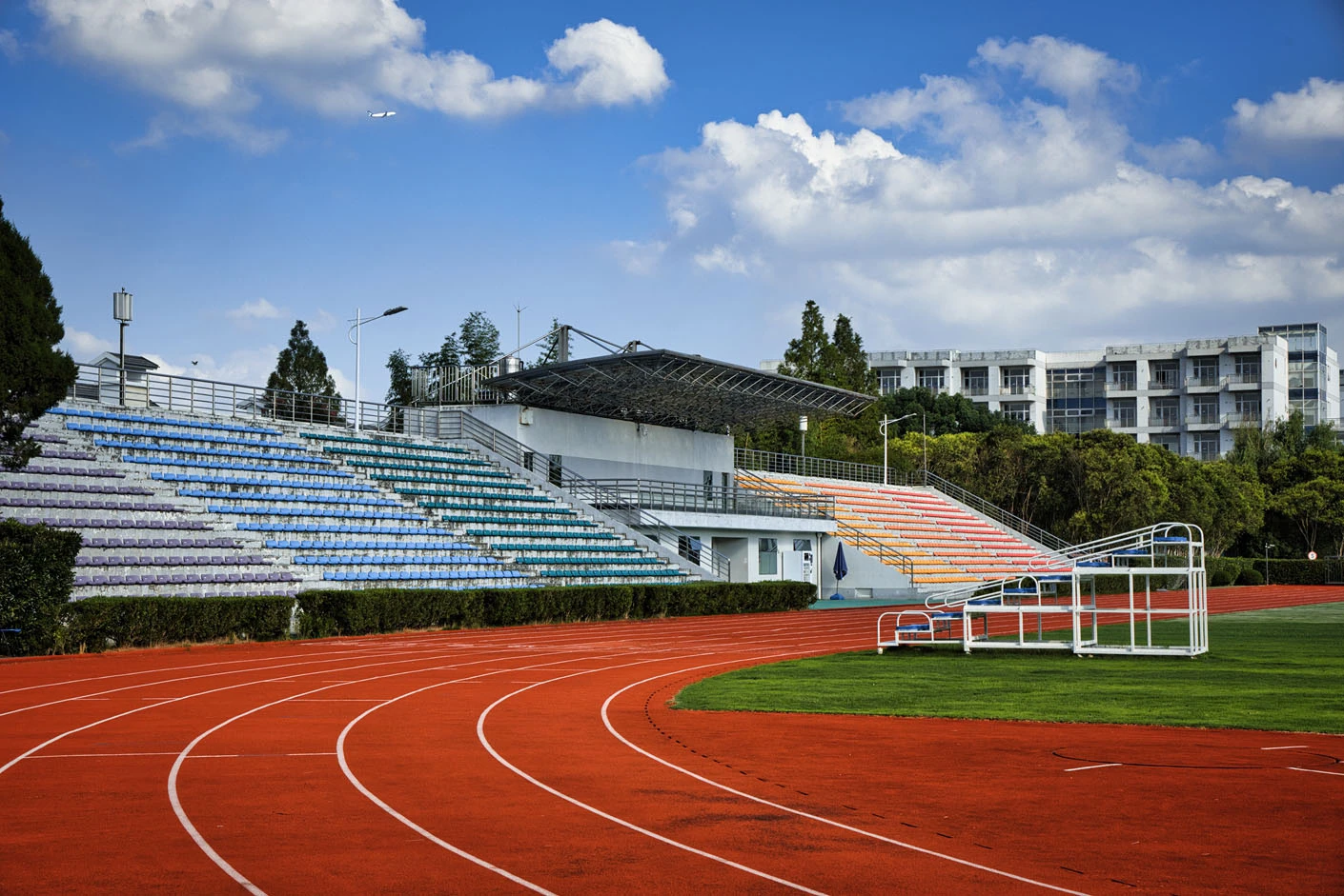 体育场采用标准400米田径场专业设计,配备专业塑胶跑道与真草草坪足球场,场地参数与建设标准完全符合专业教学与训练要求。场地设有1440座固定看台,同时配备专属主席台与专业照明系统,充分保障各类体育赛事、大型集会活动的顺利开展,场内还设有完善的更衣室和器材存储间等配套空间,为所有使用者提供全方位的便利服务。