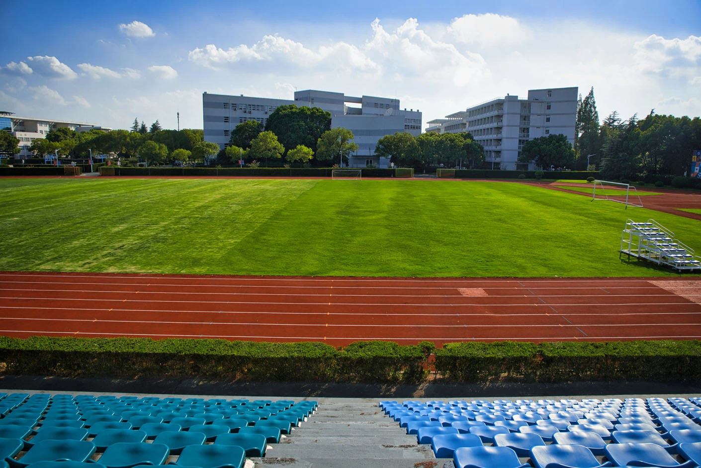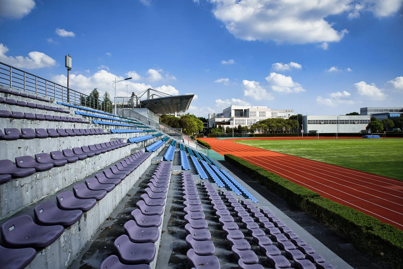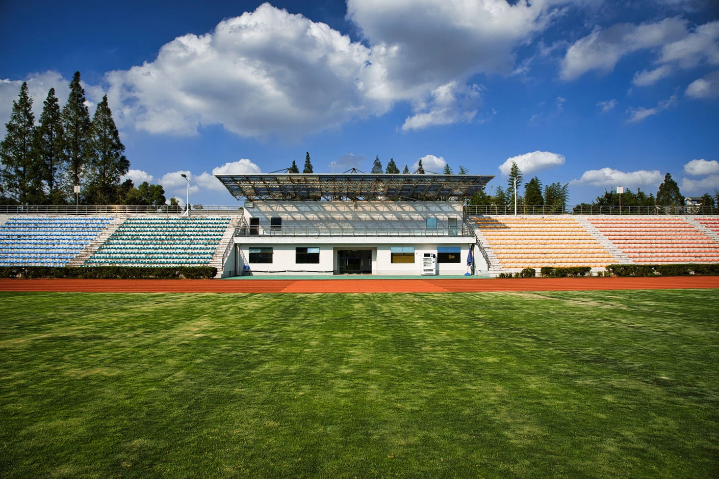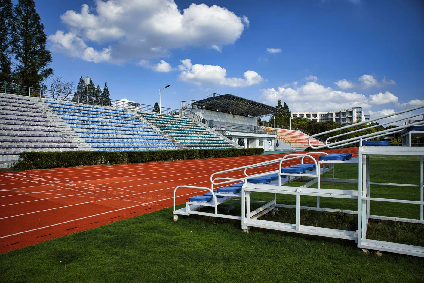 体育场采用标准400米田径场专业设计,配备专业塑胶跑道与真草草坪足球场,场地参数与建设标准完全符合专业教学与训练要求。场地设有1440座固定看台,同时配备专属主席台与专业照明系统,充分保障各类体育赛事、大型集会活动的顺利开展,场内还设有完善的更衣室和器材存储间等配套空间,为所有使用者提供全方位的便利服务。