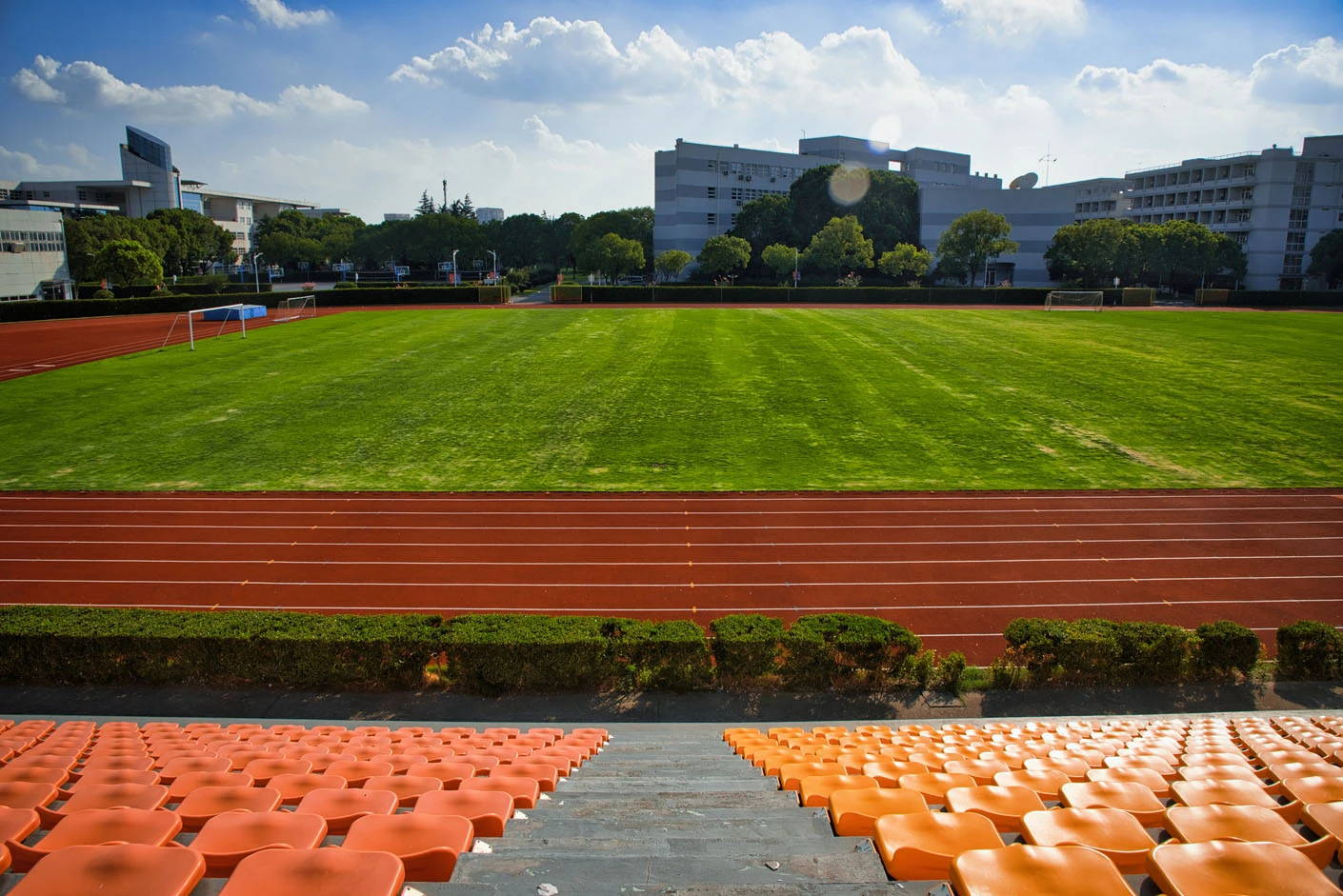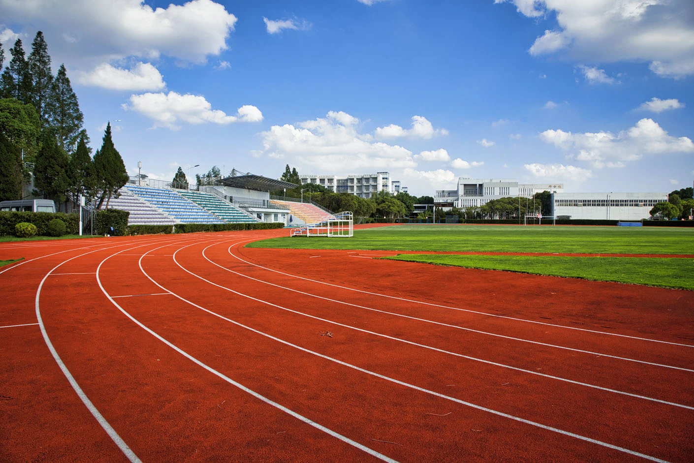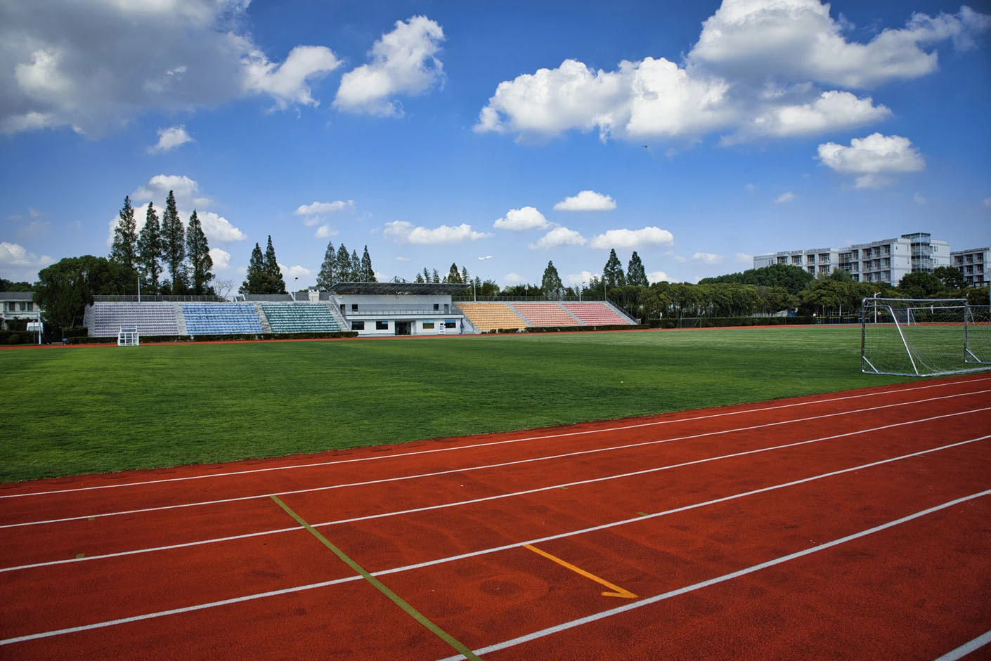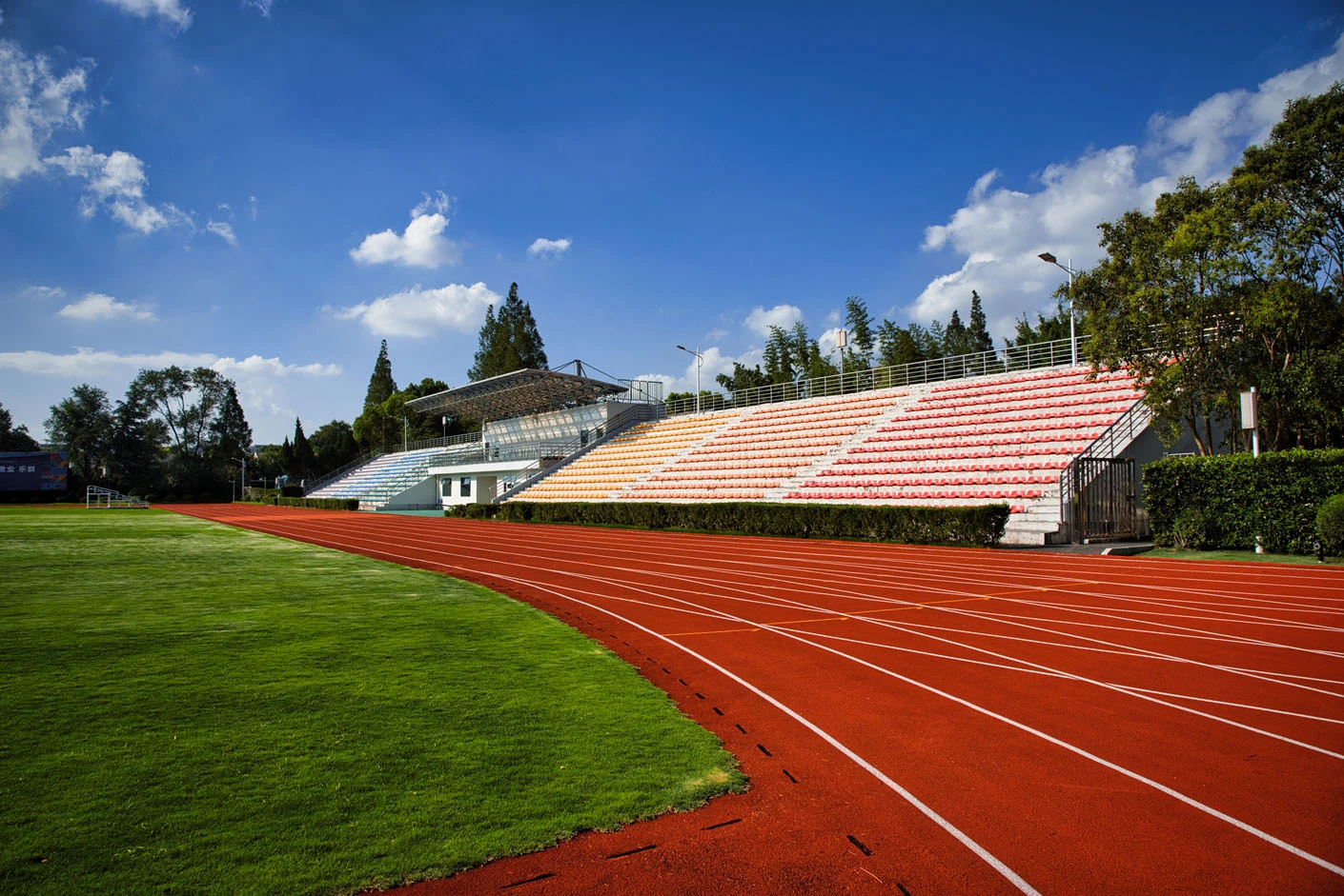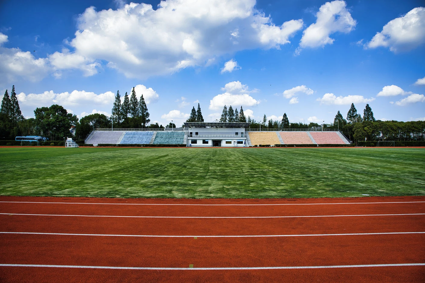 体育场采用标准400米田径场专业设计,配备专业塑胶跑道与真草草坪足球场,场地参数与建设标准完全符合专业教学与训练要求。场地设有1440座固定看台,同时配备专属主席台与专业照明系统,充分保障各类体育赛事、大型集会活动的顺利开展,场内还设有完善的更衣室和器材存储间等配套空间,为所有使用者提供全方位的便利服务。