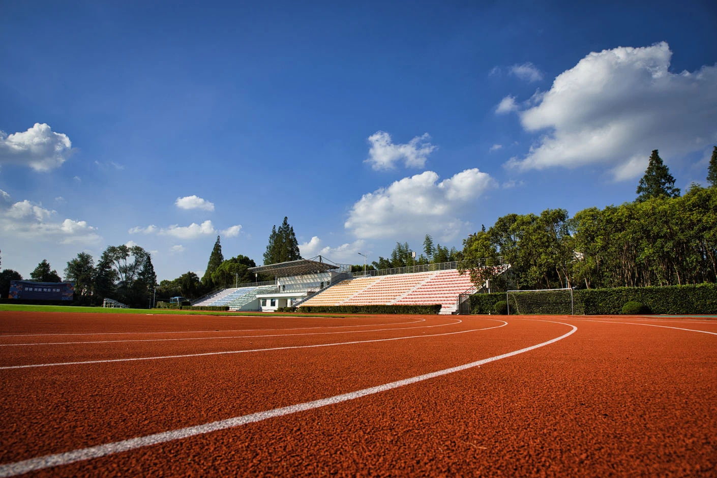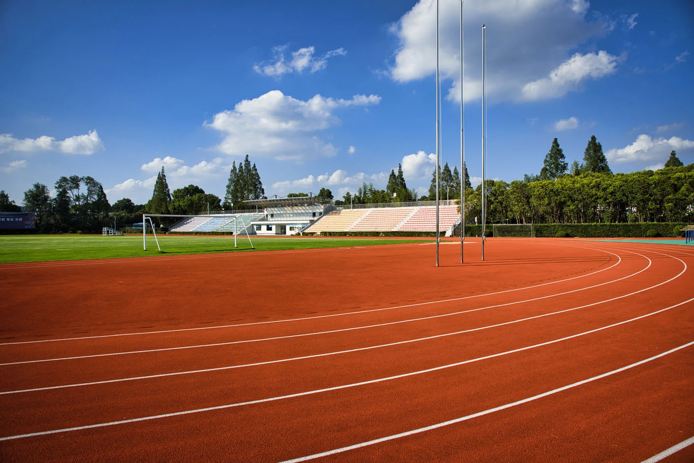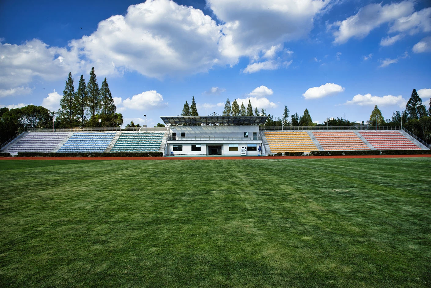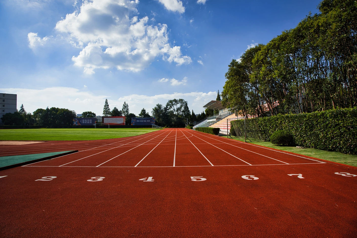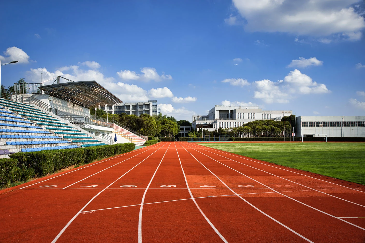 体育场采用标准400米田径场专业设计,配备专业塑胶跑道与真草草坪足球场,场地参数与建设标准完全符合专业教学与训练要求。场地设有1440座固定看台,同时配备专属主席台与专业照明系统,充分保障各类体育赛事、大型集会活动的顺利开展,场内还设有完善的更衣室和器材存储间等配套空间,为所有使用者提供全方位的便利服务。