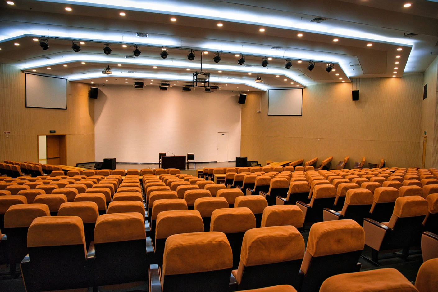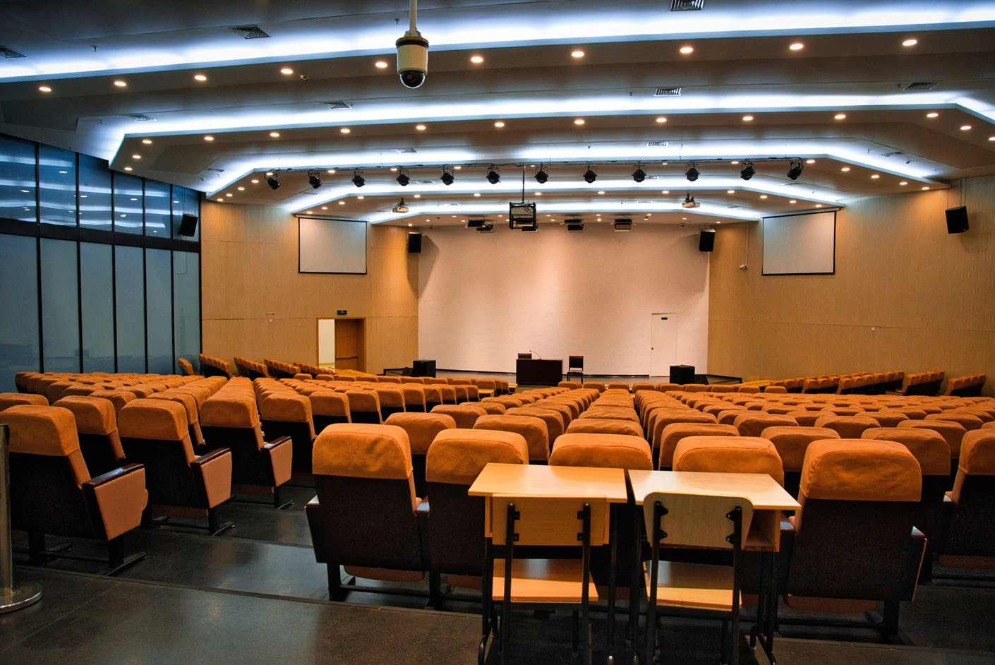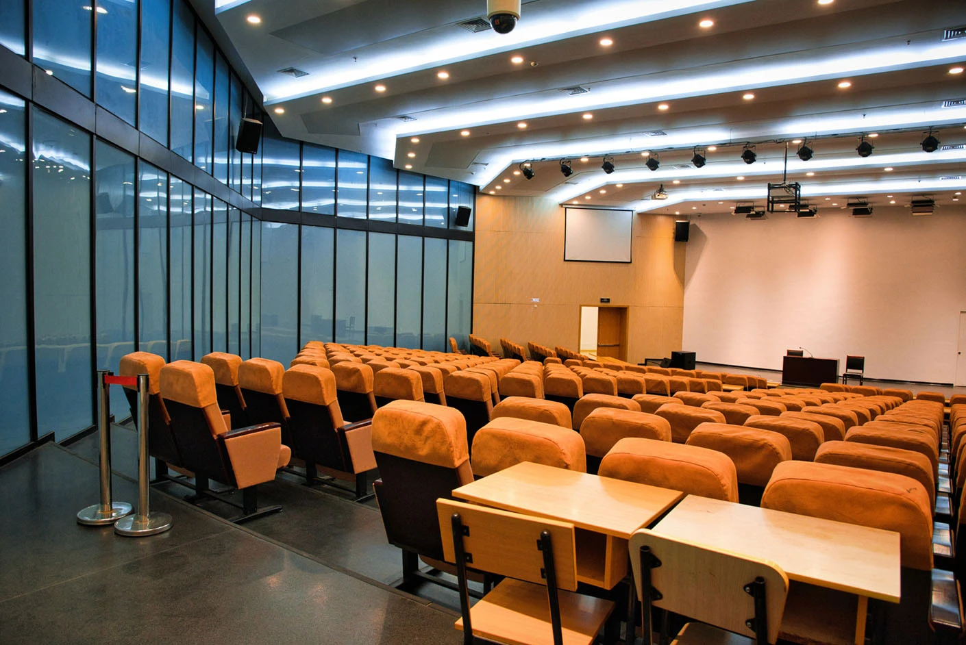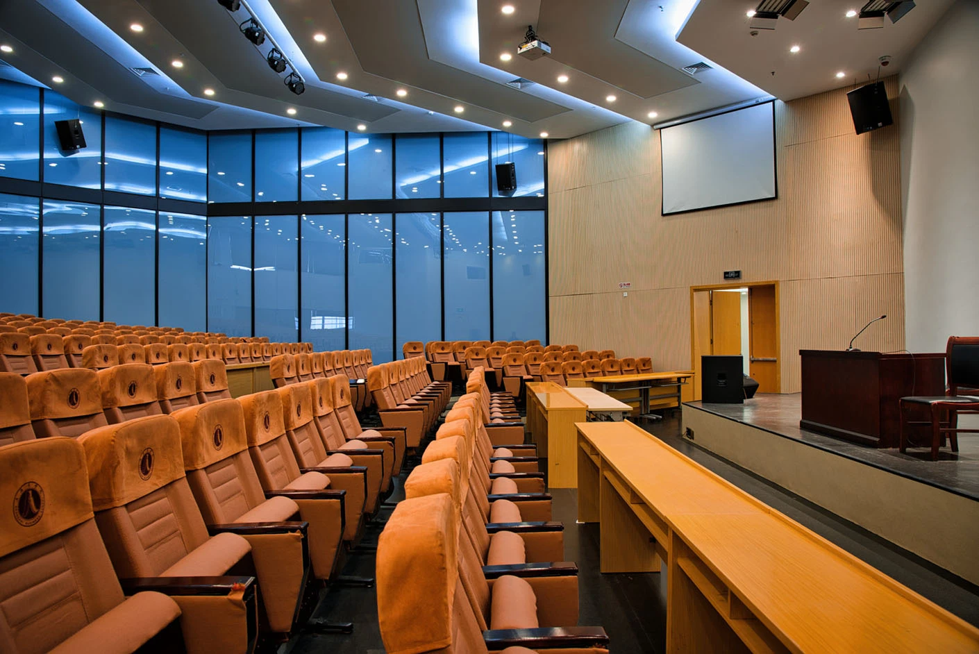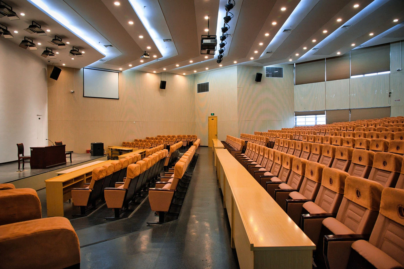 报告厅按照大型专业报告厅标准规划设计,整体空间开阔大气,设有398个专业座位,座位排布科学规整、坡度合理,确保每一位参会者都能拥有清晰的现场视野与舒适的就座体验。场地配备3套高清投影系统,包含主投影幕布及辅助显示设备,搭配专业桌麦与标准演讲台,全方位满足大型会议、学术报告、成果展示等场景的视听与发言需求,保障活动呈现效果专业稳定。室内配备完善的中央空调系统,可实现全域温度精准调控,无论季节更替,都能始终维持舒适宜人的场内环境,为长时间会议与活动开展提供优质保障。