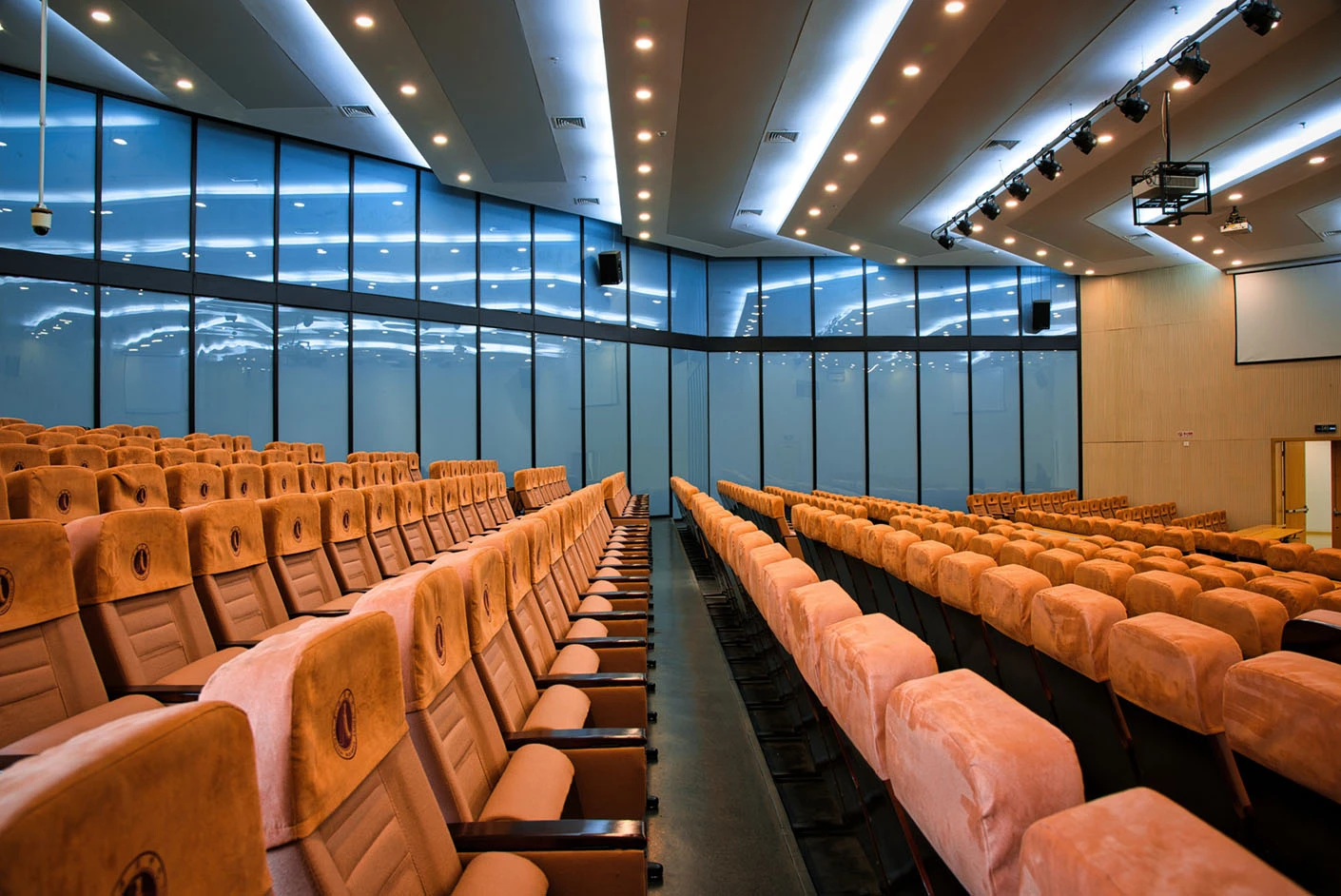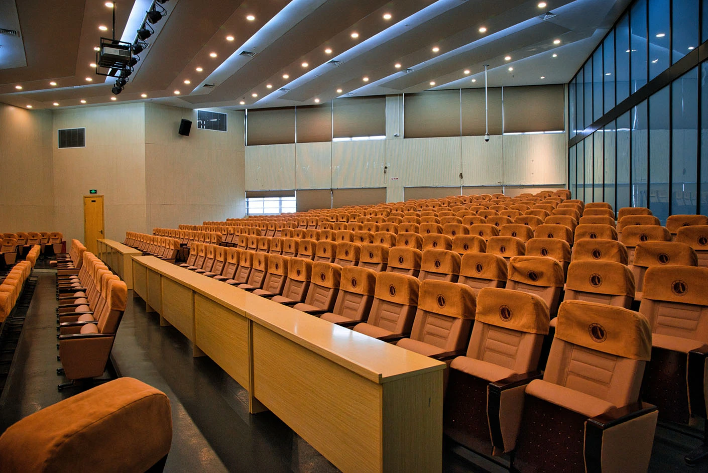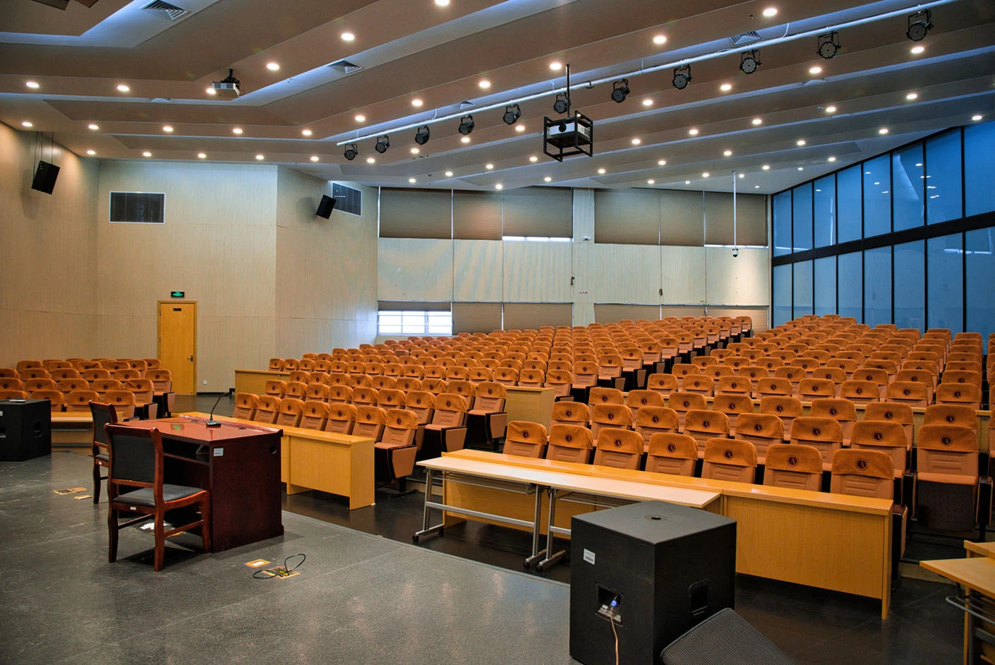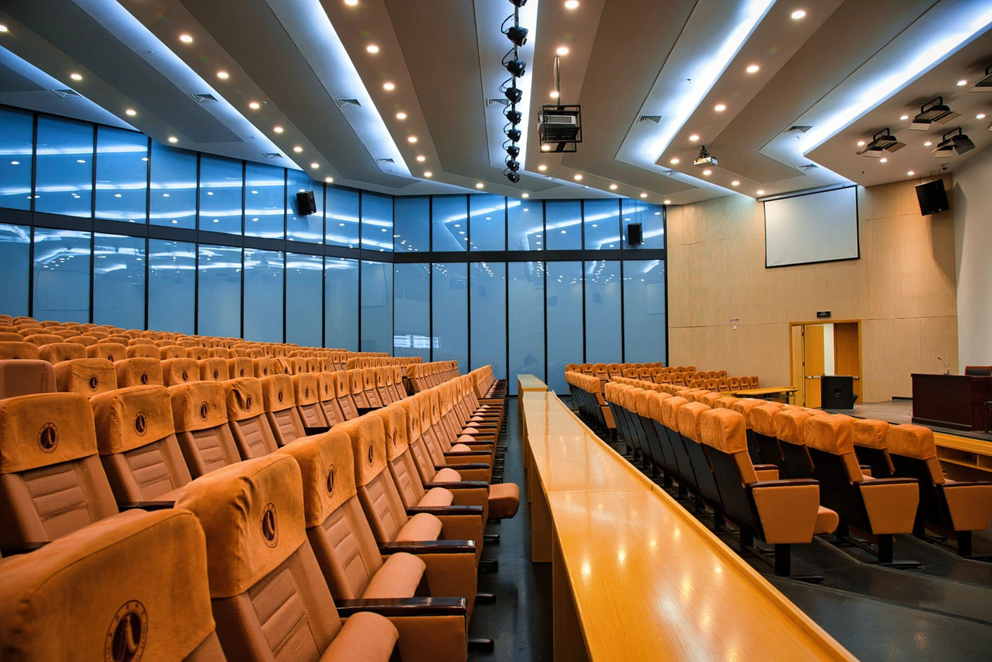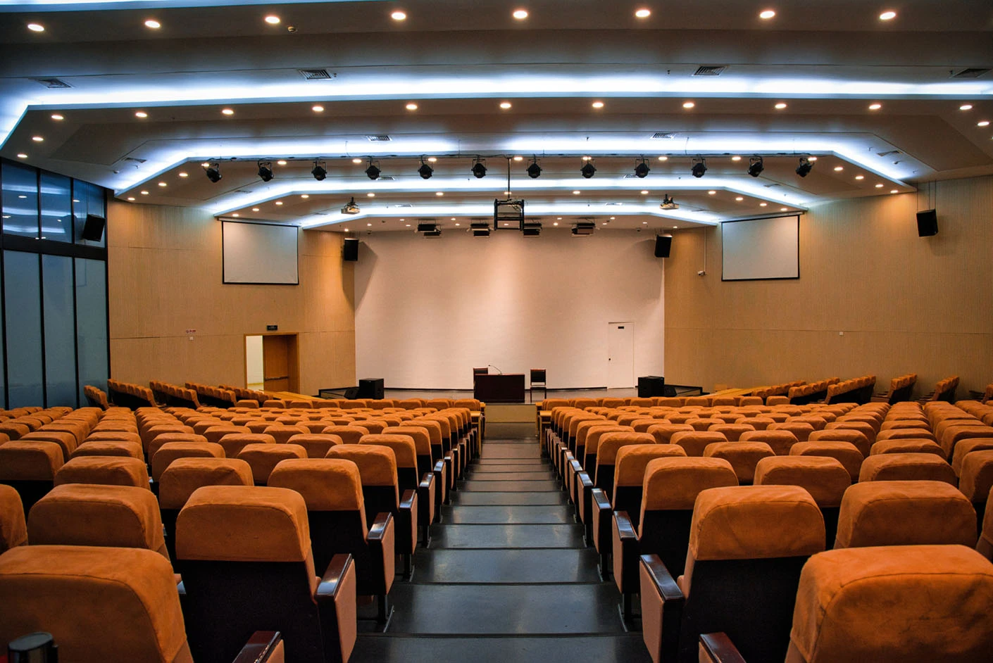 报告厅按照大型专业报告厅标准规划设计,整体空间开阔大气,设有398个专业座位,座位排布科学规整、坡度合理,确保每一位参会者都能拥有清晰的现场视野与舒适的就座体验。场地配备3套高清投影系统,包含主投影幕布及辅助显示设备,搭配专业桌麦与标准演讲台,全方位满足大型会议、学术报告、成果展示等场景的视听与发言需求,保障活动呈现效果专业稳定。室内配备完善的中央空调系统,可实现全域温度精准调控,无论季节更替,都能始终维持舒适宜人的场内环境,为长时间会议与活动开展提供优质保障。