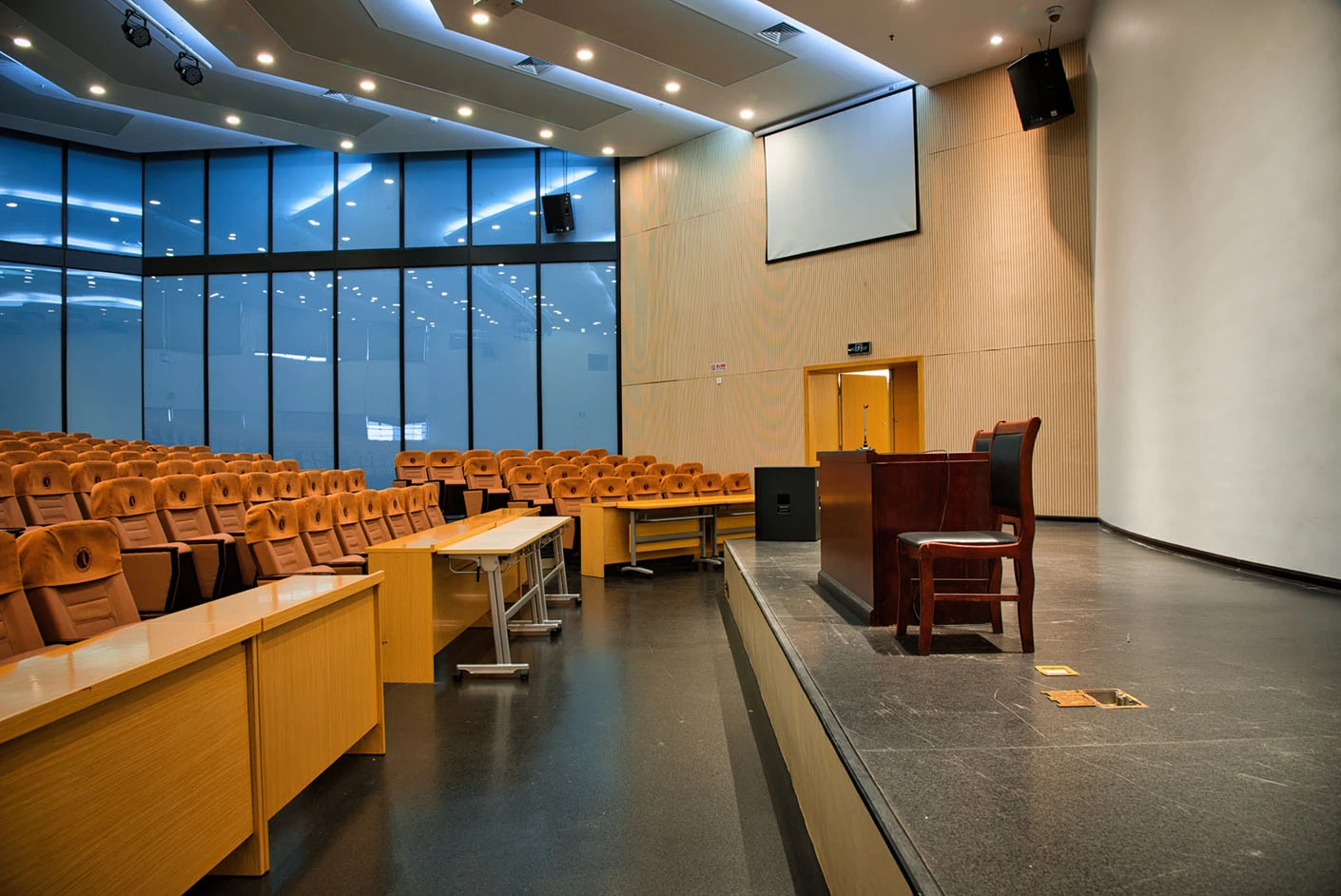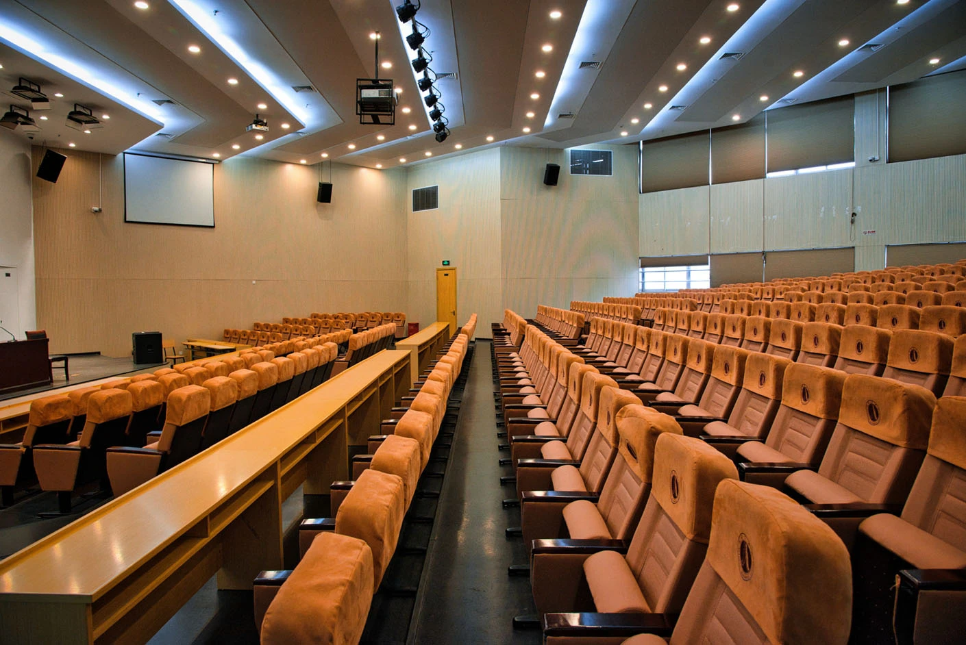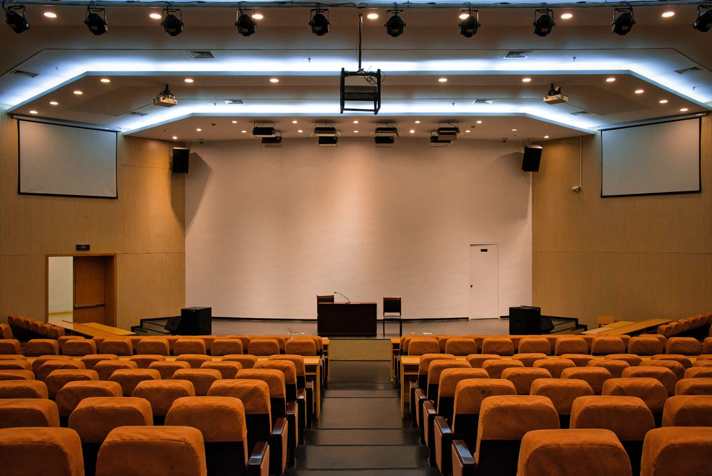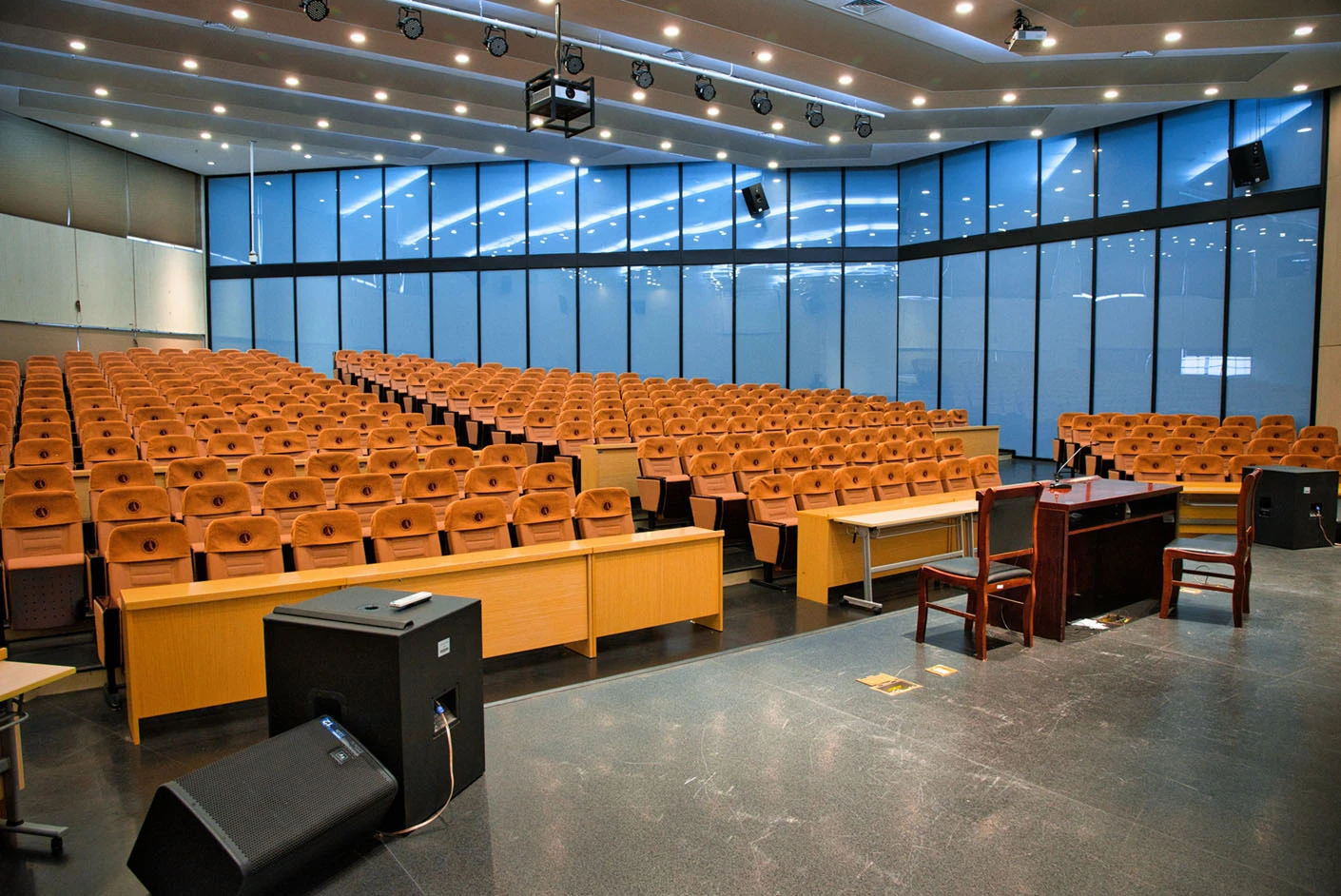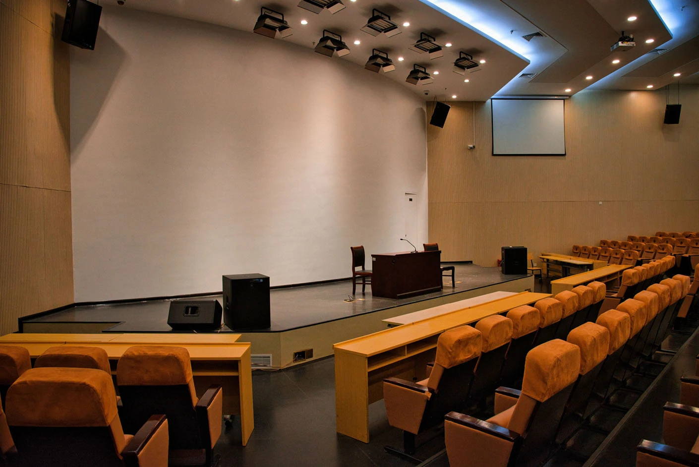 报告厅按照大型专业报告厅标准规划设计,整体空间开阔大气,设有398个专业座位,座位排布科学规整、坡度合理,确保每一位参会者都能拥有清晰的现场视野与舒适的就座体验。场地配备3套高清投影系统,包含主投影幕布及辅助显示设备,搭配专业桌麦与标准演讲台,全方位满足大型会议、学术报告、成果展示等场景的视听与发言需求,保障活动呈现效果专业稳定。室内配备完善的中央空调系统,可实现全域温度精准调控,无论季节更替,都能始终维持舒适宜人的场内环境,为长时间会议与活动开展提供优质保障。