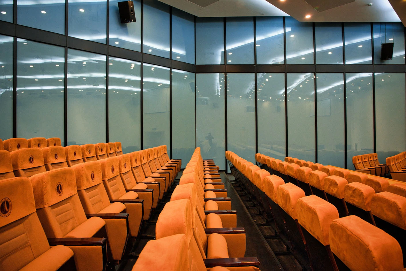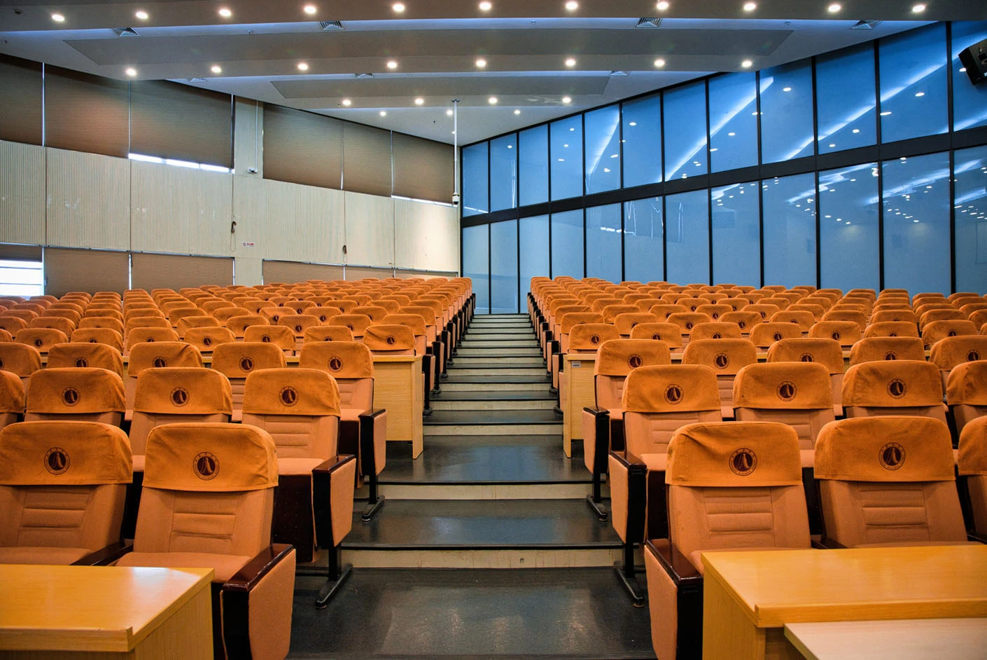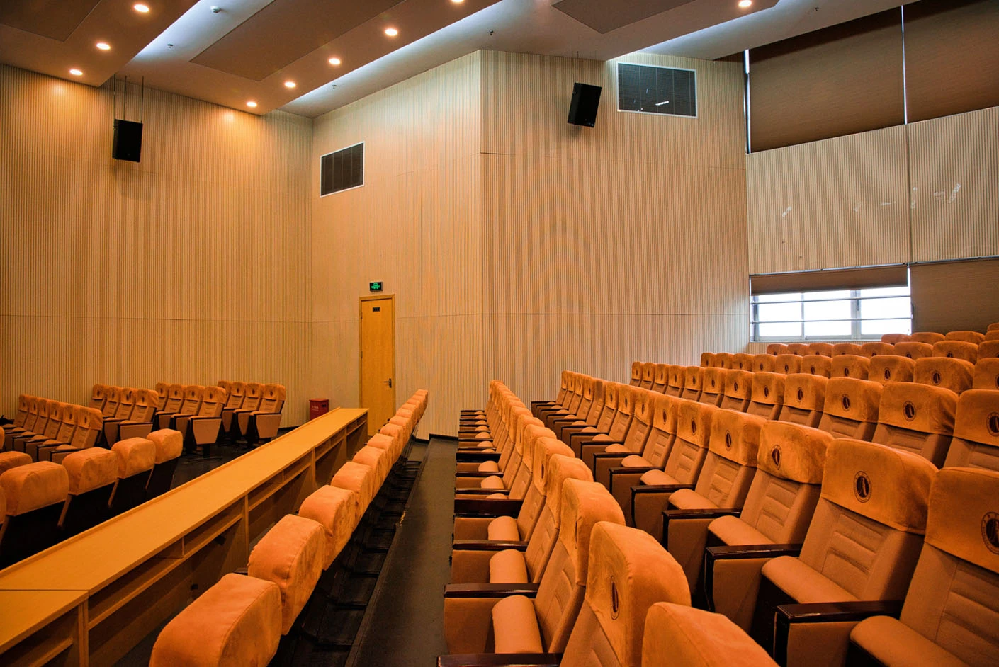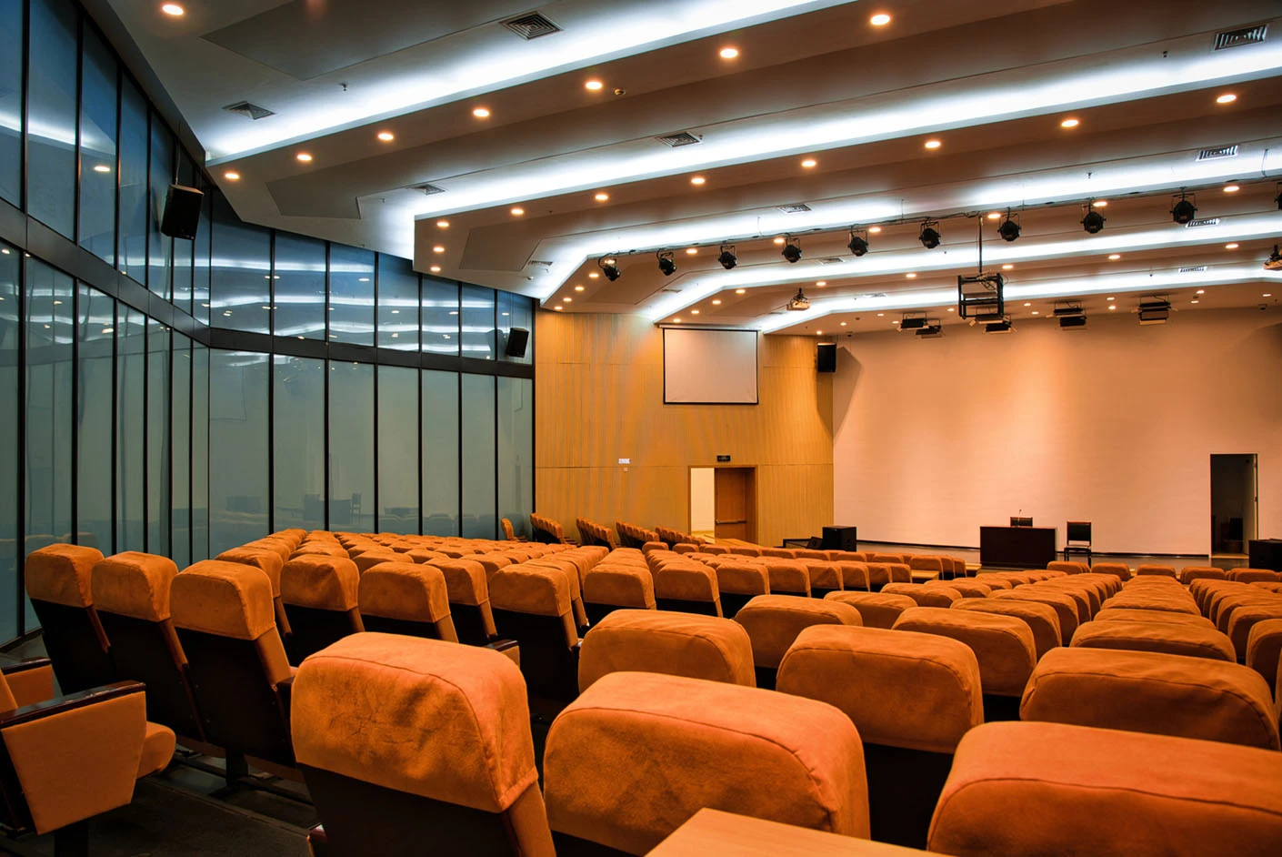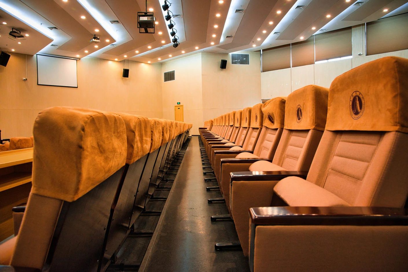 报告厅按照大型专业报告厅标准规划设计,整体空间开阔大气,设有398个专业座位,座位排布科学规整、坡度合理,确保每一位参会者都能拥有清晰的现场视野与舒适的就座体验。场地配备3套高清投影系统,包含主投影幕布及辅助显示设备,搭配专业桌麦与标准演讲台,全方位满足大型会议、学术报告、成果展示等场景的视听与发言需求,保障活动呈现效果专业稳定。室内配备完善的中央空调系统,可实现全域温度精准调控,无论季节更替,都能始终维持舒适宜人的场内环境,为长时间会议与活动开展提供优质保障。