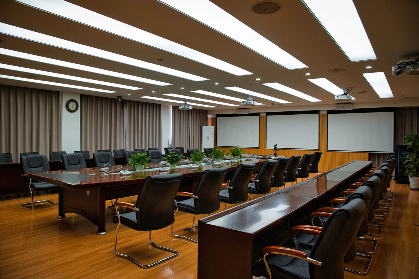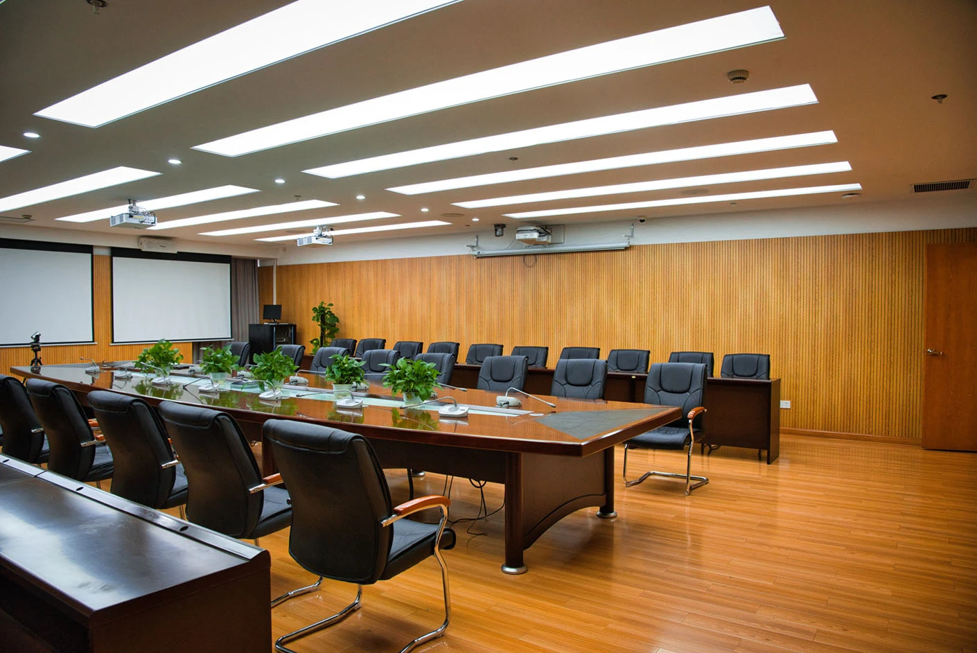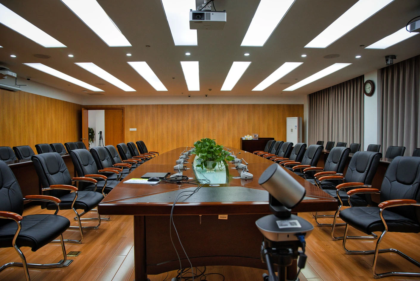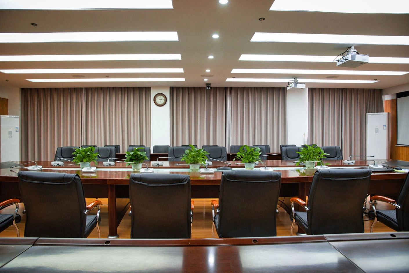 1504会议室采用创新的双圈圆桌式布局,空间设计科学考究,兼顾会议的平等性、互动性与容纳量,整体配备40个舒适专业会议座位,以内圈16座、外圈24座的分层形式排布,既保留圆桌会议无主次、易交流的核心优势,又能满足中型规模会议的列席需求,所有席位均拥有清晰视野与良好参与感,空间动线流畅,氛围庄重而不失亲和。场地硬件配置先进完备,搭载3套高清投影系统,可实现多视角、多画面同步展示,完美适配方案汇报、数据演示、视频联动等多元会议场景;配套专业级音响系统与数字会议话筒,拾音精准、音质清晰,有效杜绝杂音与啸叫,保障发言与扩声效果稳定出色。全场配备智能中央空调系统,可根据使用需求自主调节温湿度,搭配整洁雅致的室内装潢与柔和照明,营造出舒适、专业、静谧的会议环境,为长时间研讨与交流提供坚实保障。