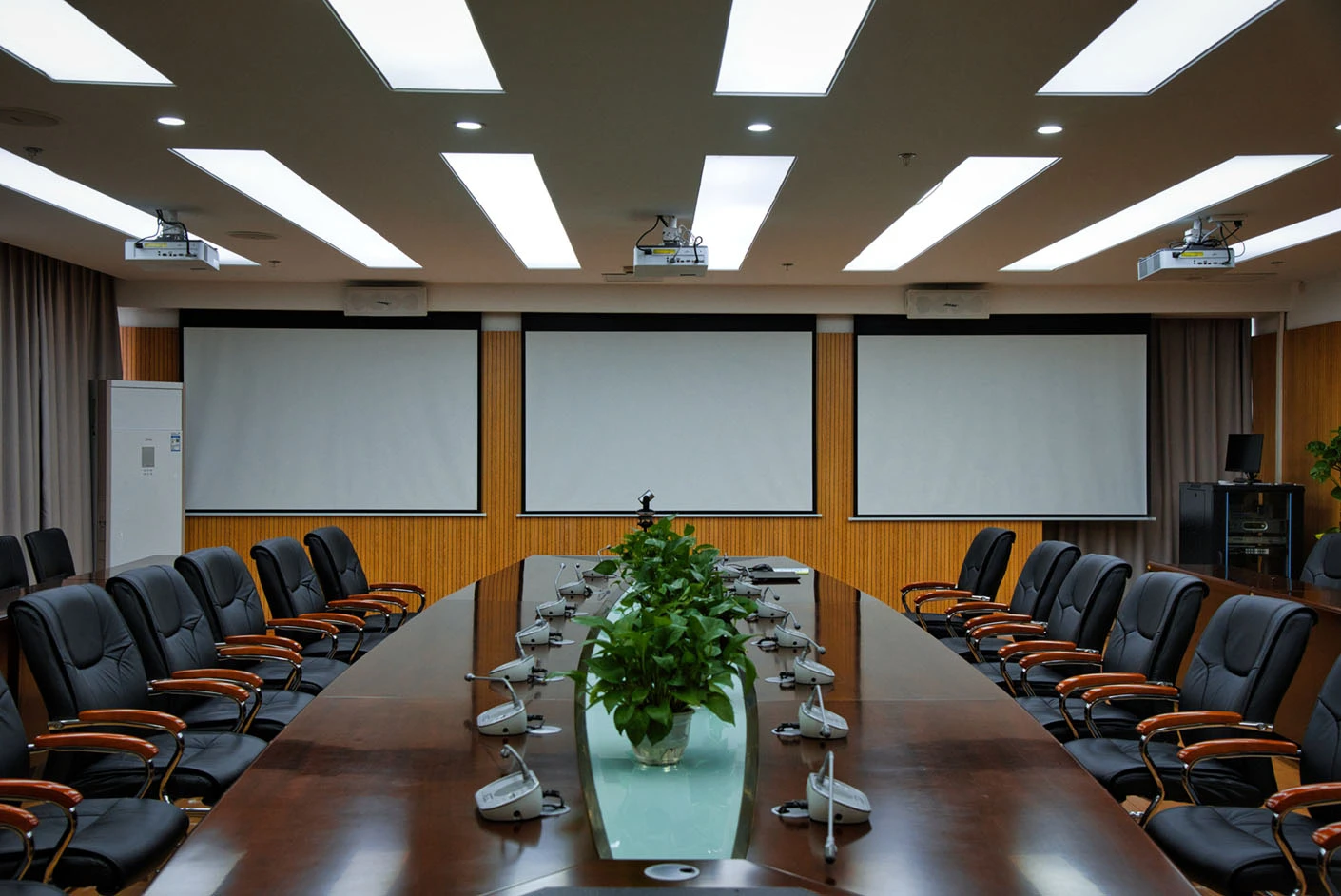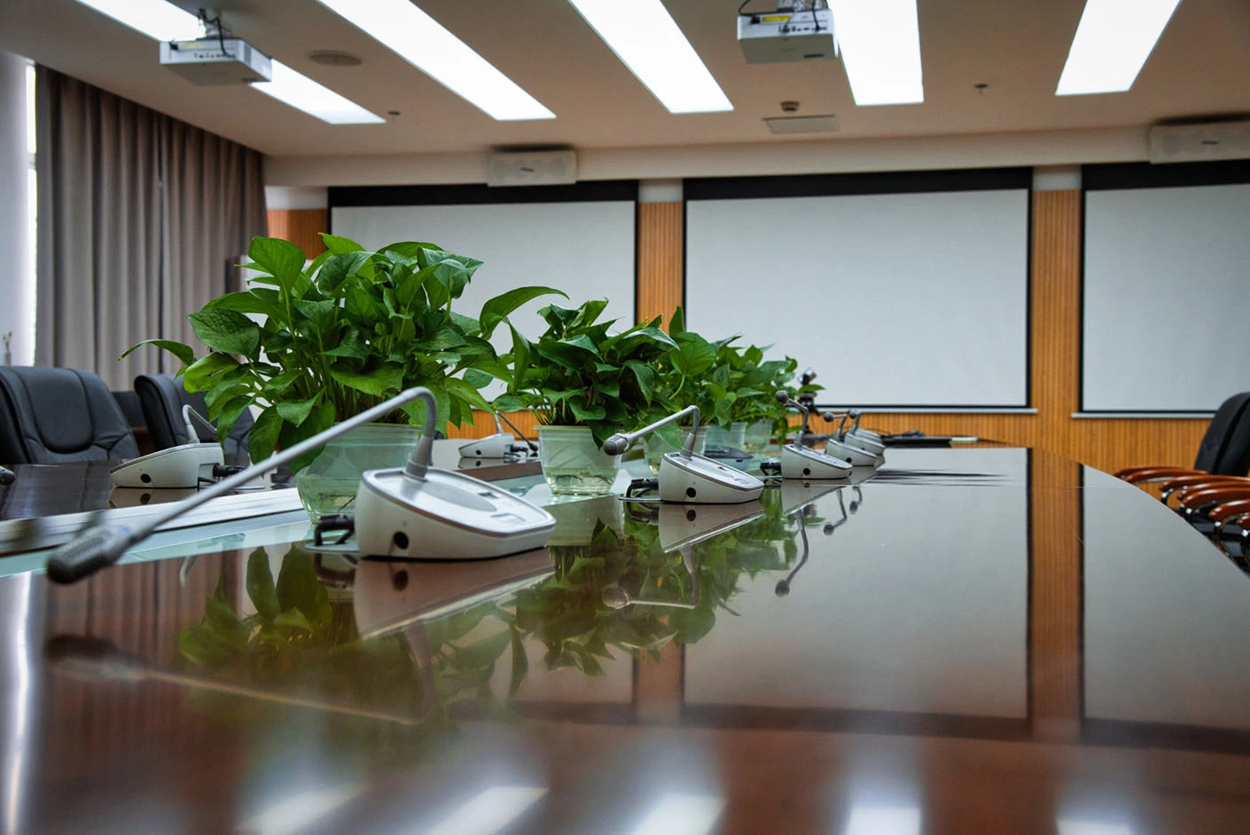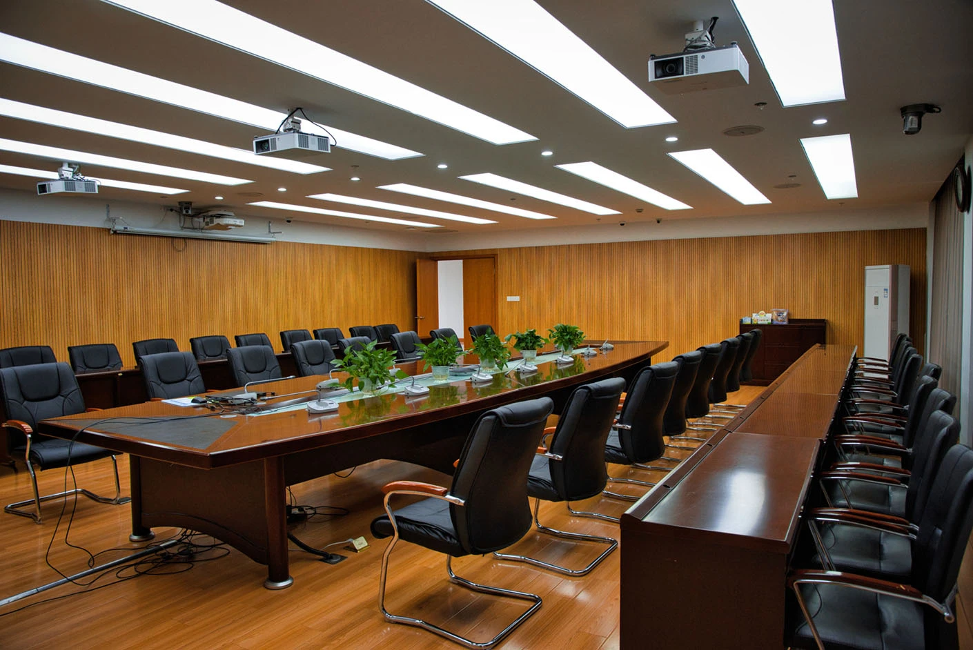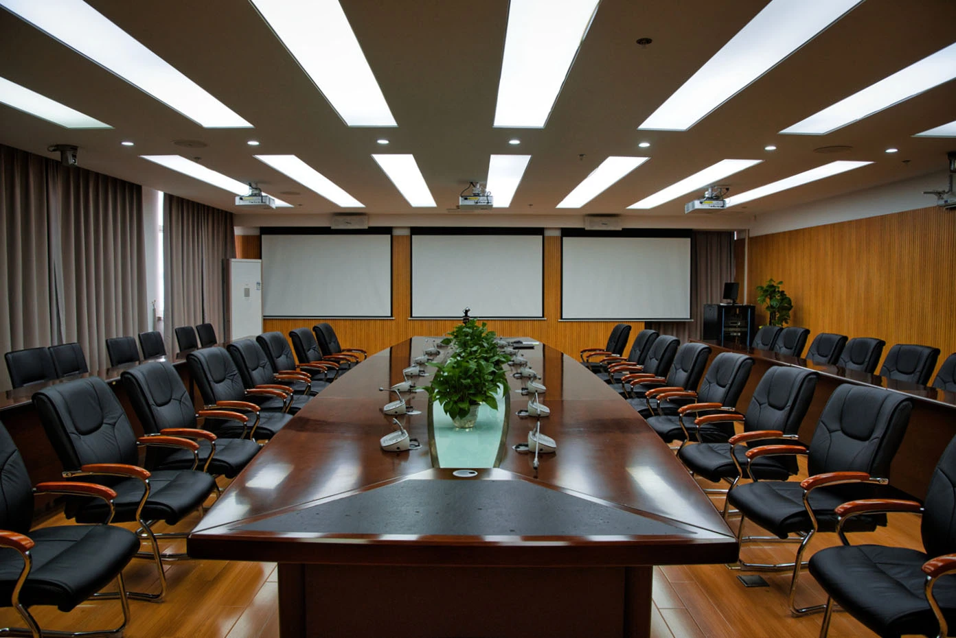 1504会议室采用创新的双圈圆桌式布局,空间设计科学考究,兼顾会议的平等性、互动性与容纳量,整体配备40个舒适专业会议座位,以内圈16座、外圈24座的分层形式排布,既保留圆桌会议无主次、易交流的核心优势,又能满足中型规模会议的列席需求,所有席位均拥有清晰视野与良好参与感,空间动线流畅,氛围庄重而不失亲和。场地硬件配置先进完备,搭载3套高清投影系统,可实现多视角、多画面同步展示,完美适配方案汇报、数据演示、视频联动等多元会议场景;配套专业级音响系统与数字会议话筒,拾音精准、音质清晰,有效杜绝杂音与啸叫,保障发言与扩声效果稳定出色。全场配备智能中央空调系统,可根据使用需求自主调节温湿度,搭配整洁雅致的室内装潢与柔和照明,营造出舒适、专业、静谧的会议环境,为长时间研讨与交流提供坚实保障。