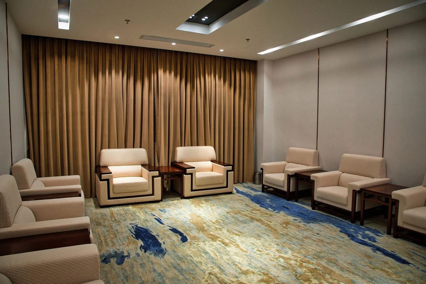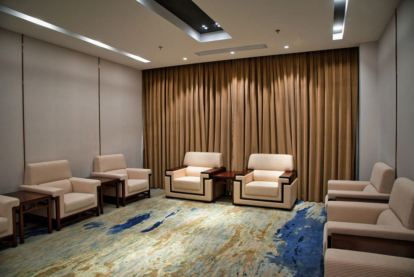 贵宾室秉持高端、雅致、实用的设计理念,采用专业化空间规划与精细化软装布置,整体风格庄重典雅、格调大气,既彰显高校的人文底蕴,又契合商务接待的正式氛围。室内配置8个舒适沙发座位,选用高品质面料与人体工学设计,兼顾坐感舒适度与视觉质感,空间布局疏密得当,科学划分交流区域与休憩区域,充分平衡会晤的私密性与交流的开放性,为重要嘉宾接待、高端洽谈对话营造出静谧、舒适、专业的理想环境。室内装饰细节考究,陈设简约而不失质感,色调柔和雅致,每一处设计都充分体现学校深厚的文化内涵与高标准的服务水准,让到访者在舒适的氛围中感受专业与尊重。