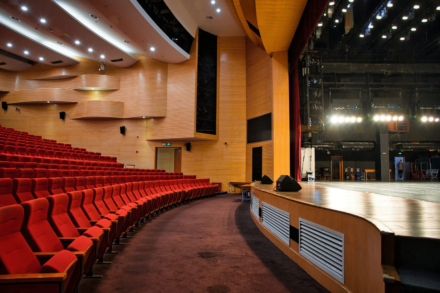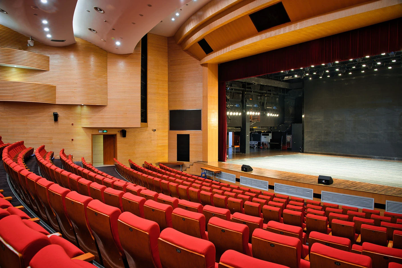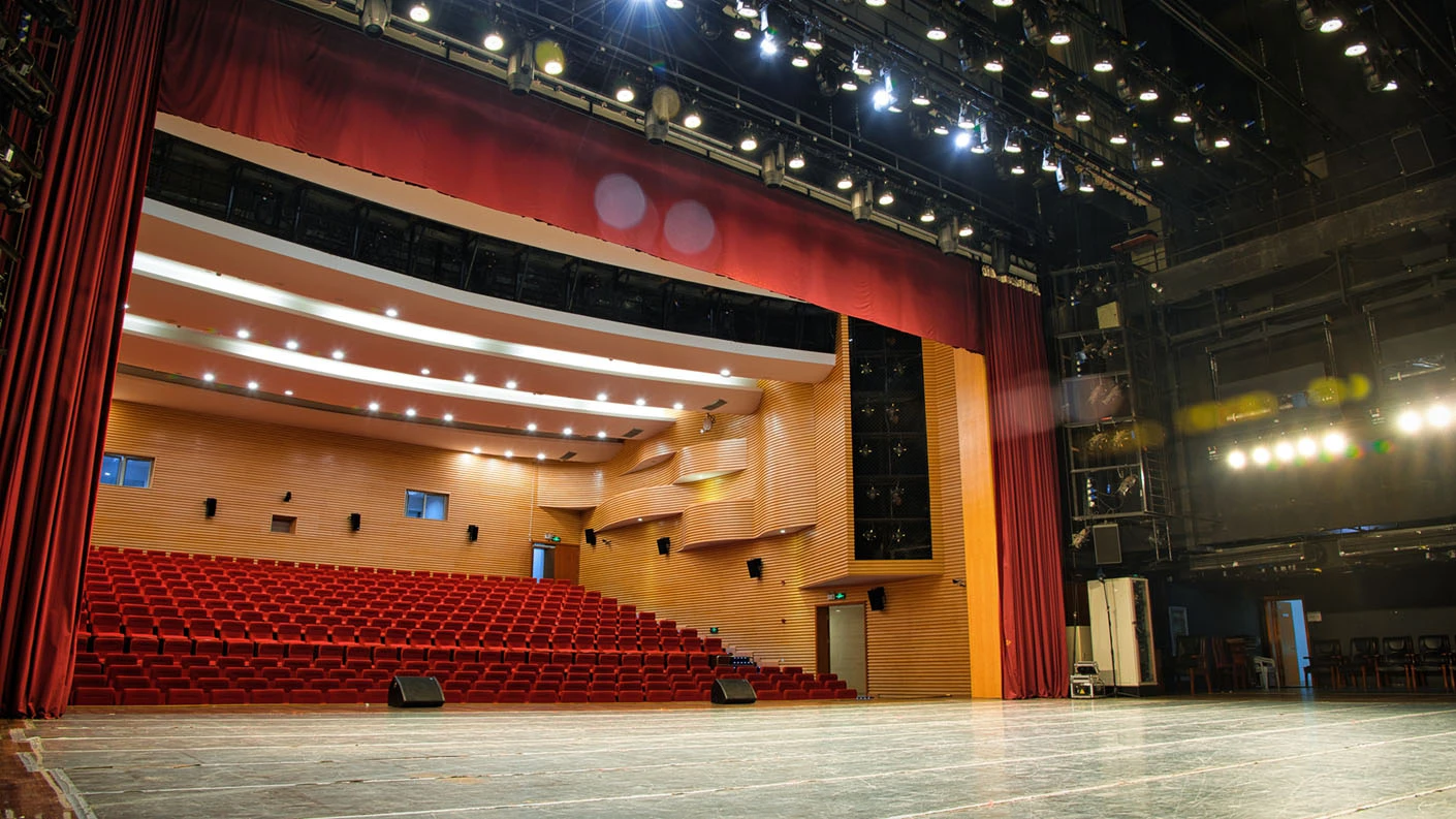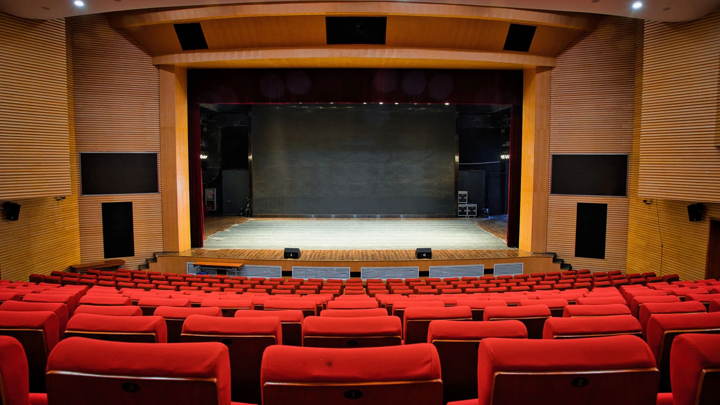 剧场舞台按照专业演出标准打造,硬件设施完备精良,台口宽13.7米、高7.4米,舞台纵深达11米,尺寸规格完全适配话剧、戏曲、歌舞、音乐会等各类专业演出需求。灯光系统配置先进,涵盖40台光束灯、100台LED染色灯及4台切割灯,可根据活动主题精准塑造舞台光影层次,呈现丰富多元的舞台效果。舞台正中搭载12.6×7.3米的大型高清LED显示屏,色彩还原度高、显示清晰,为演出、会议、发布会提供震撼的视觉载体;搭配专业级音响系统,经过声学优化设计,确保声音传输均匀、音质清晰饱满,全方位保障每场活动的视听效果。