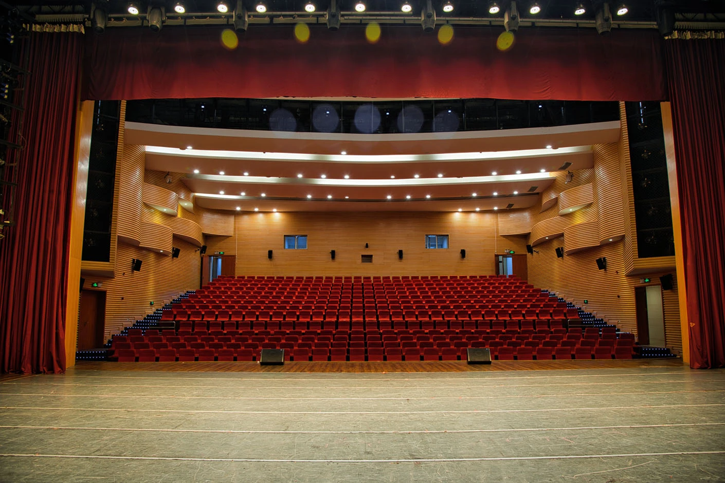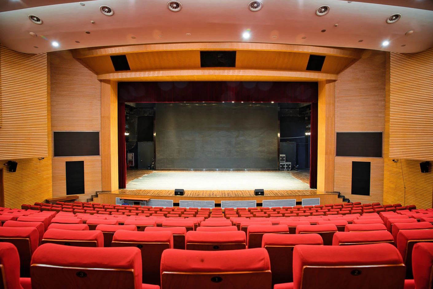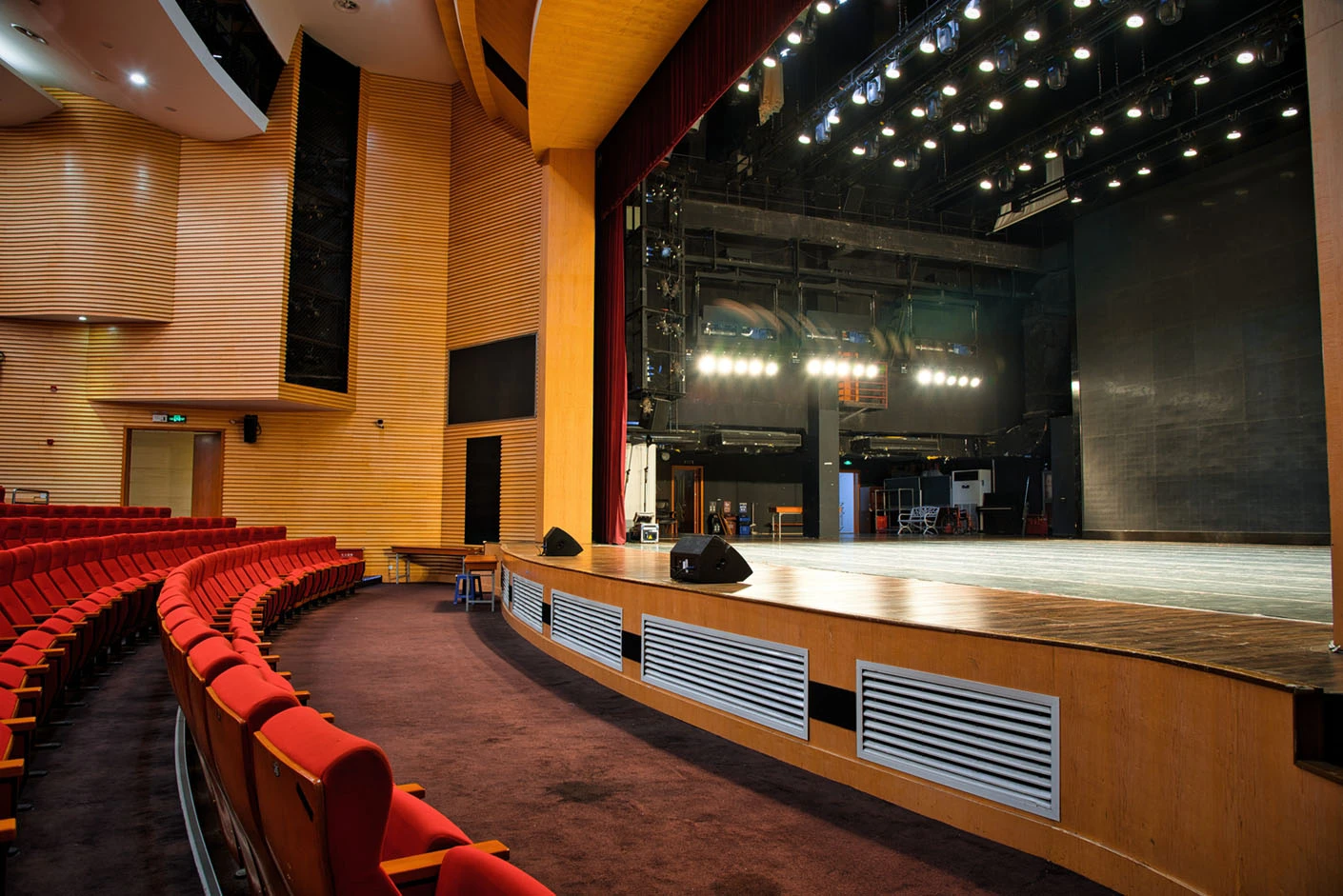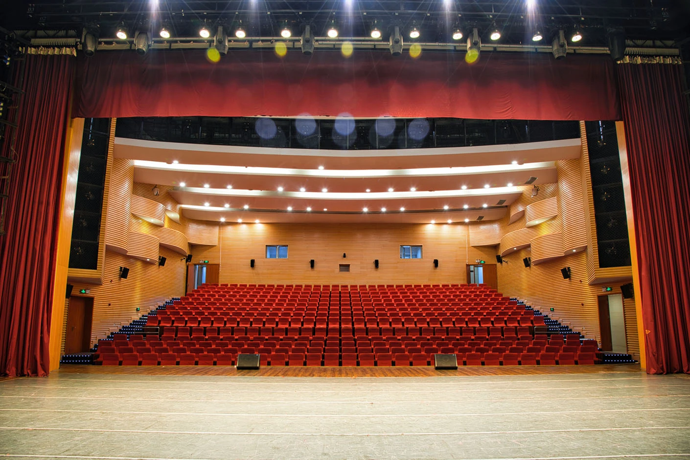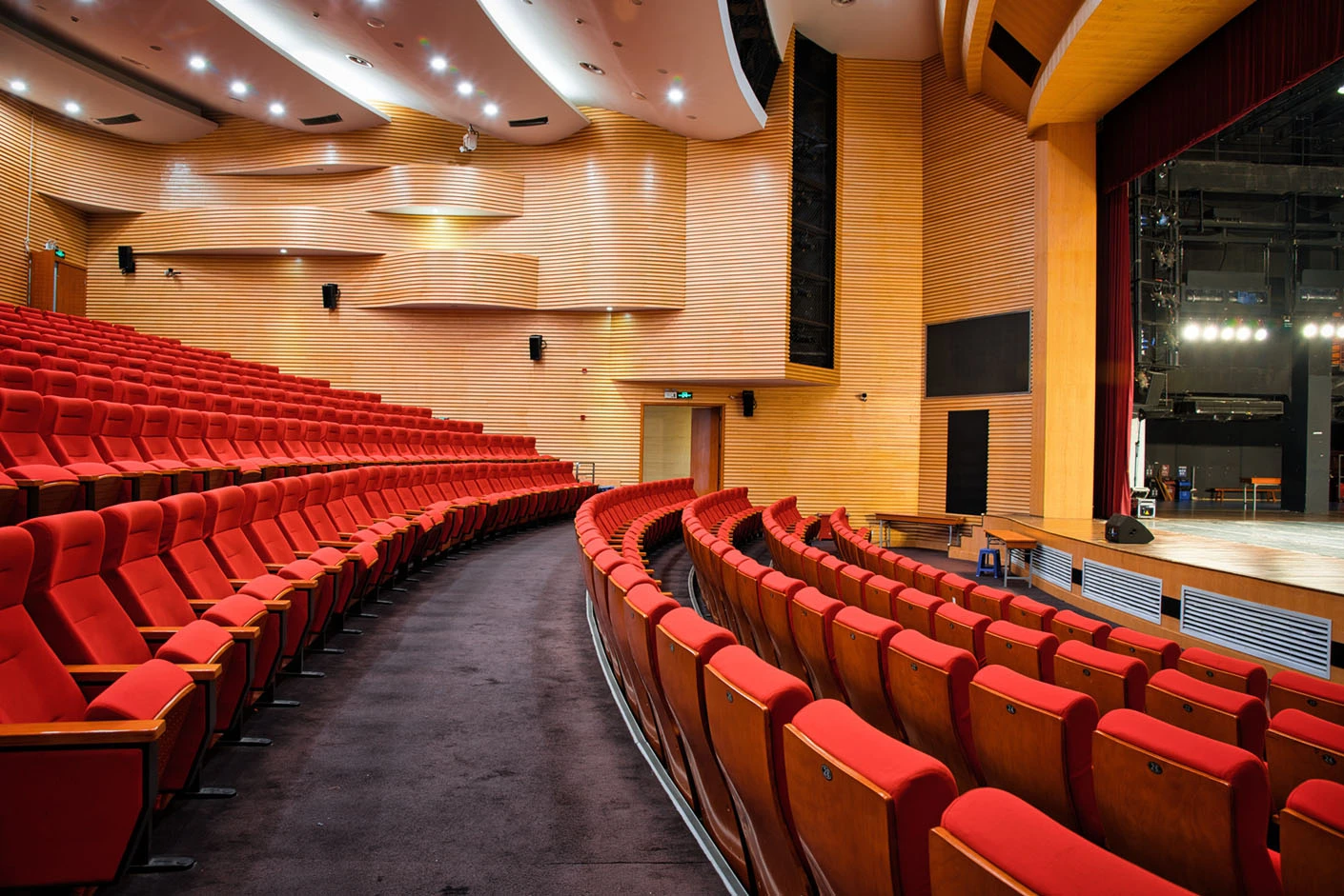 剧场舞台按照专业演出标准打造,硬件设施完备精良,台口宽13.7米、高7.4米,舞台纵深达11米,尺寸规格完全适配话剧、戏曲、歌舞、音乐会等各类专业演出需求。灯光系统配置先进,涵盖40台光束灯、100台LED染色灯及4台切割灯,可根据活动主题精准塑造舞台光影层次,呈现丰富多元的舞台效果。舞台正中搭载12.6×7.3米的大型高清LED显示屏,色彩还原度高、显示清晰,为演出、会议、发布会提供震撼的视觉载体;搭配专业级音响系统,经过声学优化设计,确保声音传输均匀、音质清晰饱满,全方位保障每场活动的视听效果。