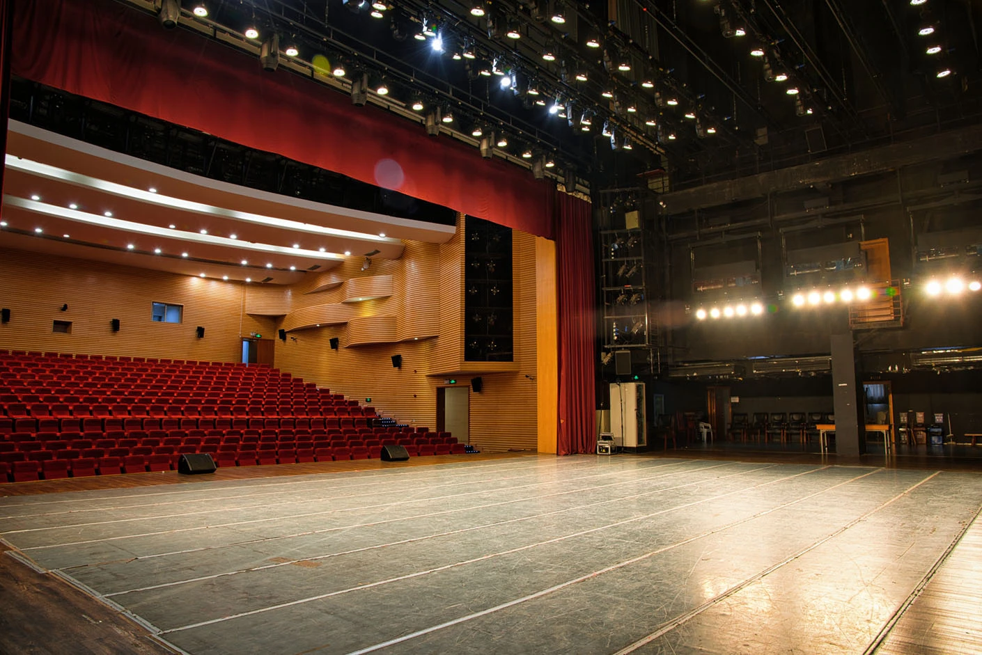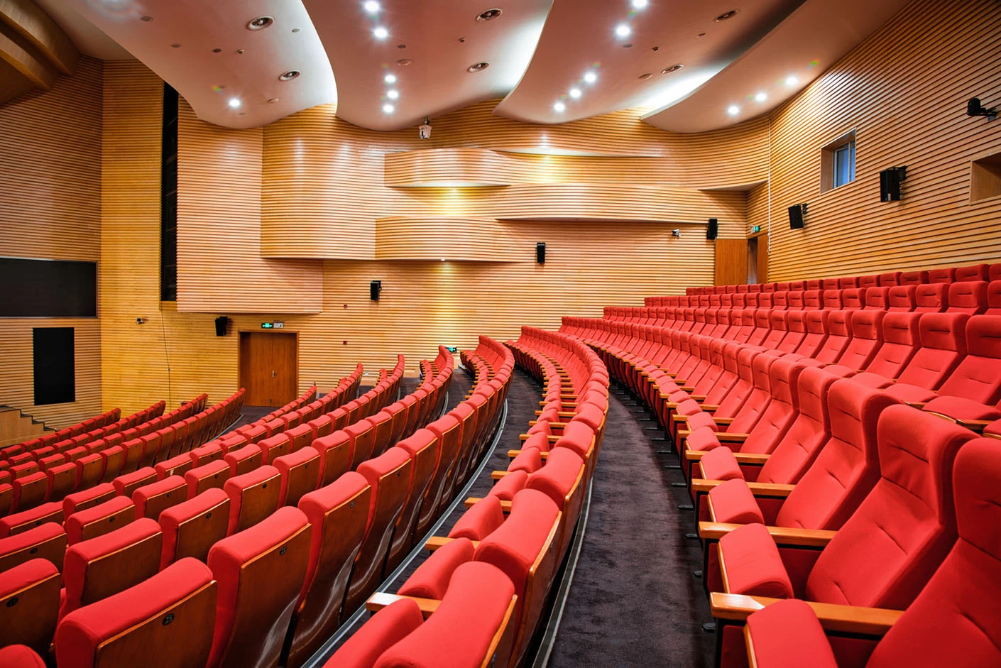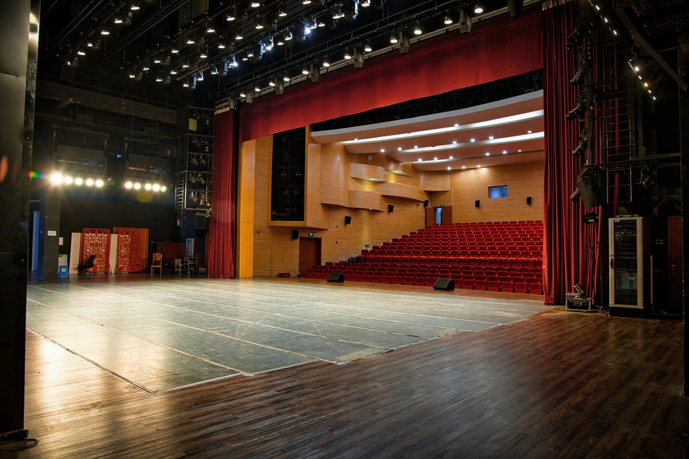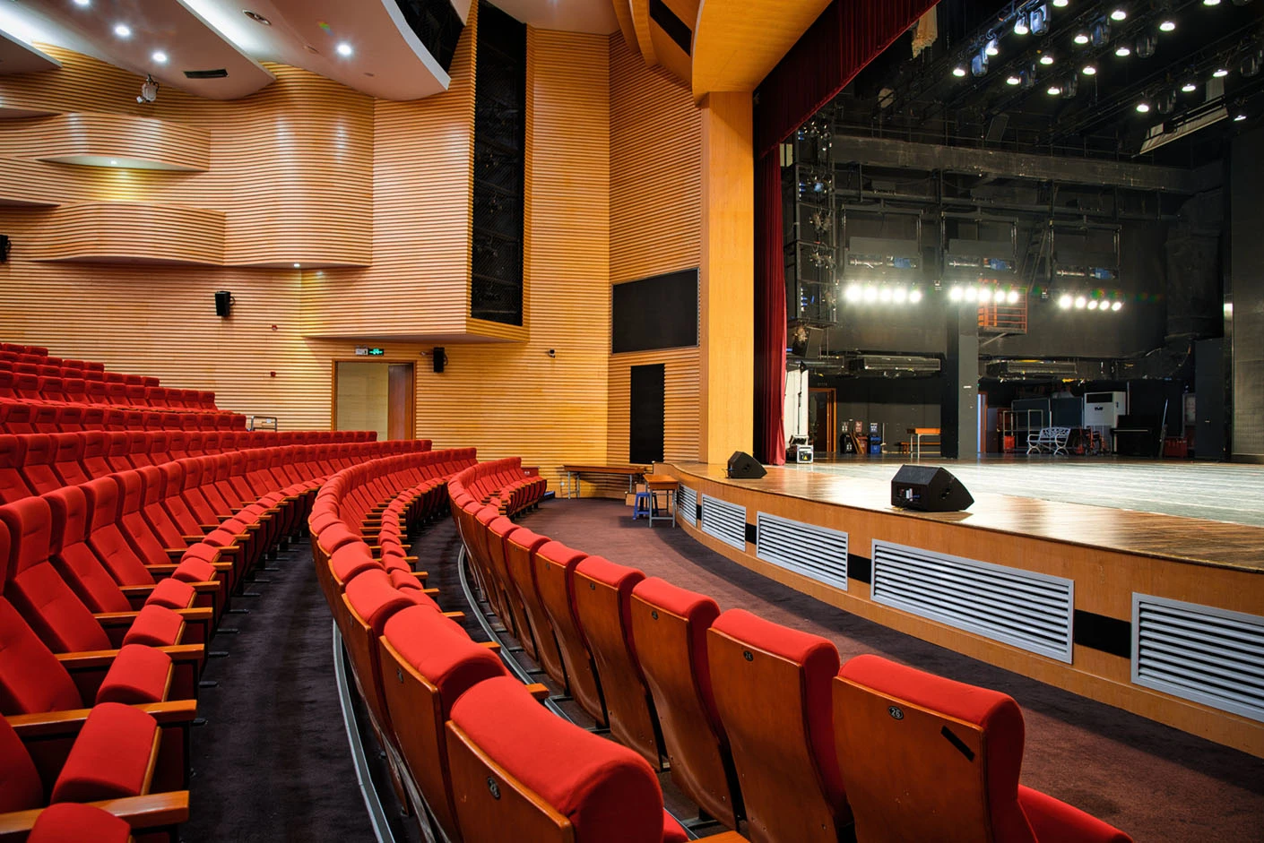 剧场舞台按照专业演出标准打造,硬件设施完备精良,台口宽13.7米、高7.4米,舞台纵深达11米,尺寸规格完全适配话剧、戏曲、歌舞、音乐会等各类专业演出需求。灯光系统配置先进,涵盖40台光束灯、100台LED染色灯及4台切割灯,可根据活动主题精准塑造舞台光影层次,呈现丰富多元的舞台效果。舞台正中搭载12.6×7.3米的大型高清LED显示屏,色彩还原度高、显示清晰,为演出、会议、发布会提供震撼的视觉载体;搭配专业级音响系统,经过声学优化设计,确保声音传输均匀、音质清晰饱满,全方位保障每场活动的视听效果。