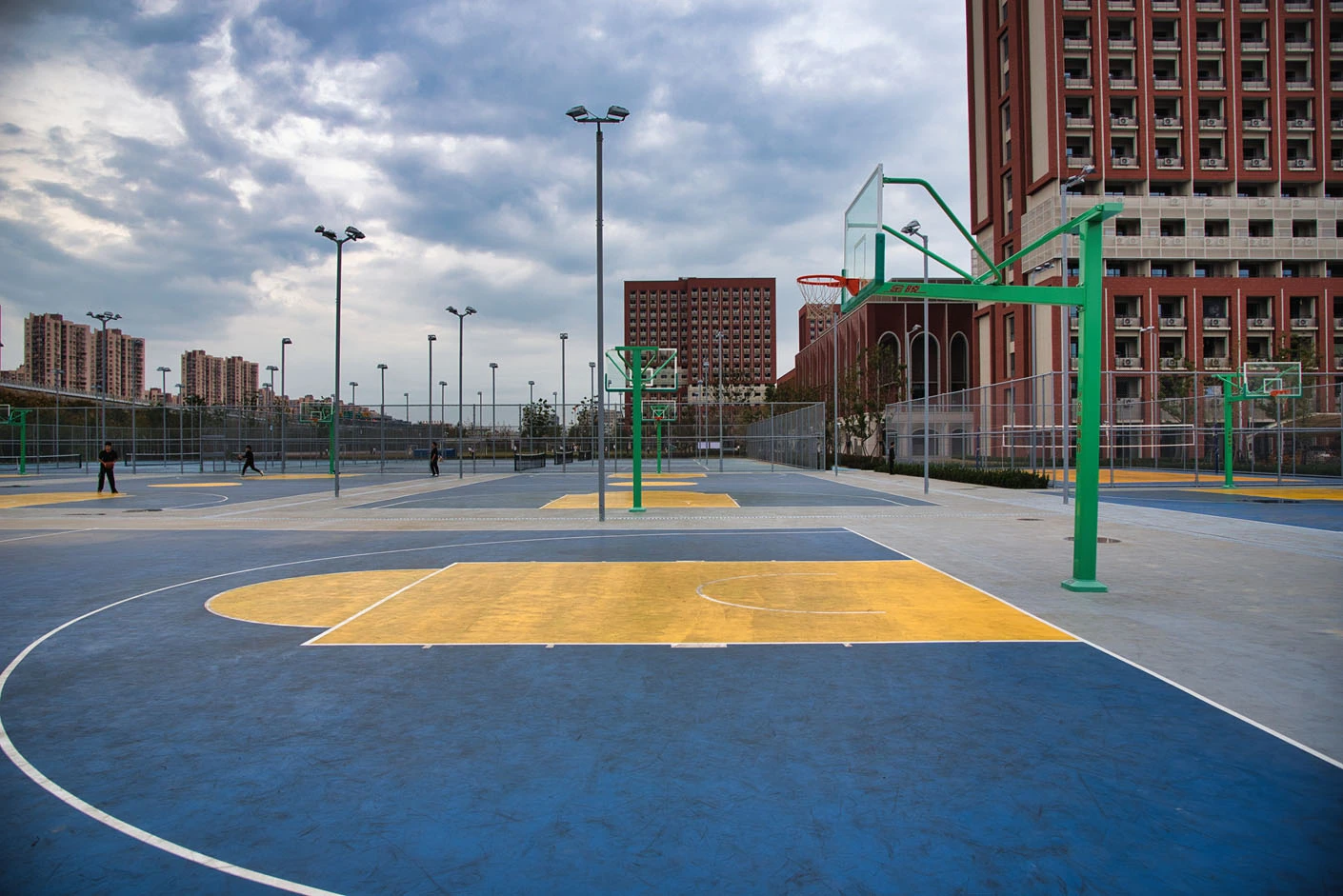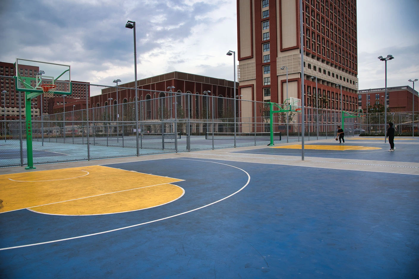 篮球场地处校区核心运动区域,与体育场、体育馆、学生食堂等主要功能区紧密相邻,形成便捷高效的校园运动生活圈,师生可步行快速抵达,让运动健身无缝融入日常学习与生活。场地由**5片标准室外篮球场**组成,采用专业赛事设计标准,整体布局集约规整,每一片场地均遵循国际篮球比赛规范建设,从场地基础、面层材质到功能区划,均实现专业性与实用性的高度统一。场地配备完善的专业围网系统,既能清晰划分运动区域,有效阻隔篮球飞出场地,保障运动过程安全,又能减少外部环境干扰,让运动者专注投入训练与比赛,同时为场外观赛提供良好视野,营造热烈有序的运动氛围。