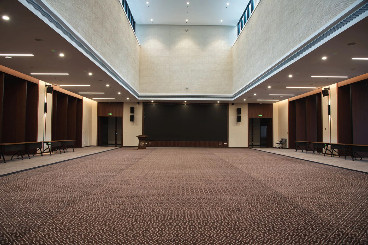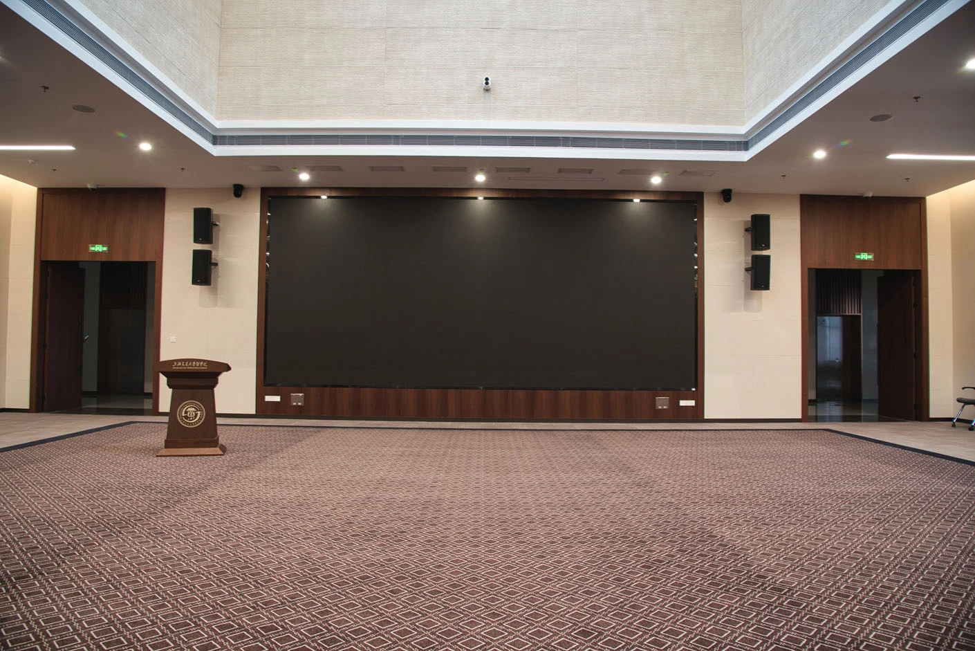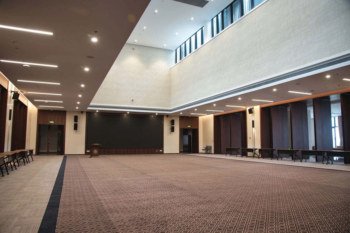 上海交通大学医学院浦东校区图书馆多功能会议室坐落于上海市浦东新区周浦镇半夏路1号图书馆16层,是校区内集学术研讨、专业培训与文化传播于一体的现代化高端会议场所。作为2025年9月正式启用的浦东校区核心配套设施,该会议室依托交大医学院近一百三十年办学历史与七十余年建院历程的深厚学术积淀,秉承“世界一流、中国特色、上海风格、交医特质”的办学定位,以“涵泽”为设计理念,寓意“涵养学术,泽被后学”,深刻彰显医学院图书馆作为知识殿堂的厚重文化内涵。会议室所在的图书馆建筑是校区27幢建筑单体中的重要组成部分,与医学教学综合楼、科研集群、生命科学馆等建筑相互呼应,共同构筑起完整且高效的学术生态系统。空间设计充分践行国际化、现代化、智慧化的校园建设理念,凭借独特的10米层高与天井式自然采光设计,营造出明亮开阔、庄重大气的会议氛围;咖啡色地毯地面与暖色调内饰相得益彰,既满足会议场景的静谧需求,又打造出温馨舒适的学术交流环境。