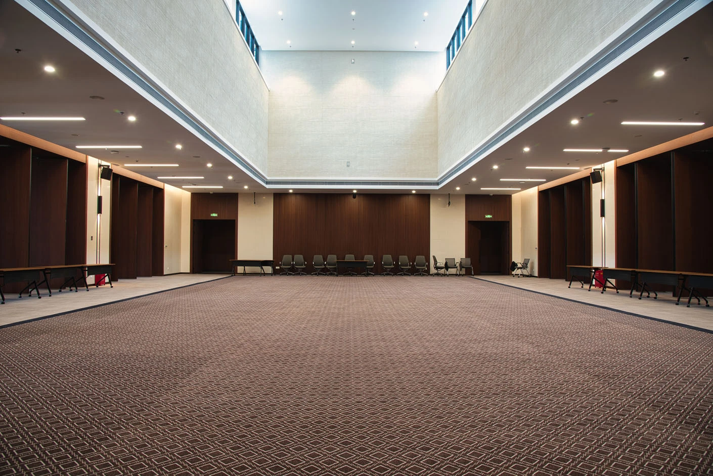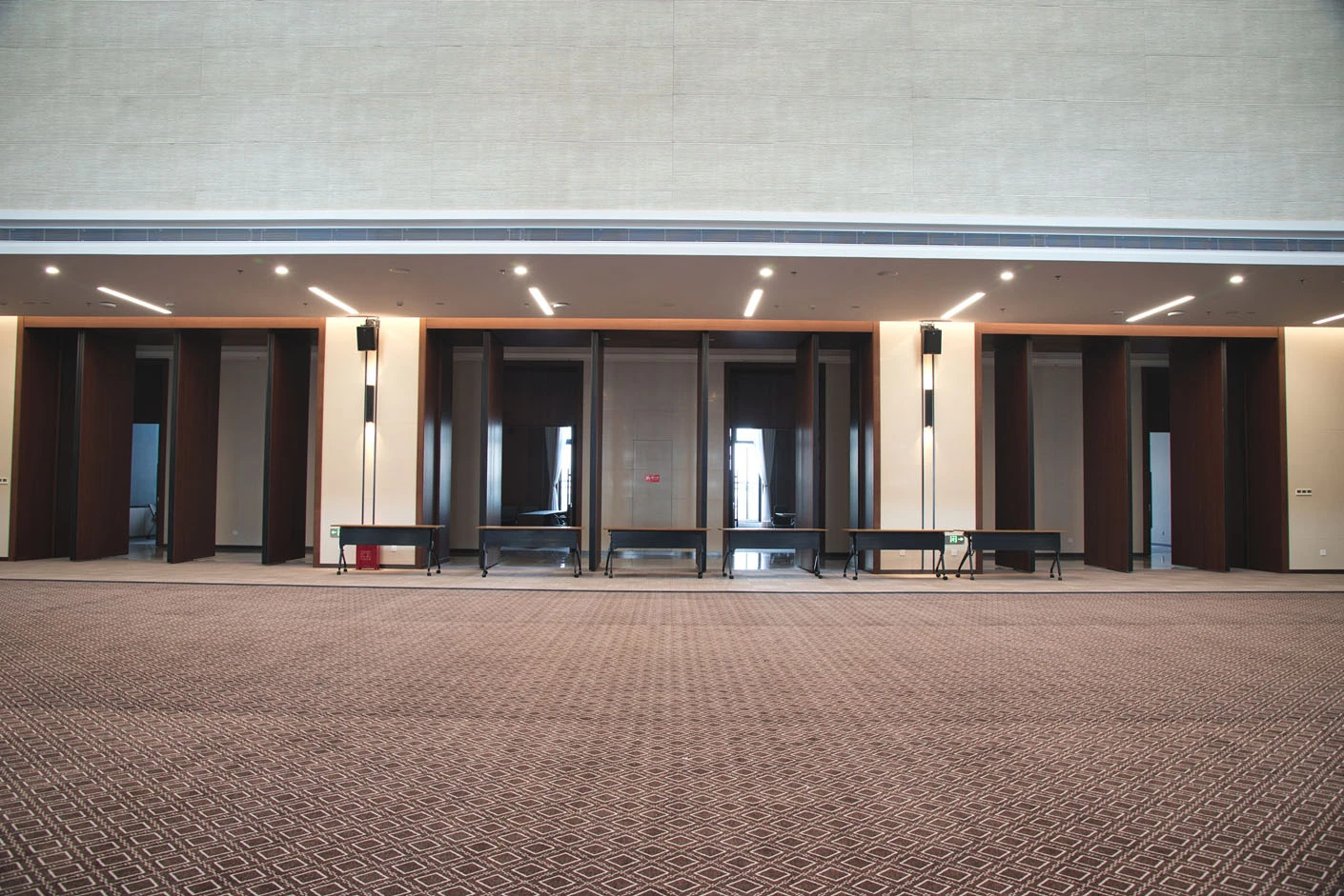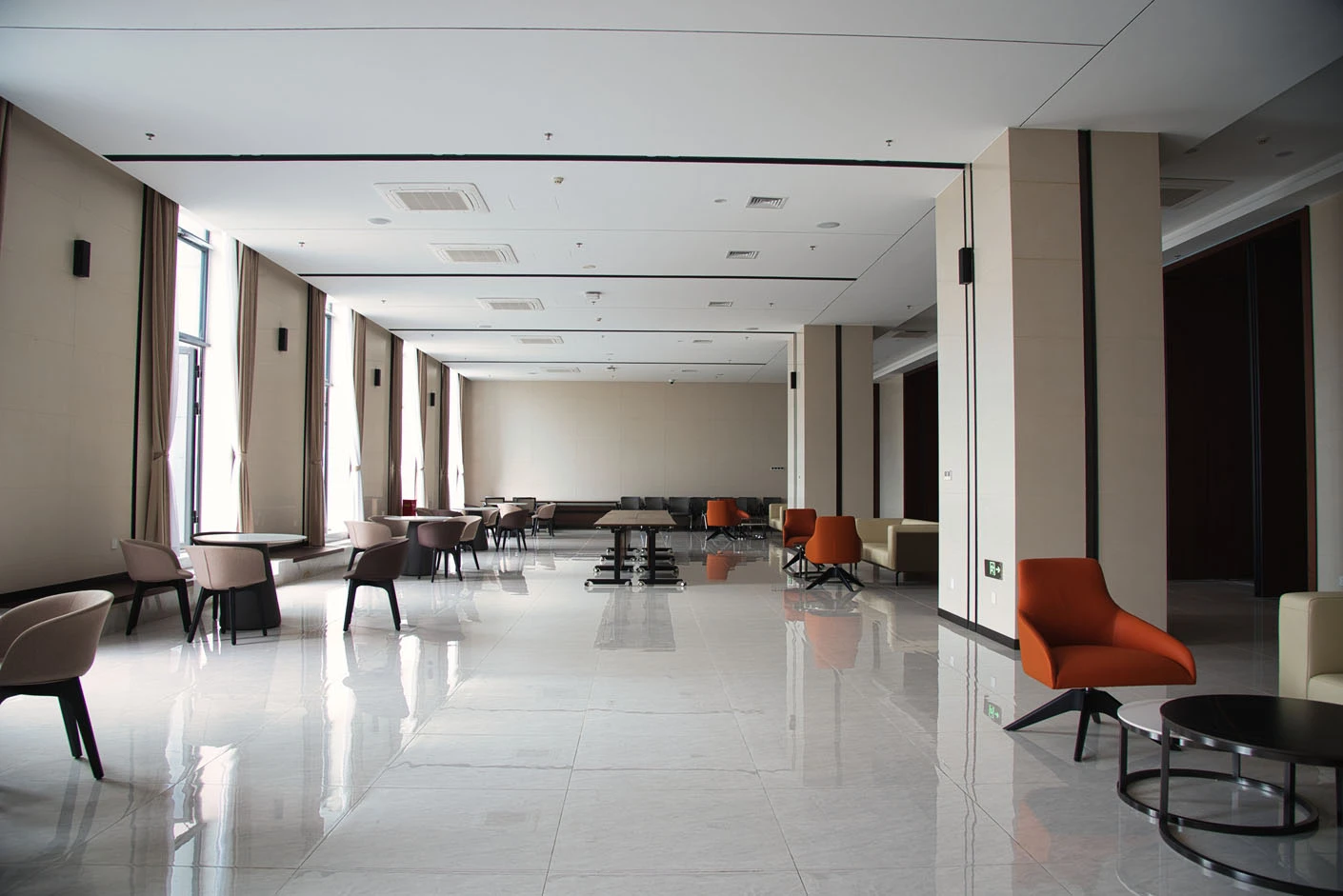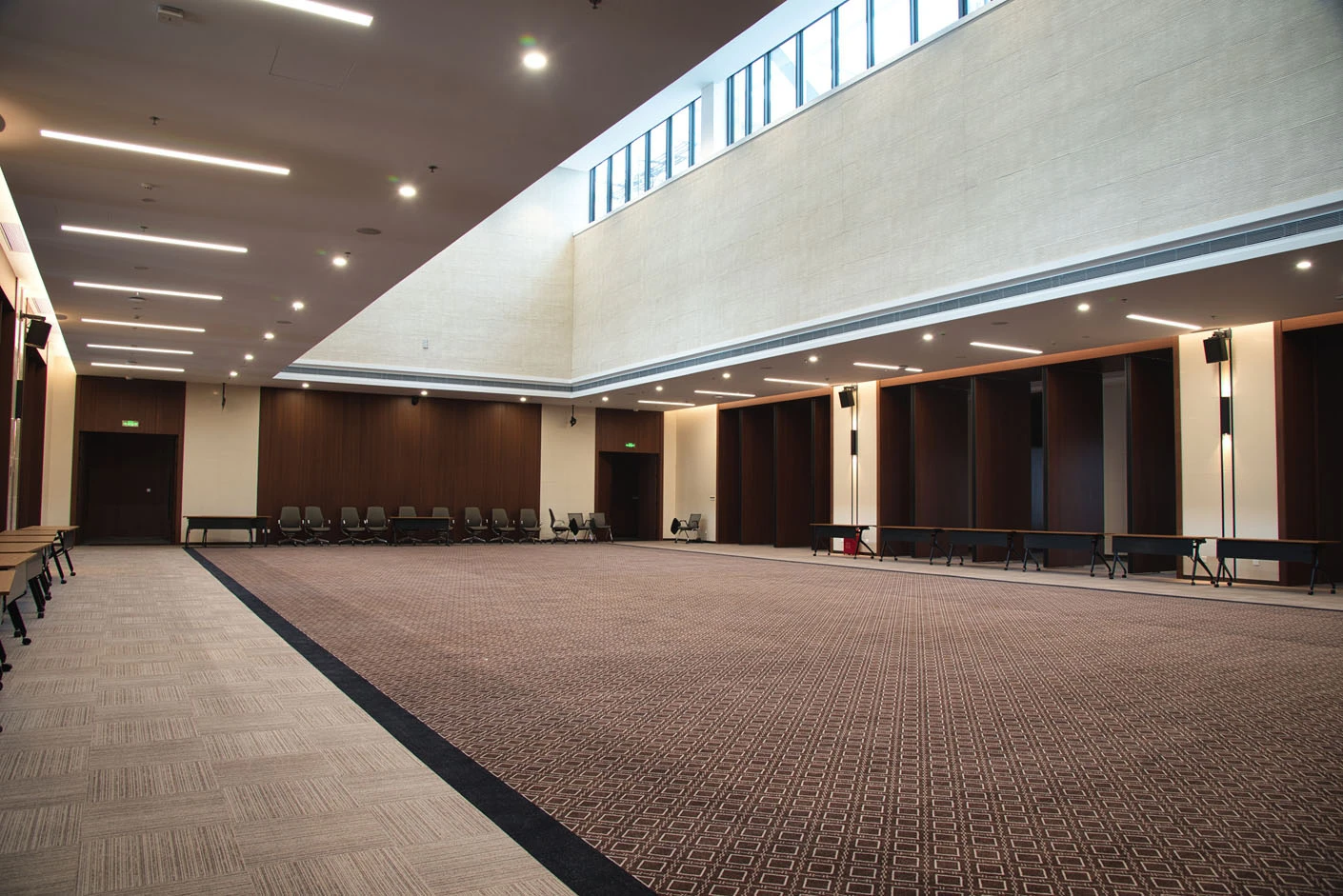 上海交通大学医学院浦东校区图书馆多功能会议室坐落于上海市浦东新区周浦镇半夏路1号图书馆16层,是校区内集学术研讨、专业培训与文化传播于一体的现代化高端会议场所。作为2025年9月正式启用的浦东校区核心配套设施,该会议室依托交大医学院近一百三十年办学历史与七十余年建院历程的深厚学术积淀,秉承“世界一流、中国特色、上海风格、交医特质”的办学定位,以“涵泽”为设计理念,寓意“涵养学术,泽被后学”,深刻彰显医学院图书馆作为知识殿堂的厚重文化内涵。会议室所在的图书馆建筑是校区27幢建筑单体中的重要组成部分,与医学教学综合楼、科研集群、生命科学馆等建筑相互呼应,共同构筑起完整且高效的学术生态系统。空间设计充分践行国际化、现代化、智慧化的校园建设理念,凭借独特的10米层高与天井式自然采光设计,营造出明亮开阔、庄重大气的会议氛围;咖啡色地毯地面与暖色调内饰相得益彰,既满足会议场景的静谧需求,又打造出温馨舒适的学术交流环境。