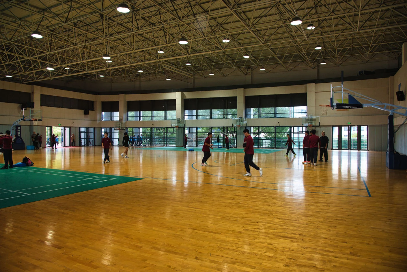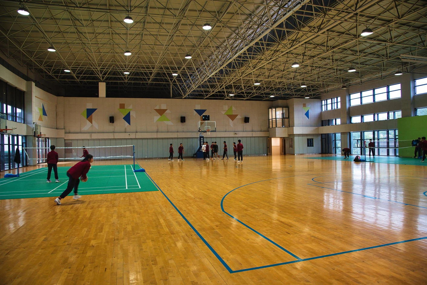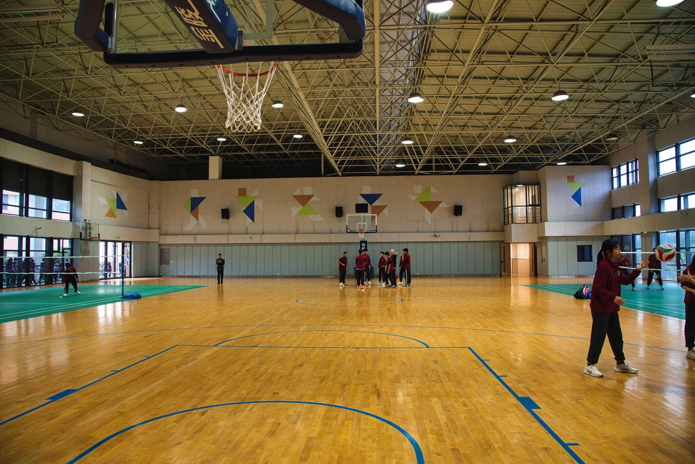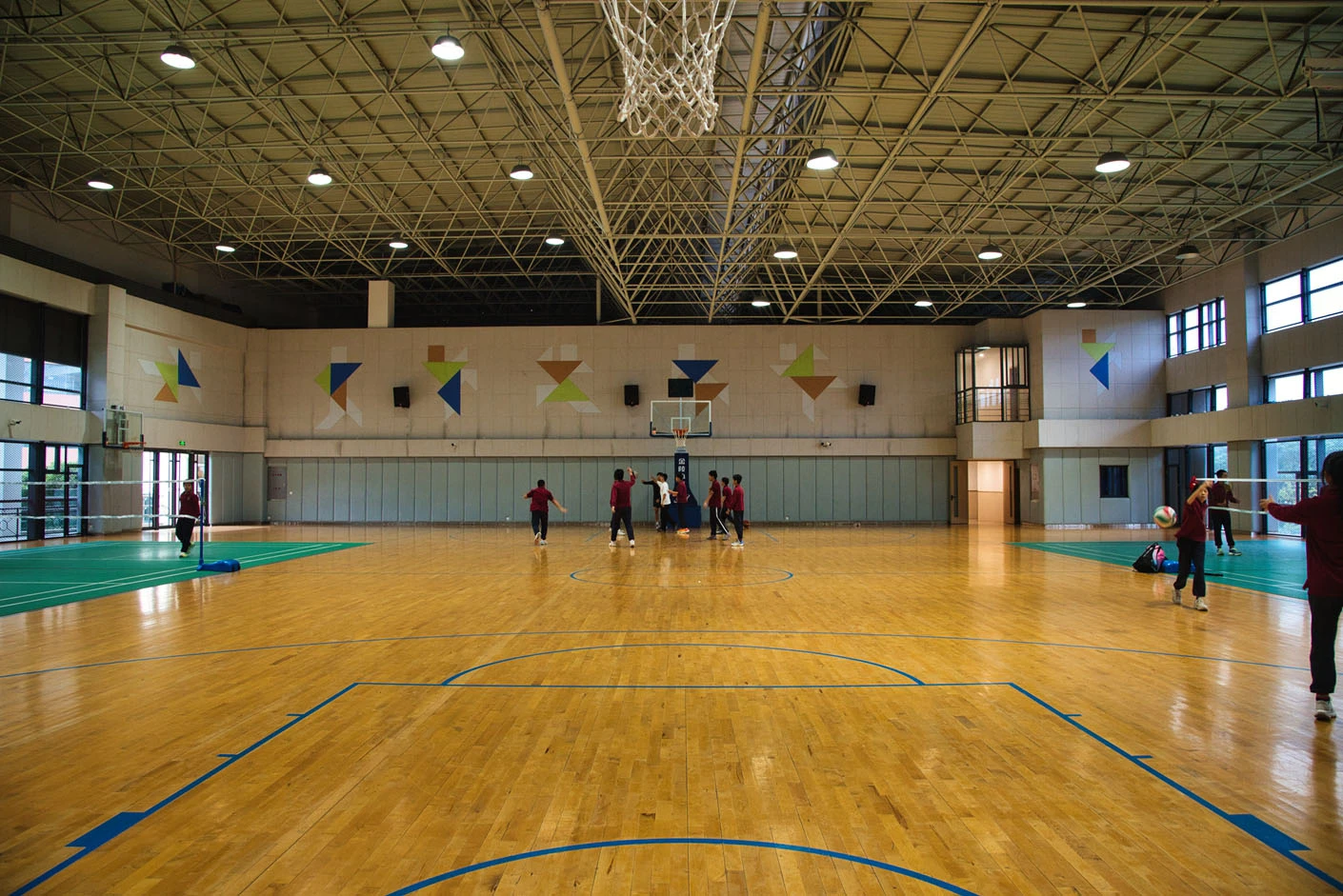 场馆内部空间规整开阔,采用**专业运动木地板**铺设,地面弹性优良、防滑减震,能有效降低运动损伤风险,为篮球、羽毛球等运动提供优质的运动体验。馆内配备**六台专业音响设备、高清显示大屏与中央空调系统**,可精准满足赛事播报、活动展示、环境恒温调控等多元需求,无论体育竞技还是文艺展演,都能呈现出色的视听效果与舒适的环境体验。合理的空间分区与专业的设施配置,让场馆既能承载专业体育赛事,也可承办大型校园文化活动,实现“一场多用、高效运营”的建设目标。