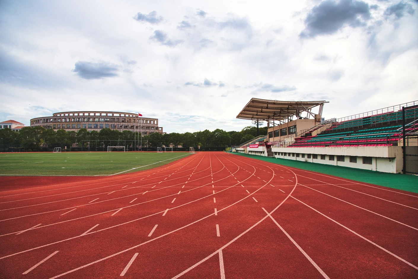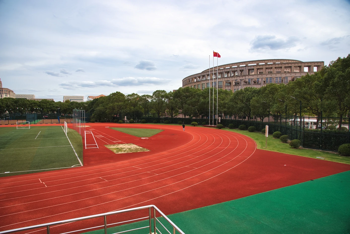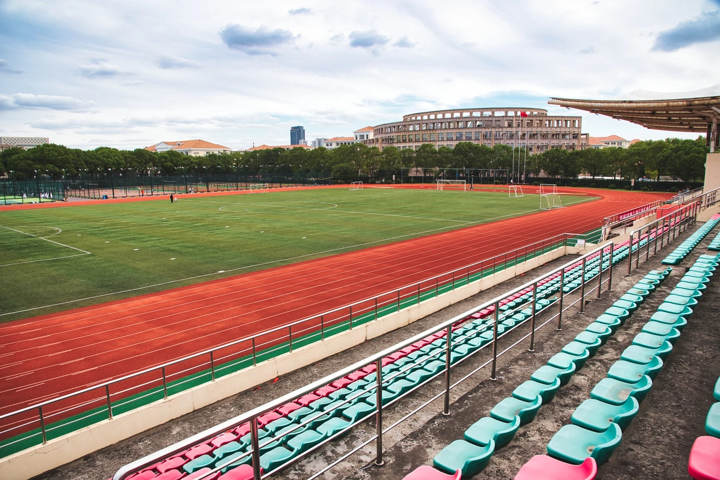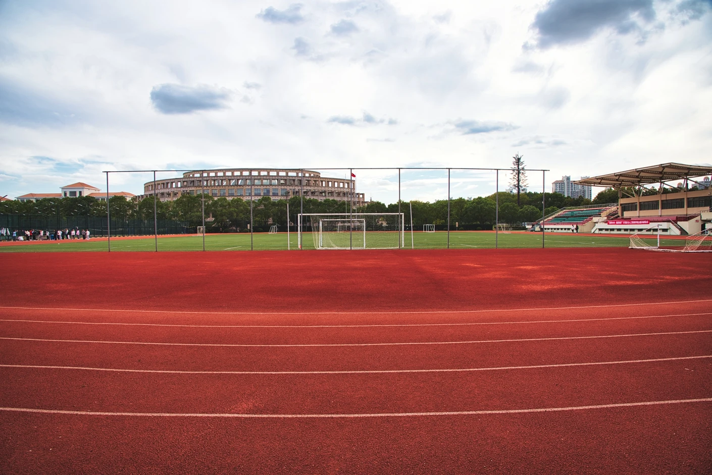 学校现有浦东、松江和徐汇三个校区,总占地面积 1200 多亩,其中松江校区坐落于上海市松江区文翔路 2800 号,作为学校重要的办学阵地之一,校区周边高校云集,学术氛围浓厚,校园环境优美,绿植繁茂,建筑布局合理,既保留了人文气息,又兼具现代化高校的便捷与高效。松江校区始终以满足师生教学、科研、体育锻炼和校园文化活动需求为核心,不断完善基础设施建设,而体育场作为校区标志性的户外场地之一,更是承载了众多校园体育赛事、大型集会和各类户外活动的重要功能。