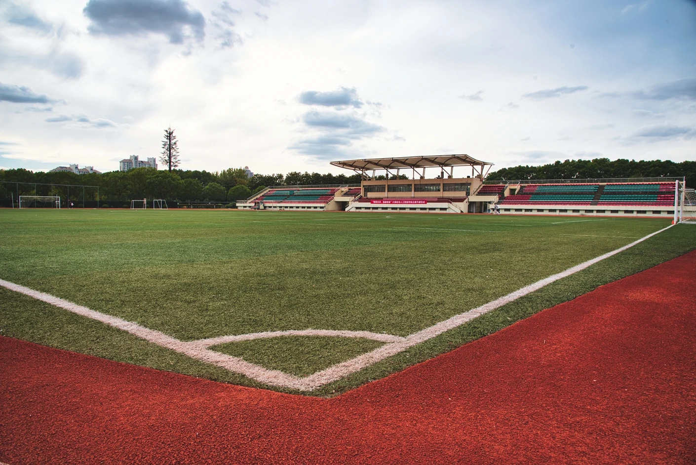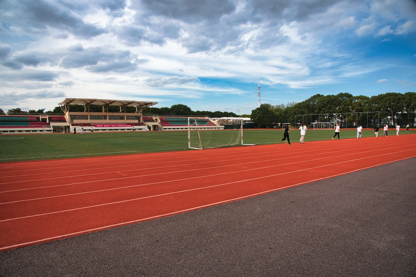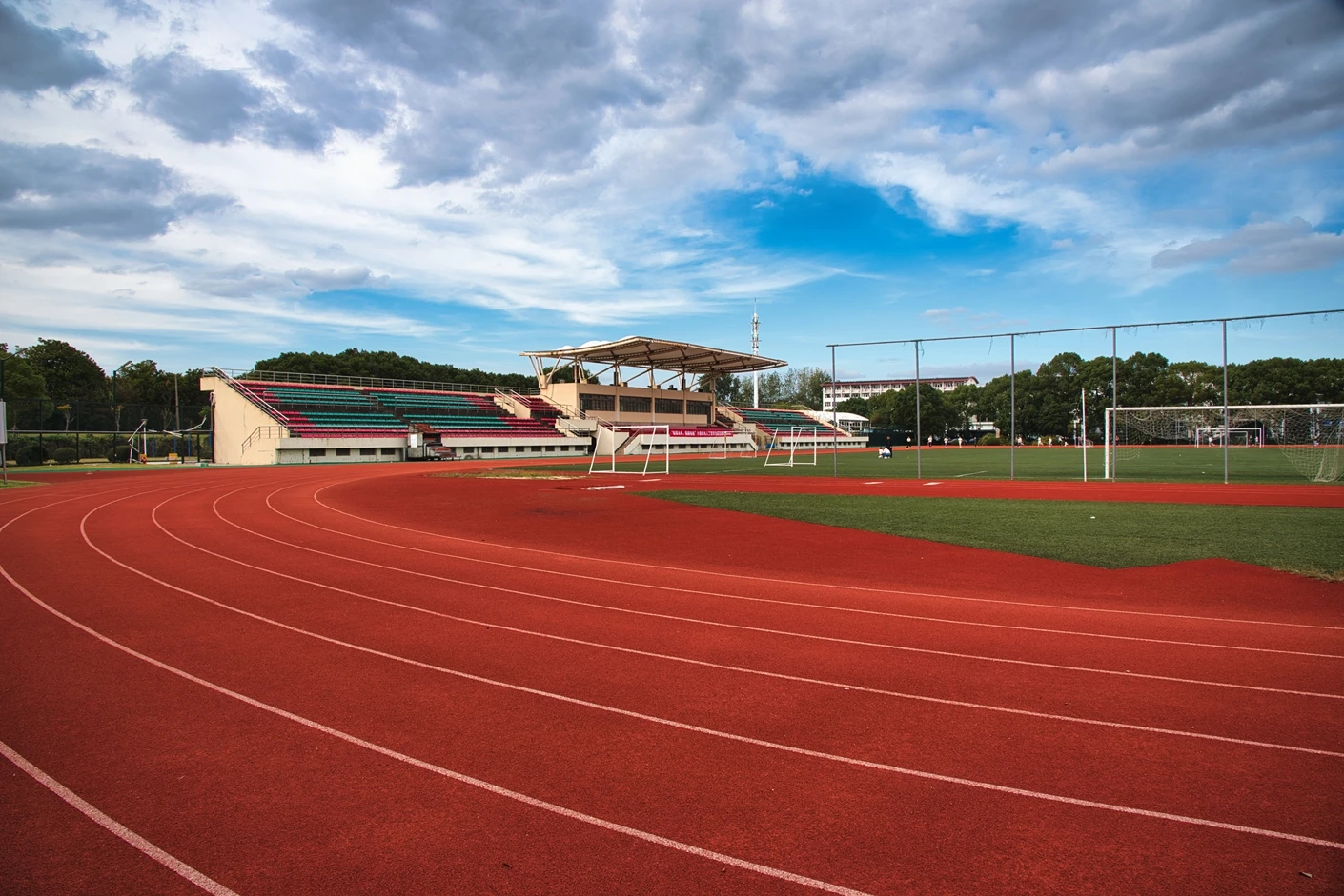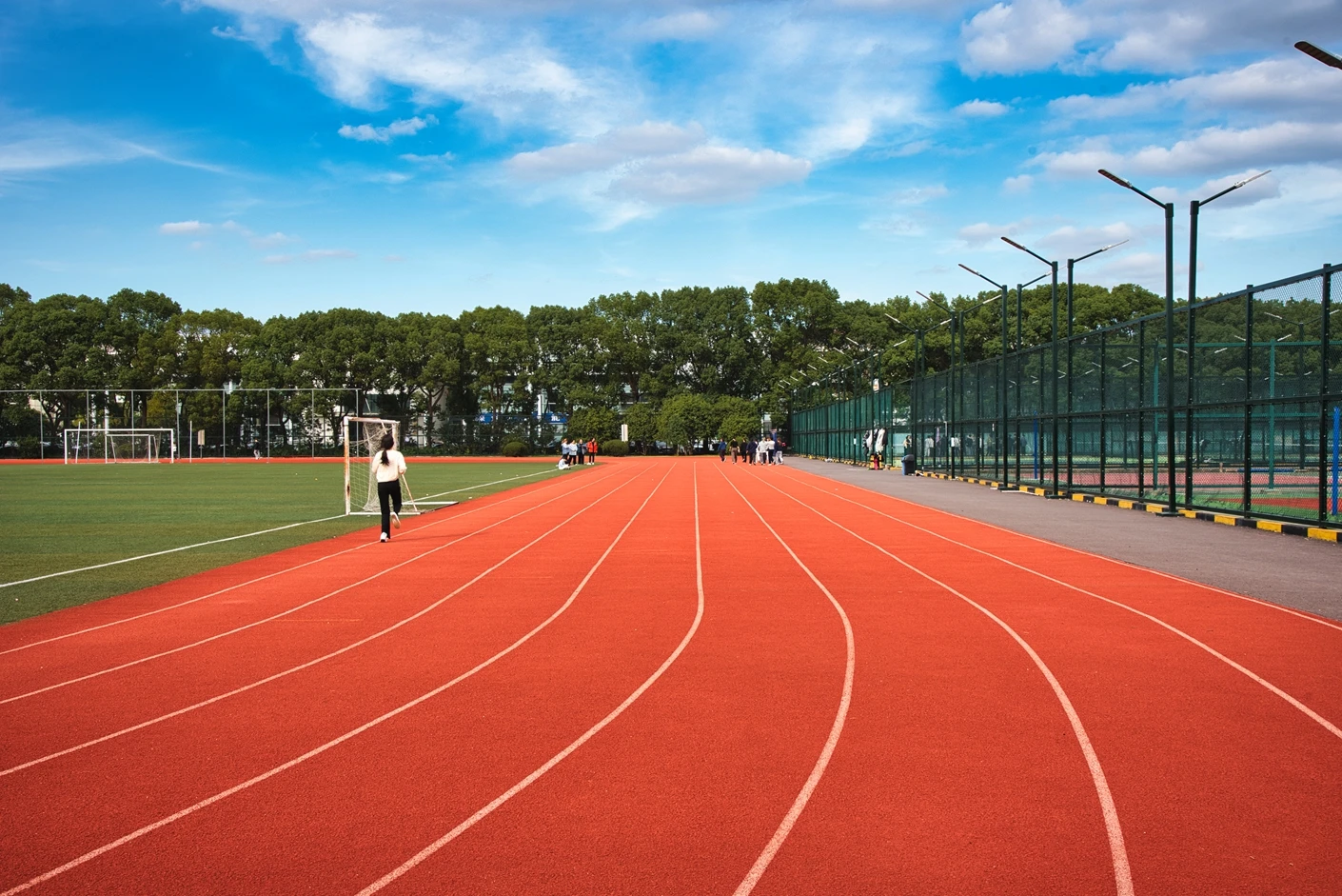 学校现有浦东、松江和徐汇三个校区,总占地面积 1200 多亩,其中松江校区坐落于上海市松江区文翔路 2800 号,作为学校重要的办学阵地之一,校区周边高校云集,学术氛围浓厚,校园环境优美,绿植繁茂,建筑布局合理,既保留了人文气息,又兼具现代化高校的便捷与高效。松江校区始终以满足师生教学、科研、体育锻炼和校园文化活动需求为核心,不断完善基础设施建设,而体育场作为校区标志性的户外场地之一,更是承载了众多校园体育赛事、大型集会和各类户外活动的重要功能。