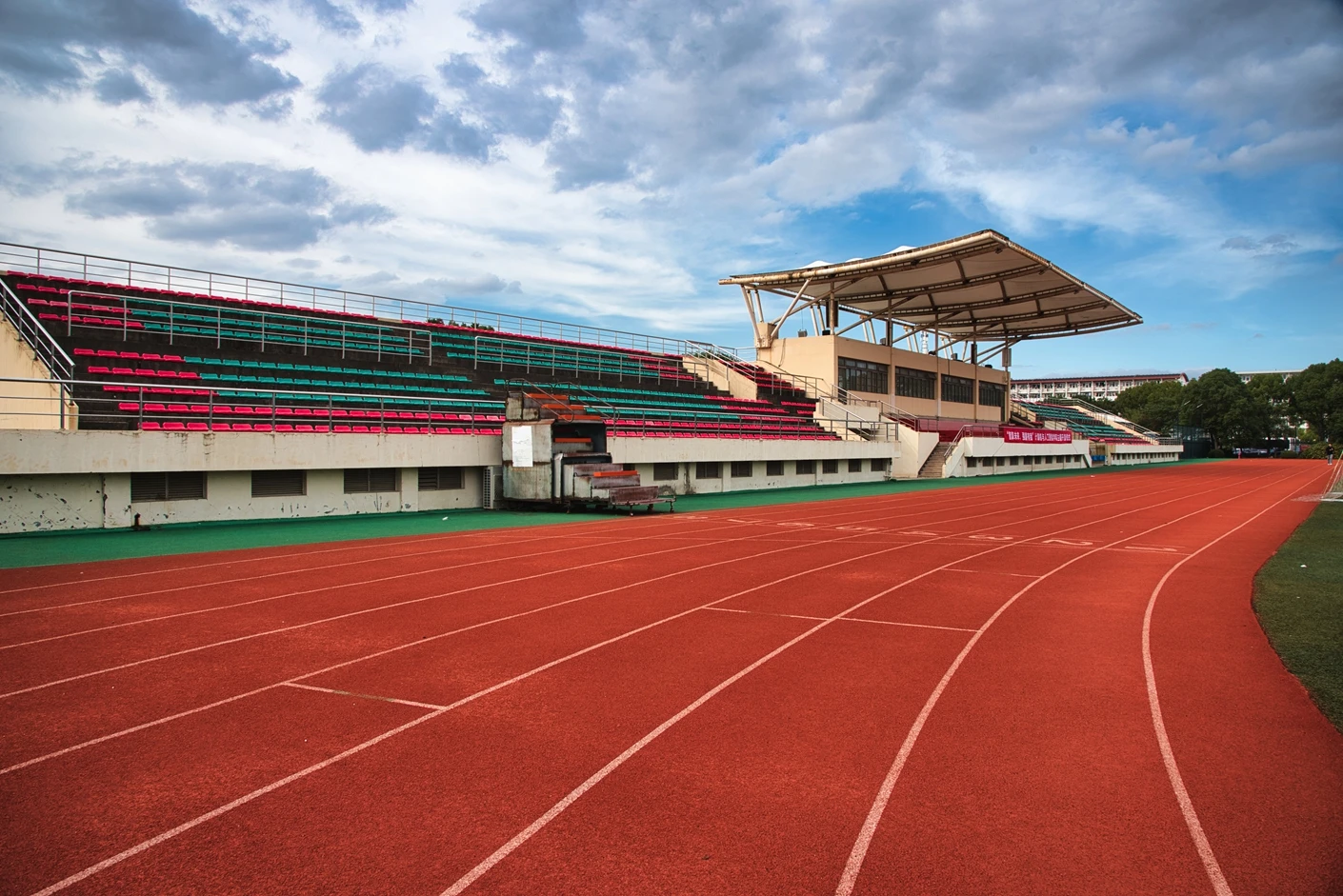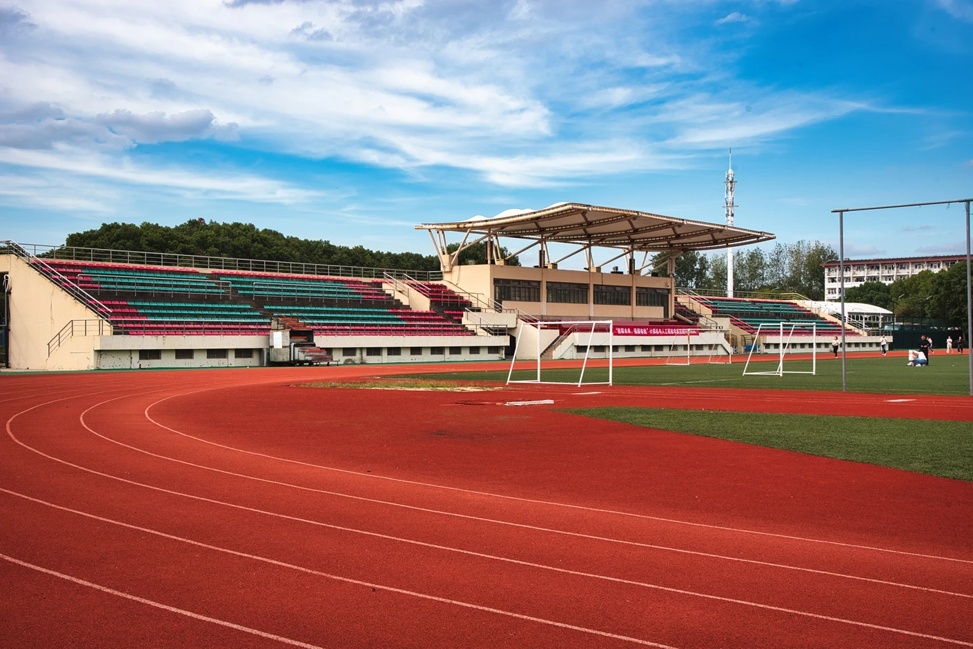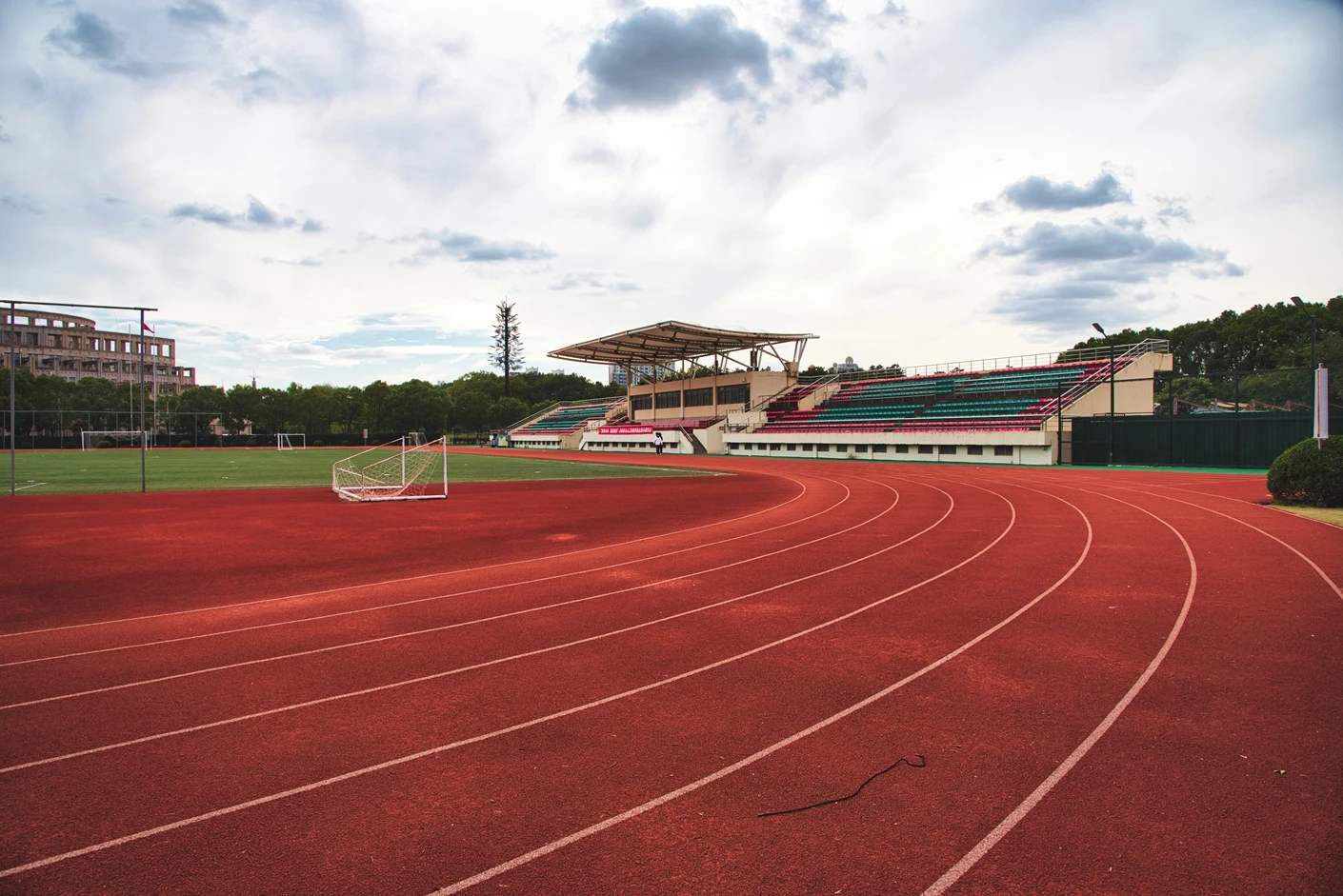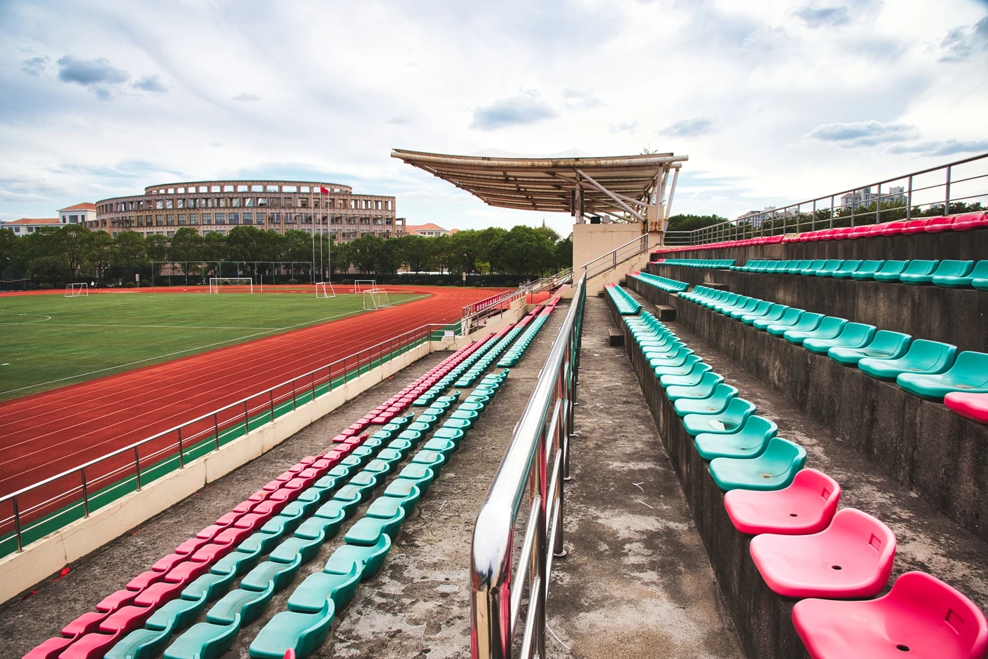 学校现有浦东、松江和徐汇三个校区,总占地面积 1200 多亩,其中松江校区坐落于上海市松江区文翔路 2800 号,作为学校重要的办学阵地之一,校区周边高校云集,学术氛围浓厚,校园环境优美,绿植繁茂,建筑布局合理,既保留了人文气息,又兼具现代化高校的便捷与高效。松江校区始终以满足师生教学、科研、体育锻炼和校园文化活动需求为核心,不断完善基础设施建设,而体育场作为校区标志性的户外场地之一,更是承载了众多校园体育赛事、大型集会和各类户外活动的重要功能。
