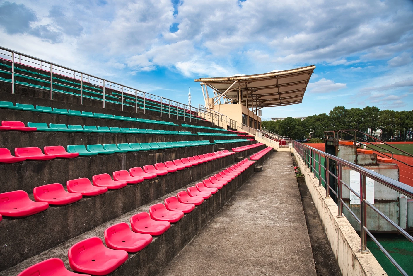 场地配备的1082 个座位看台,布局科学合理,视野开阔,能够满足中小型活动的观赛需求。看台区域包含功能完善的主席台和音控室,主席台设有雨棚,可灵活布置桌椅,适合作为活动的主持区、嘉宾区,雨棚设计有效应对天气变化,保障活动顺利进行;专业音控室与场地音响系统相连,音质清晰、覆盖范围广,能够满足各类活动的扩音需求。此外,场地还设有旗杆、沙坑等配套设施,旗杆可用于各类仪式性活动的升旗环节,沙坑则为田径项目中的跳跃类运动提供了专业场地支持,进一步丰富了场地的使用功能。