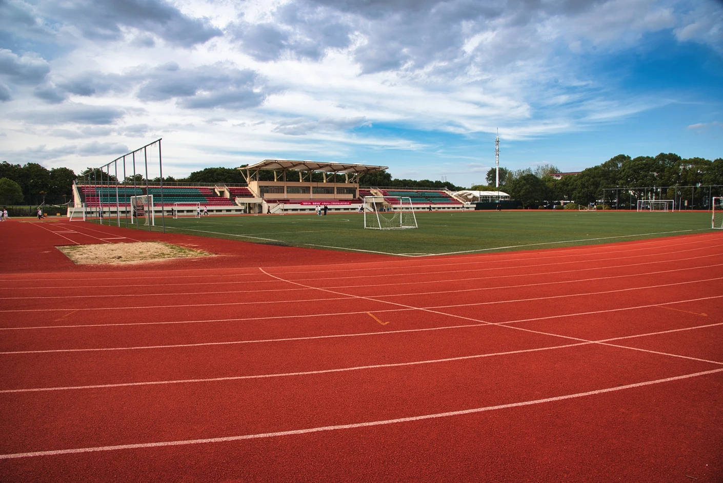 体育场的建设严格遵循高标准设计规范,充分考虑了实用性与舒适性的平衡,旨在为使用者提供优质的活动空间。场地核心区域包含标准 400 米塑胶跑道,跑道采用高品质材料铺设,平整度高、弹性适宜,既能满足专业田径训练和比赛的需求,也能保障日常体育锻炼的安全性;跑道环绕着标准 11 人制人工草坪足球场,草坪选用耐磨、环保的优质材料,仿真度高、排水性好,无论晴雨天气都能保持良好的使用状态,为足球运动提供稳定的场地条件。