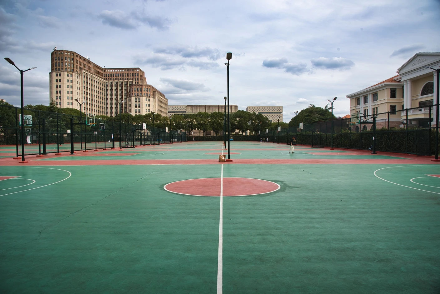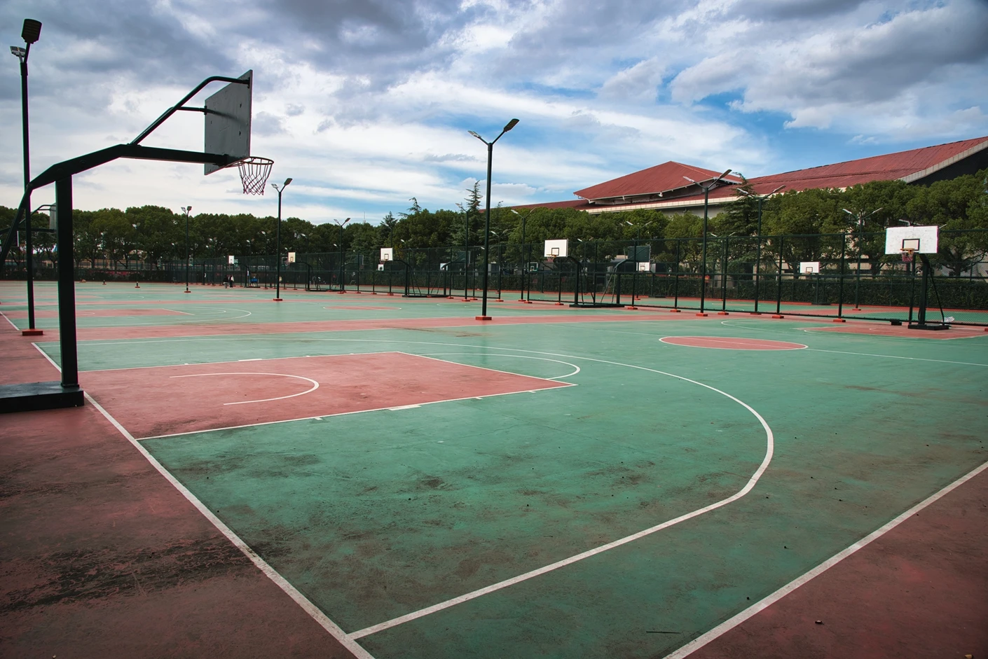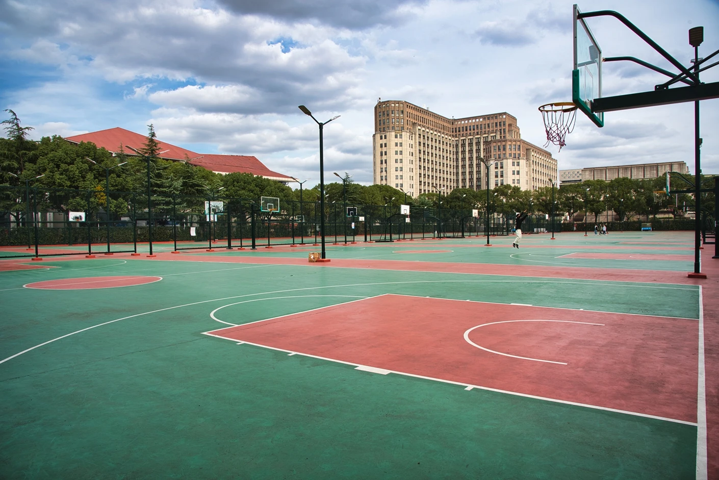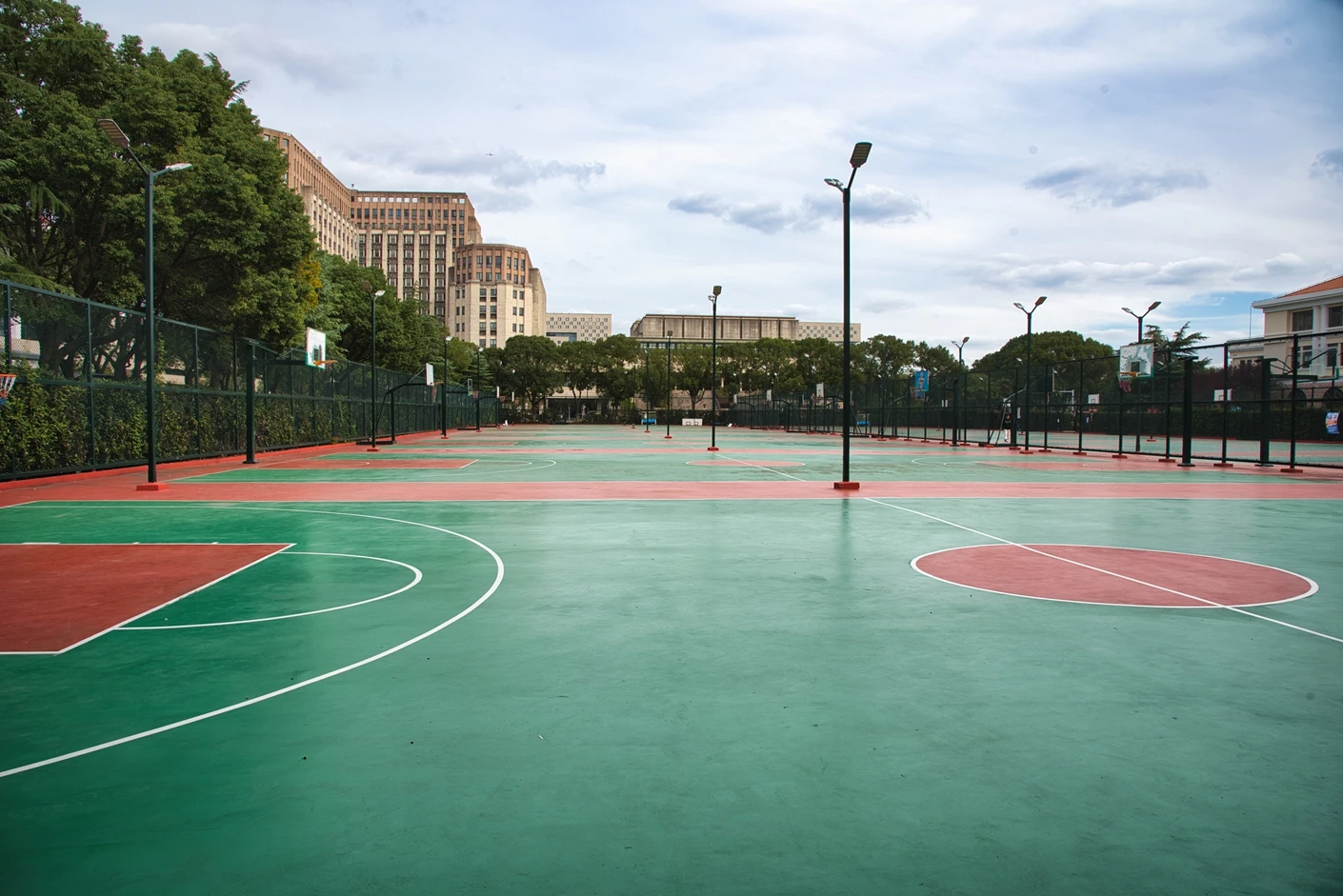 每片篮球场均为标准尺寸设计,长 28 米、宽 15 米,界线清晰,画线宽度为 5 厘米,采用丙烯酸专用划线漆,遮盖力强、耐磨损,长期使用不易褪色模糊。场地地面选用高品质硅 PU 材料铺设,这种符合国家环保标准的弹性面层,采用 “上硬下弹” 的多层结构设计,弹性层能有效吸收 63% 以上的运动冲击力,大幅降低运动员起跳落地时脚踝、膝盖等关节的受力,减少运动损伤风险,而耐磨面层则提供了 0.4-0.7 的适宜摩擦系数,确保急停、变向时的抓地力,即便潮湿天气也能有效防滑。硅 PU 材料无毒无味,挥发性有机化合物(VOC)含量远低于国家标准,且耐候性极强,能抵御上海地区的高温、多雨、强紫外线等复杂气候,长期使用不易出现起泡、开裂、褪色等问题,使用寿命可达 8 年以上,日常仅需清水冲洗即可保持洁净。