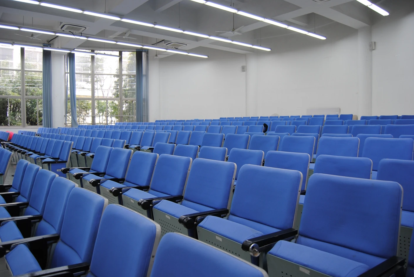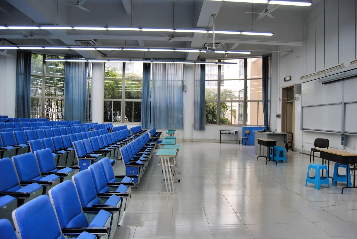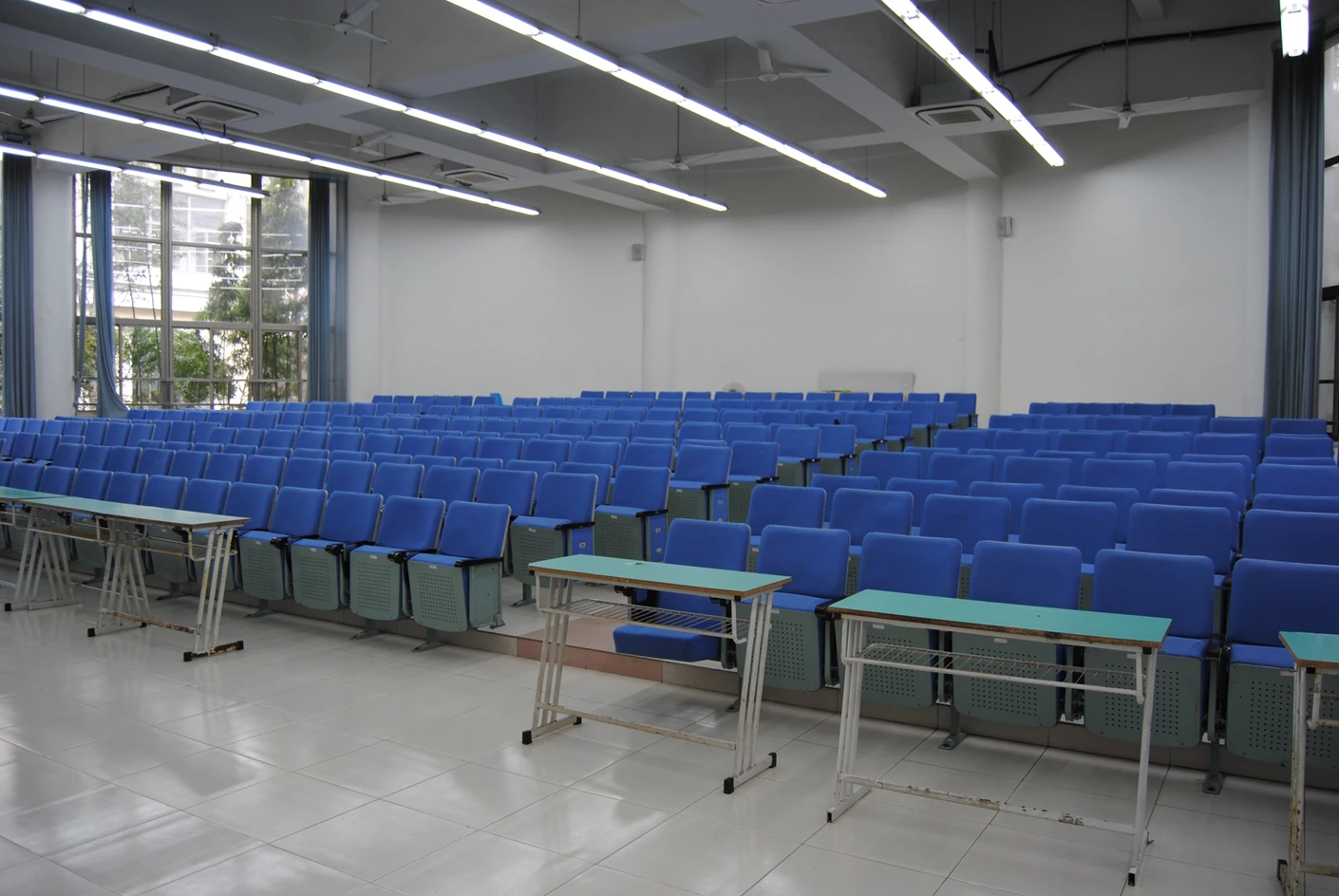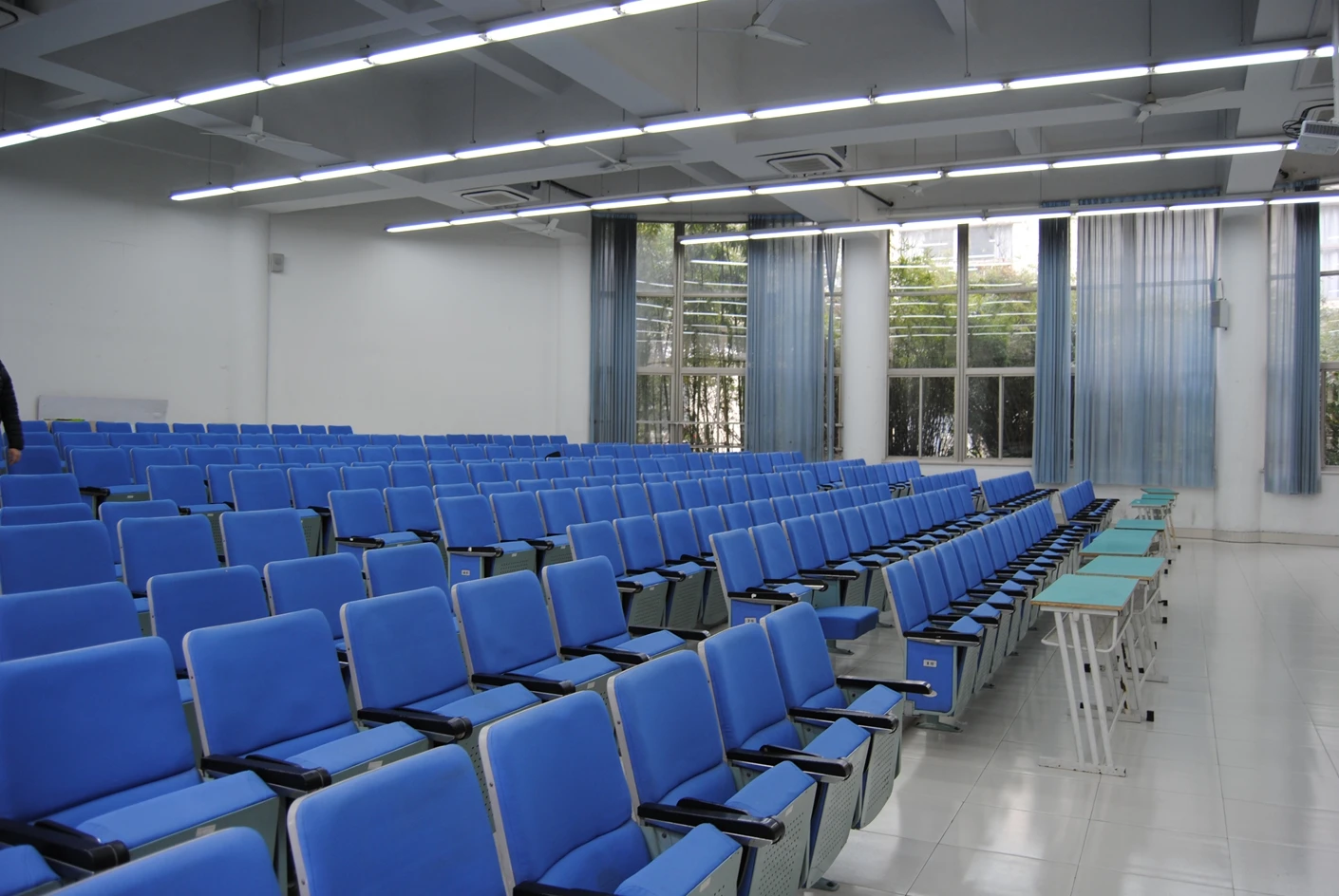 5号教学楼作为松江校区的主力教学楼之一,建筑设计兼顾实用性与美观性,楼内动线清晰,电梯与楼梯并行,方便师生快速抵达各楼层教室。300人阶梯教室空间规划科学合理,整体呈扇形布局,共设有300个阶梯式座椅,座椅采用人体工学设计,靠背角度适宜,坐垫柔软舒适,能够有效缓解长时间就坐的疲劳感。座椅排布严格遵循视线优化原则,前后排间距充足,每一排的高度差经过精准测算,确保后排使用者的视线完全不会被前排遮挡,无论是观看讲台的板书内容,还是欣赏投影屏幕上的课件、视频,都能拥有清晰无死角的视野。这种阶梯式布局彻底打破了传统平层教室的视野局限,让每一位参与者都能沉浸式投入到教学或活动当中,尤其适合需要全员专注听讲的中型讲座与培训活动。