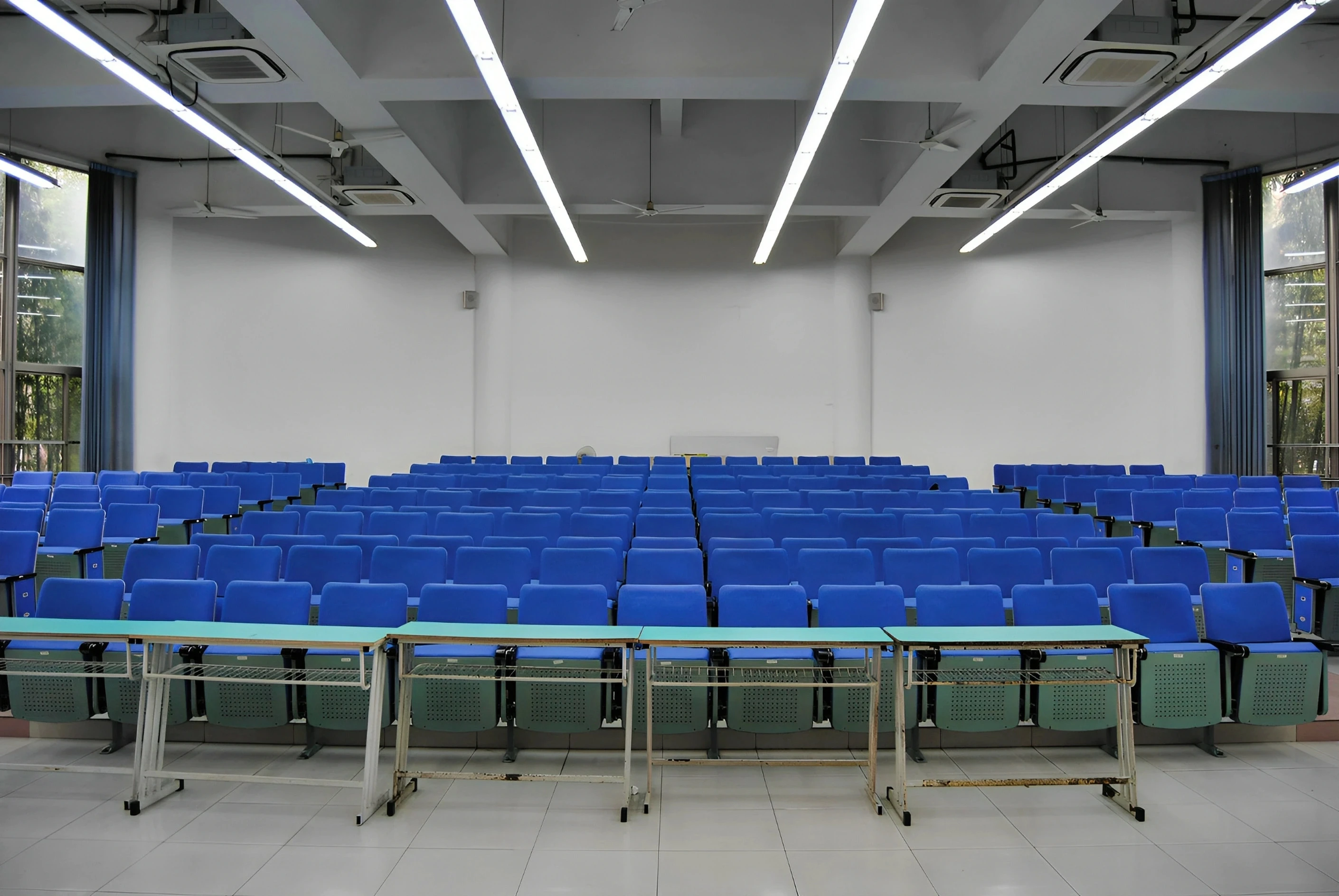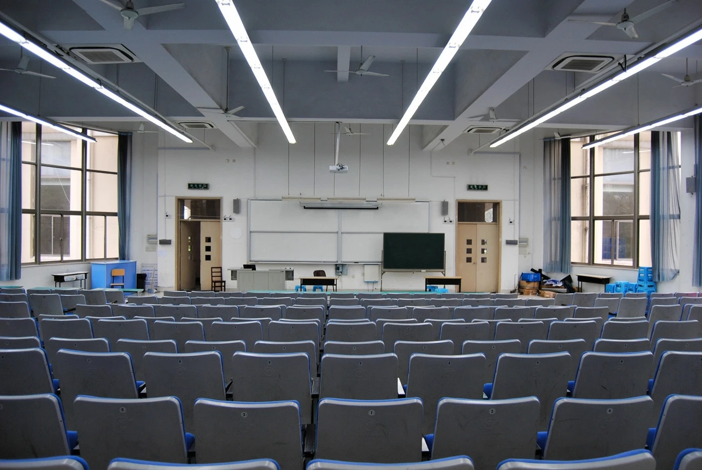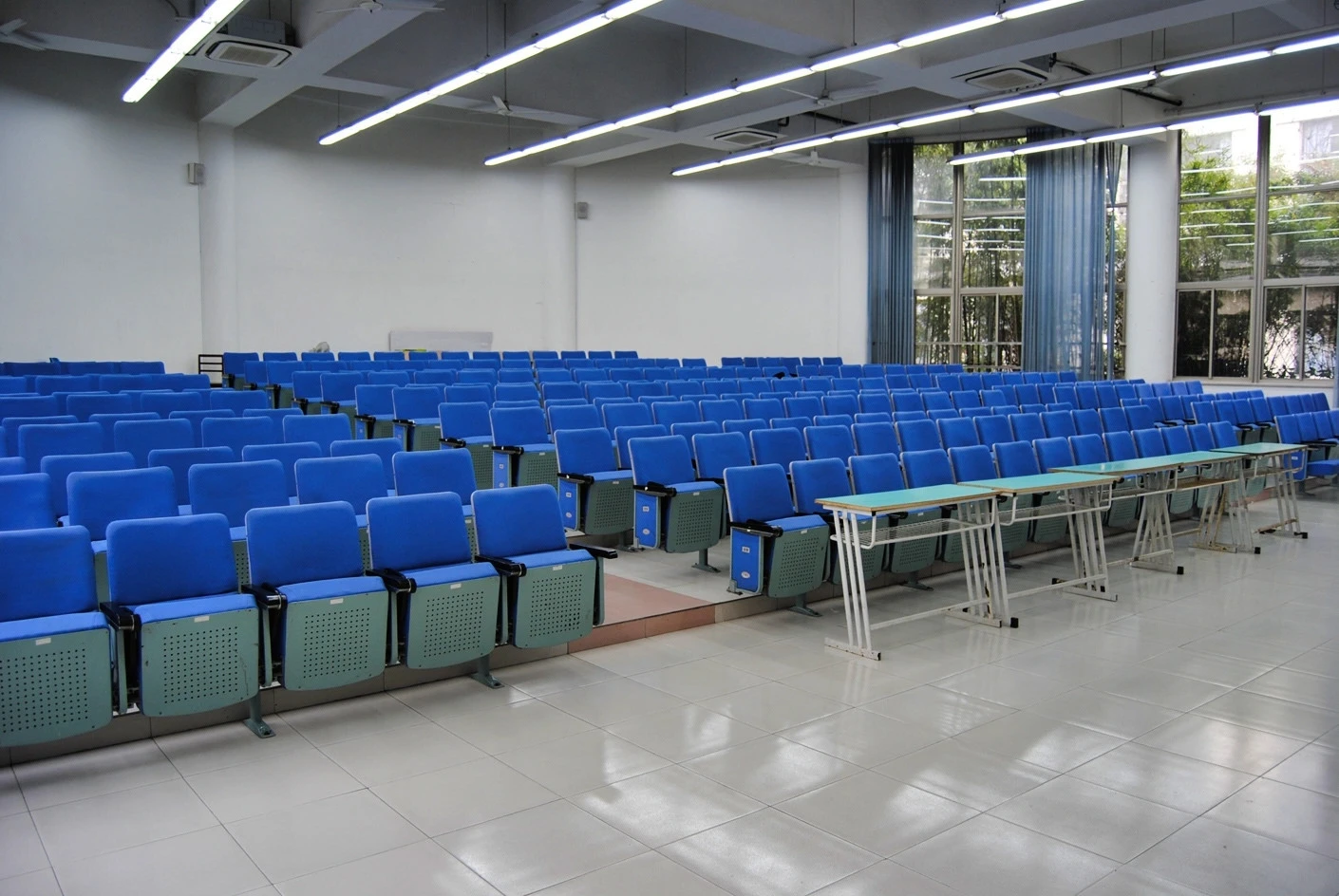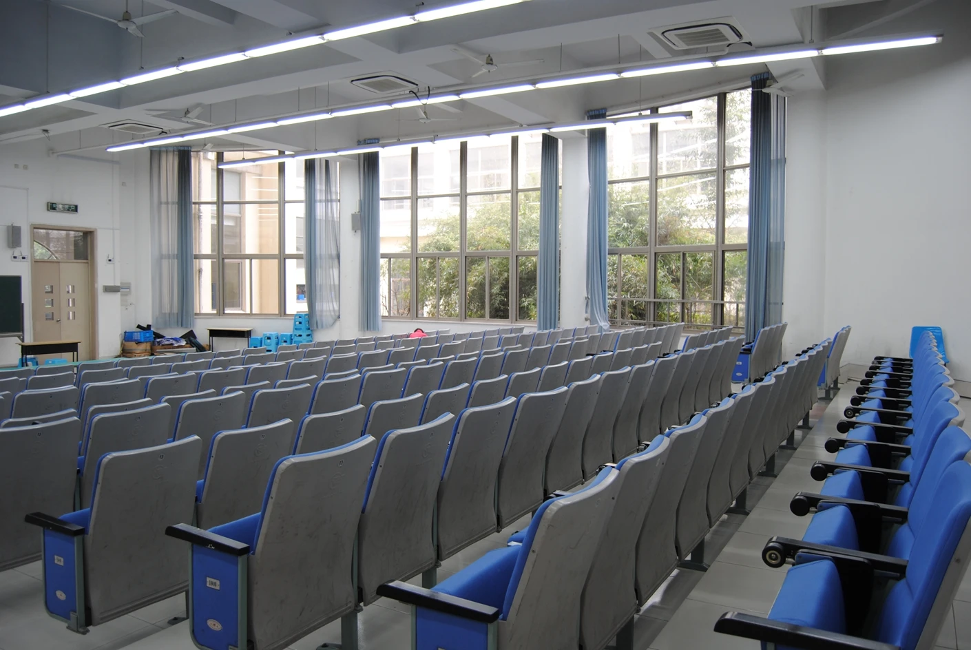 5号教学楼作为松江校区的主力教学楼之一,建筑设计兼顾实用性与美观性,楼内动线清晰,电梯与楼梯并行,方便师生快速抵达各楼层教室。300人阶梯教室空间规划科学合理,整体呈扇形布局,共设有300个阶梯式座椅,座椅采用人体工学设计,靠背角度适宜,坐垫柔软舒适,能够有效缓解长时间就坐的疲劳感。座椅排布严格遵循视线优化原则,前后排间距充足,每一排的高度差经过精准测算,确保后排使用者的视线完全不会被前排遮挡,无论是观看讲台的板书内容,还是欣赏投影屏幕上的课件、视频,都能拥有清晰无死角的视野。这种阶梯式布局彻底打破了传统平层教室的视野局限,让每一位参与者都能沉浸式投入到教学或活动当中,尤其适合需要全员专注听讲的中型讲座与培训活动。
