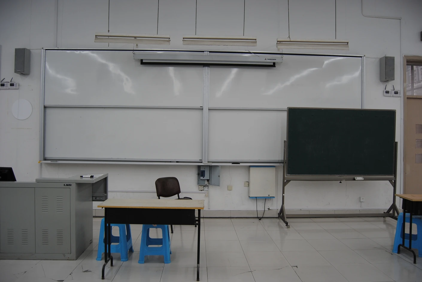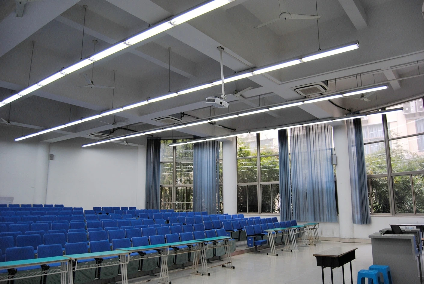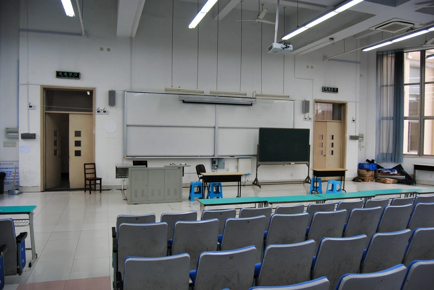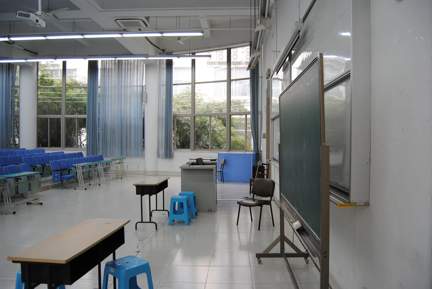 教室的教学设施配置堪称完备,实现了传统教学工具与现代化多媒体设备的完美融合。讲台区域不仅配备了一块传统教学黑板,满足教师即兴板书、推导公式的需求,还增设了一块高清交互式白板,支持触控书写、课件批注、内容投屏等多种功能,教师可以灵活切换教学模式,将枯燥的理论知识转化为生动直观的可视化内容。教室前端悬挂着一台高清投影仪,与多媒体系统无缝连接,投影分辨率高、画面清晰,即便在光线明亮的白天,投影内容也能清晰可见,无需完全遮蔽自然光。同时,教室配备了专业的音响系统,麦克风音质清晰无杂音,扬声器均匀分布在教室各个角落,确保讲台区域的声音能够精准覆盖每一个座位,后排的使用者也能清晰听清每一个知识点。在环境舒适度方面,教室安装了多台冷暖双控空调,能够根据季节变化精准调节室内温度,搭配壁挂式风扇,进一步优化室内空气流通效果,无论是炎热的夏季还是寒冷的冬季,都能为师生营造出恒温舒适的学习与活动环境。尤为值得一提的是,教室的采光设计极具匠心,大面积的窗户采用双层隔音玻璃,既能引入充足的自然光线,让教室内部明亮通透,又能有效隔绝外界的噪音干扰,保障教学与活动的顺利开展,即便在阴天,室内也无需依赖人工照明就能保持良好的亮度。