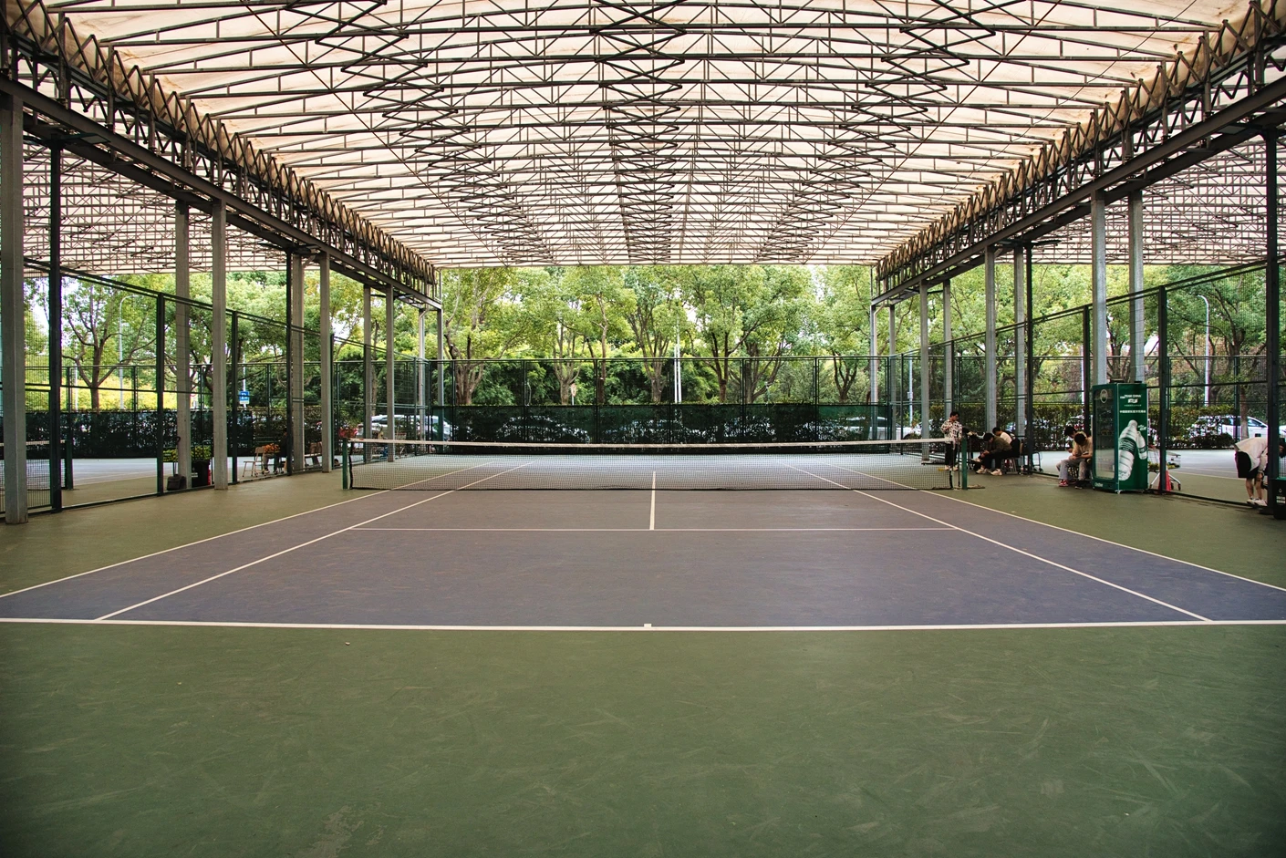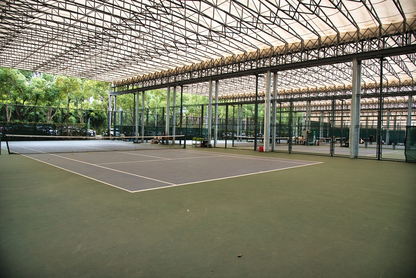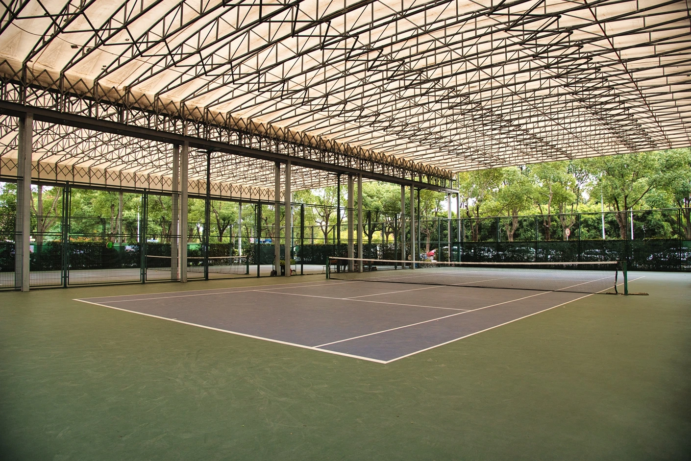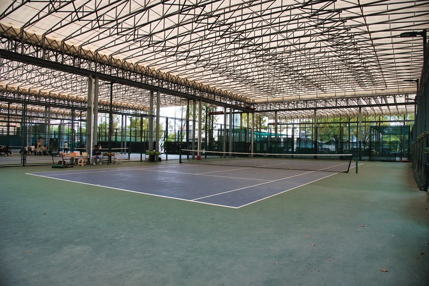 松江校区网球场选址于体育设施集中区域,紧邻体育馆与田径场,形成了功能互补的运动空间网络,便于开展多项目联动的体育活动与赛事。场地整体规划严格遵循国际网球联合会(ITF)标准,5 片球场均采用南北走向布局,最大程度减少阳光直射对运动员视线的影响,每片场地间距不小于 4 米,既保障了运动时的独立性,避免场地间的相互干扰,又能形成浓厚的运动氛围。5 片球场均配备全覆盖式顶棚,属于专业风雨球场设计,顶棚采用高强度 PVDF 膜材与钢结构搭建,抗风等级达 10 级以上,兼具坚固性与耐候性,既能在雨天有效遮风挡雨,又能在晴天遮挡强光与紫外线,彻底摆脱天气因素对网球运动的限制,实现全天候稳定使用。顶棚设计兼顾通风性,采用柔性牵引式结构,空气流通顺畅,避免封闭空间带来的闷热感,让运动体验更舒适。