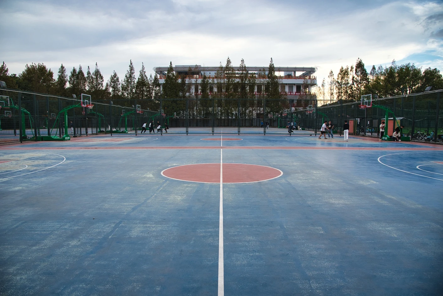 东华大学松江校区篮球场选址于校区体育设施集中区域,远离教学核心区的喧嚣,既有效隔绝了运动噪音对日常教学秩序的干扰,又能让使用者在运动中享受校园的自然景致。场地整体规划严格遵循国际篮联(FIBA)标准,10 片篮球场均采用南北走向布局,最大程度减少阳光直射对运动员视线的影响,保障运动过程中的视觉舒适度。每片场地之间预留不少于 3 米的间距,既形成了连片运动的浓厚氛围,又避免了不同场地间的运动干扰,有效防止篮球飞出场地时碰撞到相邻区域的人员,大幅提升了运动的安全性。每片篮球场均为标准尺寸设计,长 28 米、宽 15 米,场地界线采用专业丙烯酸划线漆绘制,线条清晰规整、耐磨耐候,即便长期经受日晒雨淋也不易褪色模糊,精准界定了三分线、罚球线、中线等关键区域,完全符合专业训练与业余赛事的场地要求。