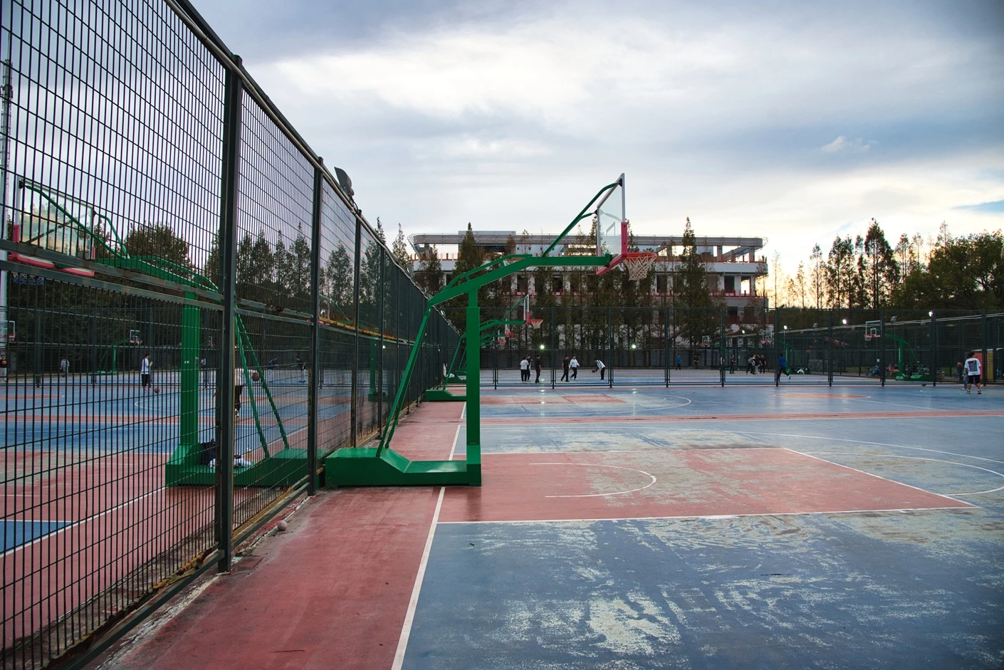 为保障运动区域的独立性与安全性,10 片篮球场均环绕设置 4 米高的专业围网,围网采用高强度镀锌钢丝编织焊接而成,表面经 PE/PVC 防腐涂层处理,具备出色的抗腐蚀、抗老化能力,能够有效防止篮球飞出场地造成安全隐患,同时隔绝外界干扰,让运动者可以更加专注地投入到比赛或训练中。尤为值得一提的是,围网上方均匀布设了专业夜间照明系统,灯杆高度达 8 米,采用 400W 专用 LED 体育照明灯具,灯光照射范围广、亮度均匀,平均水平照度不低于 300Lux,均匀度≥0.6,且通过防眩光设计,避免光线直射运动员眼部影响发挥,完全满足夜间训练与中小型赛事的照明需求。夜间照明系统的配备,大幅延长了场地的有效使用时间,无论是傍晚课后还是周末夜晚,都能为师生提供明亮舒适的运动环境,彻底解决了白天时间紧张无法运动的难题。