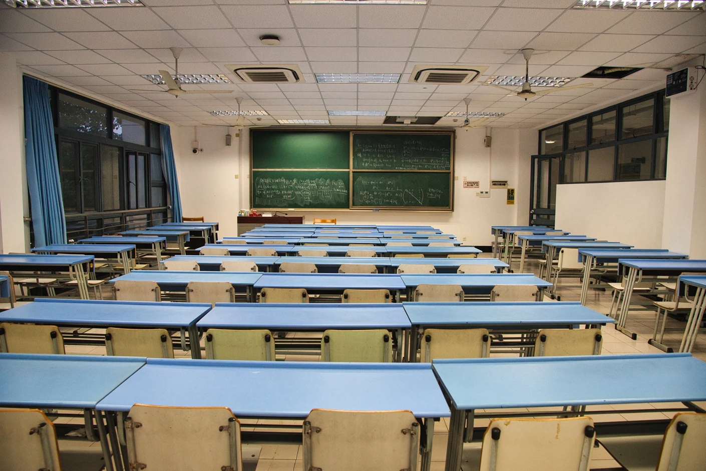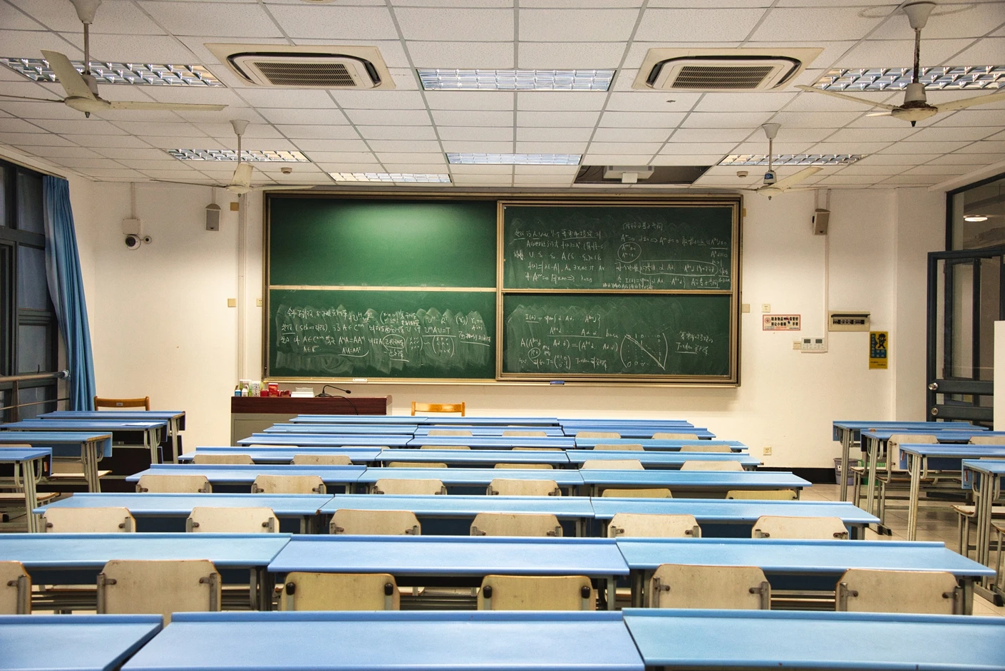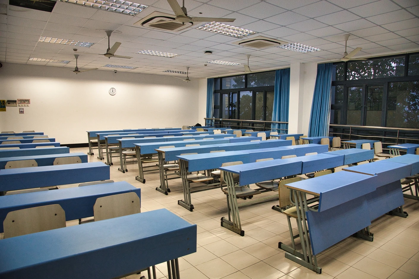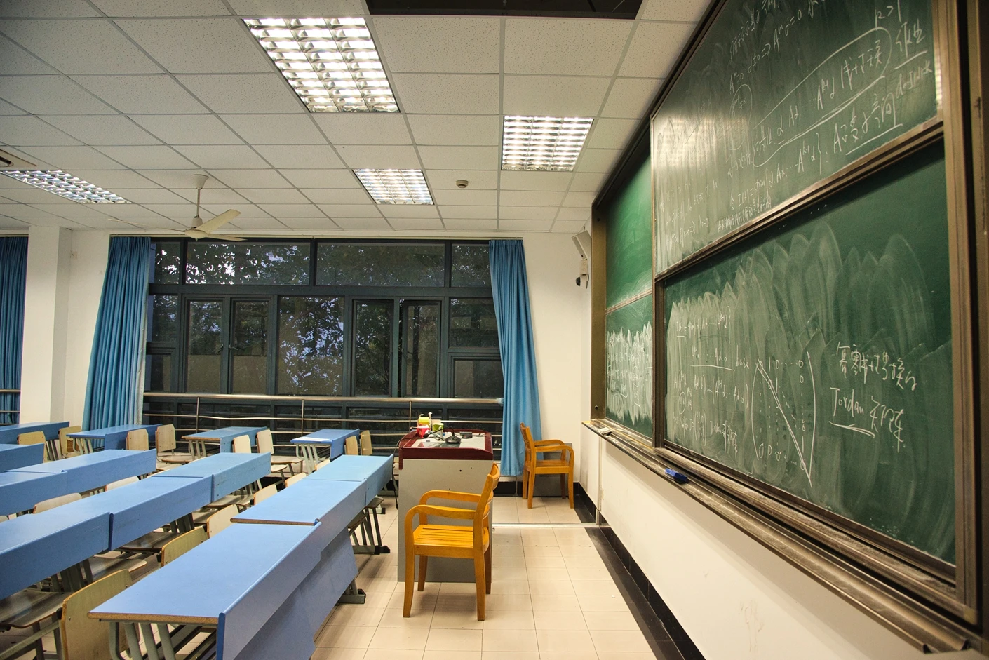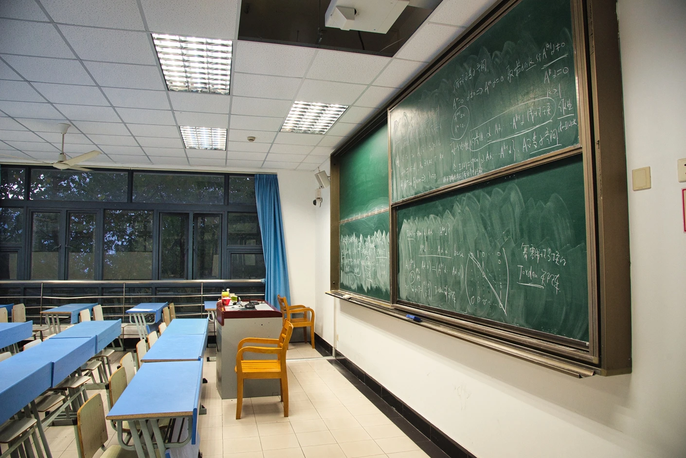 这间90人教室采用规整的行列式布局,每排设置10个座位,共9排,座位间距经过合理规划,既保障了师生进出的便捷性,又避免了多人聚集时的拥挤感,即便长时间就坐也能保持舒适体验。教室层高3.6米,空间开阔通透,良好的层高设计有效促进室内空气流通,缓解了多人教学场景下的闷热感,为师生营造了清爽舒适的学习与交流氛围。教室的教学设施配置精准匹配教学需求,讲台区域配备传统黑板,满足教师即兴推导公式、书写核心知识点的教学需求;前端悬挂高清投影仪,画质清晰、色彩还原度高,能够精准呈现课件、视频、图表等多媒体教学内容,即便自然光充足也无需完全遮光,保障教学可视化效果。同时,教室配备专业音响系统与吊麦,吊麦拾音清晰稳定,无需手持即可实现声音全覆盖,扬声器均匀分布于教室各处,确保讲台声音精准传递到每一个座位,彻底解决后排听音不清的问题。
