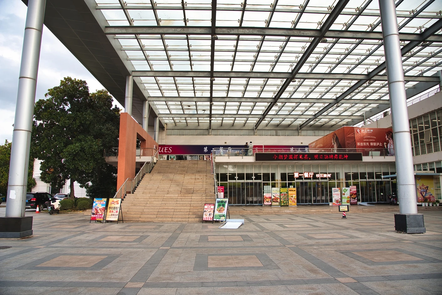 该路演场地坐落于松江校区师生日常动线的核心节点 —— 第一食堂正门口,独特的 “楼下第一食堂 + 楼上第二食堂” 布局,形成了双倍人流叠加效应。作为校区内核心餐饮综合体,两层食堂日均服务数千名师生,早、中、晚三餐时段人流高度集中,上下楼就餐的师生必经场地门口,构成天然的高密度受众池;即便在非就餐时段,也有大量师生途经此处前往周边教学楼、三期四期学生公寓、图文信息中心等地,全时段稳定的人流让活动曝光率与参与度事半功倍。场地空间开阔平整,地面采用防滑耐磨材质,承载力强,可直接搭建 3*3 米标准帐篷设摊,无需额外场地改造,同时预留了充足的通行空间,既保障路演活动的有序开展,又不影响师生正常就餐动线。