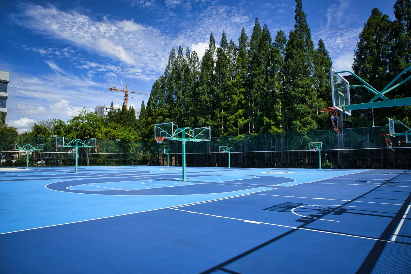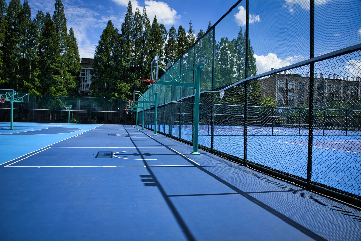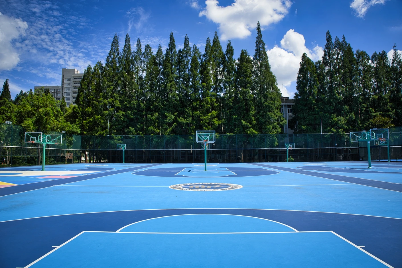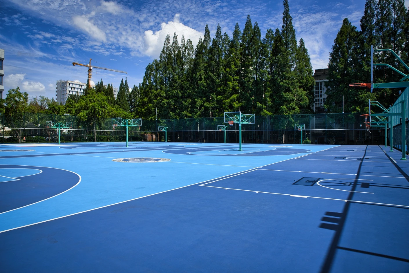 华东理工大学徐汇校区篮球场经过专业升级改造,场地品质对标国际标准,整体布局科学规整。场地核心区域包含6片标准化室外篮球场,全部采用专业运动地胶铺设,地面弹性适宜、防滑耐磨,能有效减少运动损伤,为师生提供安全舒适的运动体验;场地划线清晰规范,色彩明快醒目,进一步提升了运动的专业性与观赏性。为保障运动安全与场地独立性,篮球场四周设置了高度达6米的坚固铁丝围网,围网经过加固、除锈刷漆处理,网片全部更新,既能有效隔离外部干扰,避免运动过程中篮球飞出场外,又能保障场内运动者的安全,让师生可专注投入运动。值得一提的是,场地中还特别打造了一块“网红球场”,通过独特的线条与色彩设计,呼应运动者的活力身影,成为校园内极具人气的运动打卡点。