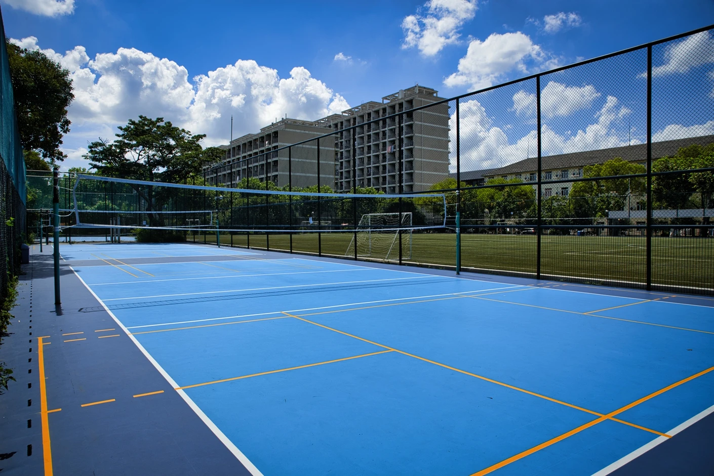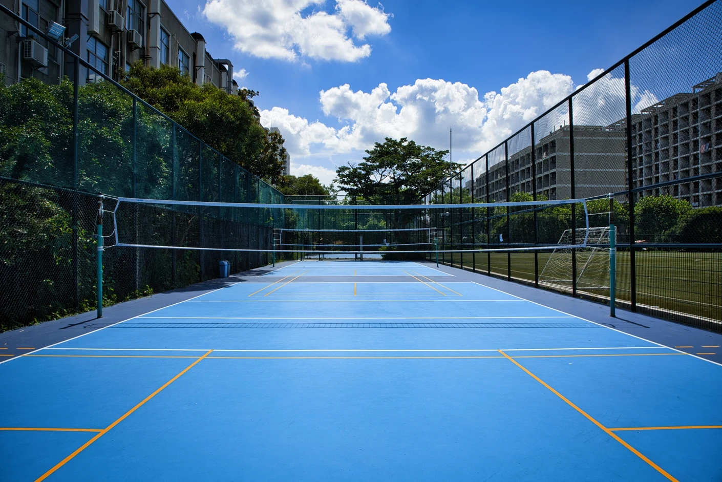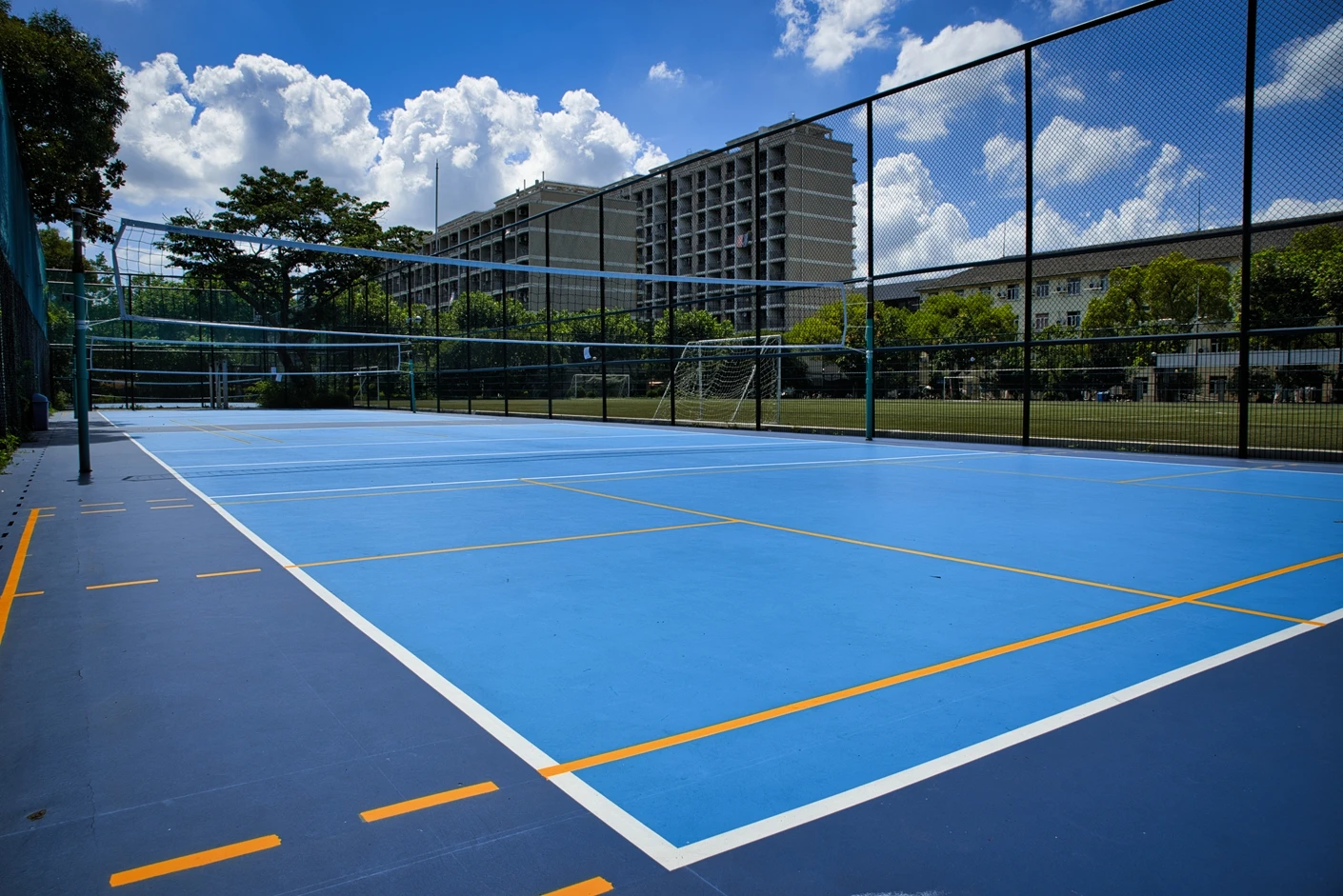 该排球场经过专业升级改造,整体布局科学规整,核心区域包含3片标准化室外排球场,全部采用高品质塑胶地面铺设,地面平整且弹性适宜,能有效缓冲运动冲击力、减少关节损伤,搭配清晰规范的白色场地标线,专业质感十足。为保障运动安全与场地独立性,四周设置了高度达6米的坚固铁丝围网,围网经过加固处理,既能隔绝外部干扰、防止排球飞出场外,又能让场内运动者专注投入竞技,营造纯粹的运动氛围。每片场地均配备标准排球架与优质球网,网高可根据男女组别灵活调节,全方位满足教学、训练与竞赛需求。