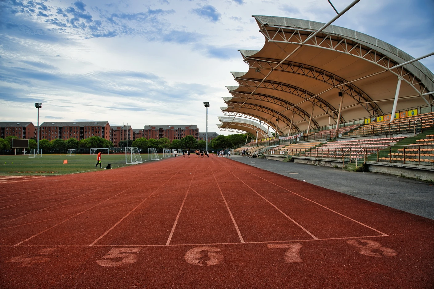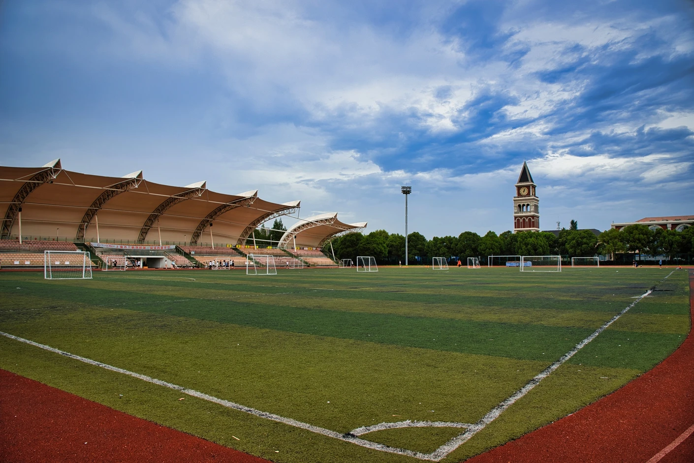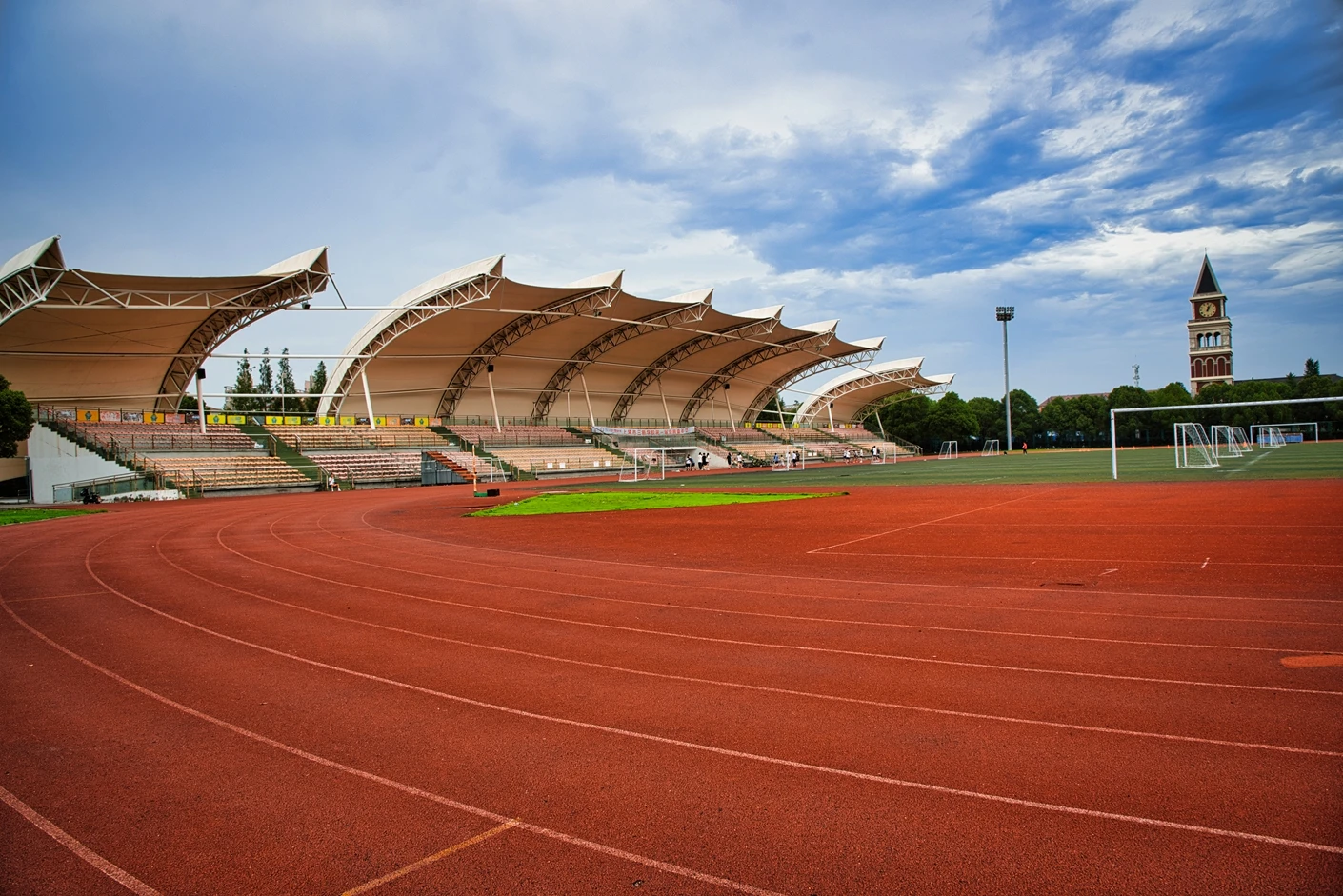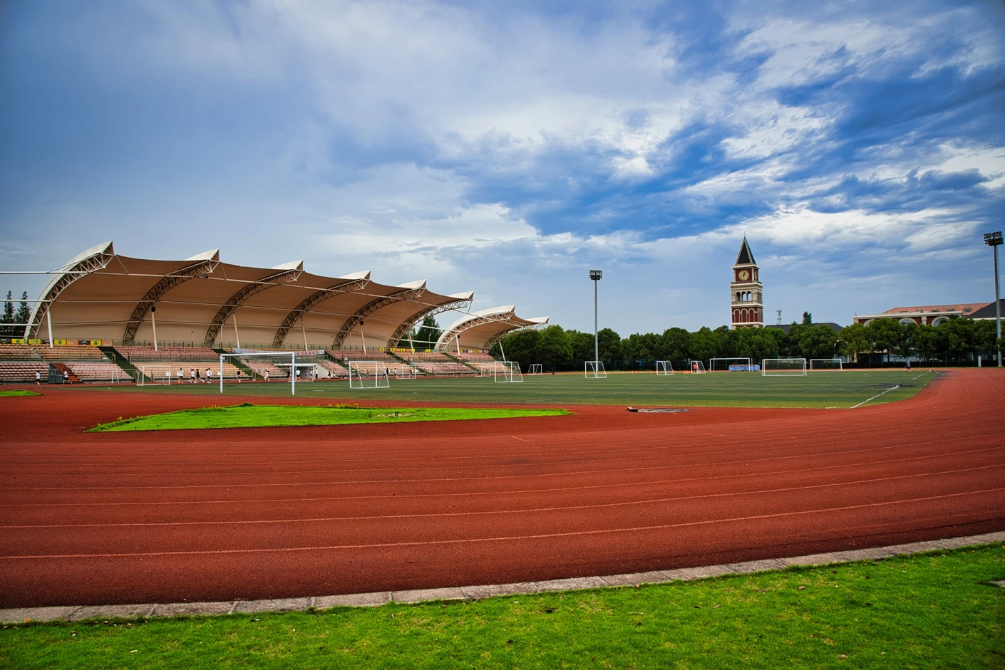 体育场的观赛与保障设施同样完善贴心。全场设有2360 个固定座位,且观众席全部覆盖遮阳棚,无论烈日还是小雨,都能为观赛师生提供舒适的观赛环境,充分体现了人文关怀。为打破时间限制,实现全天候运动,体育场四边专门设置了20 米高的专业夜间照明灯,灯光布局科学,光线均匀柔和、无眩光,照度完全满足教学训练与赛事活动要求,让师生在晚间也能享受高质量的运动体验。同时,场地支持车辆停放,极大方便了大型活动物料运输、校外赛事团队接待等需求,提升了场地的综合服务能力。