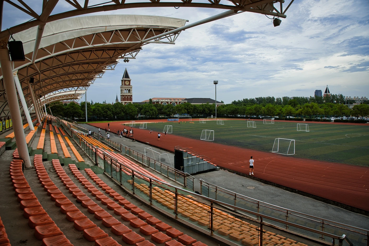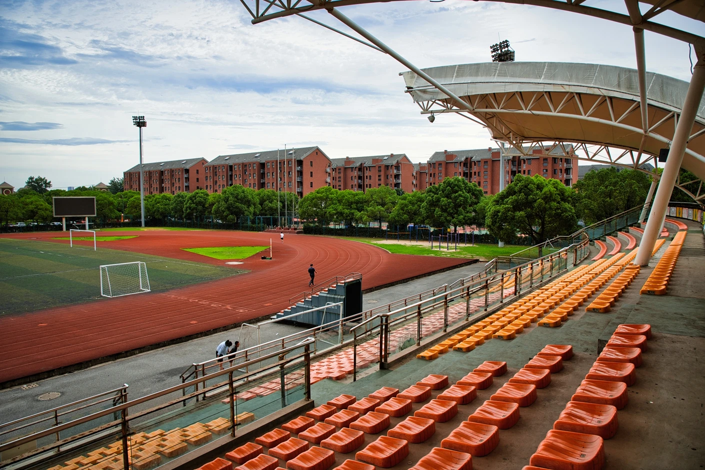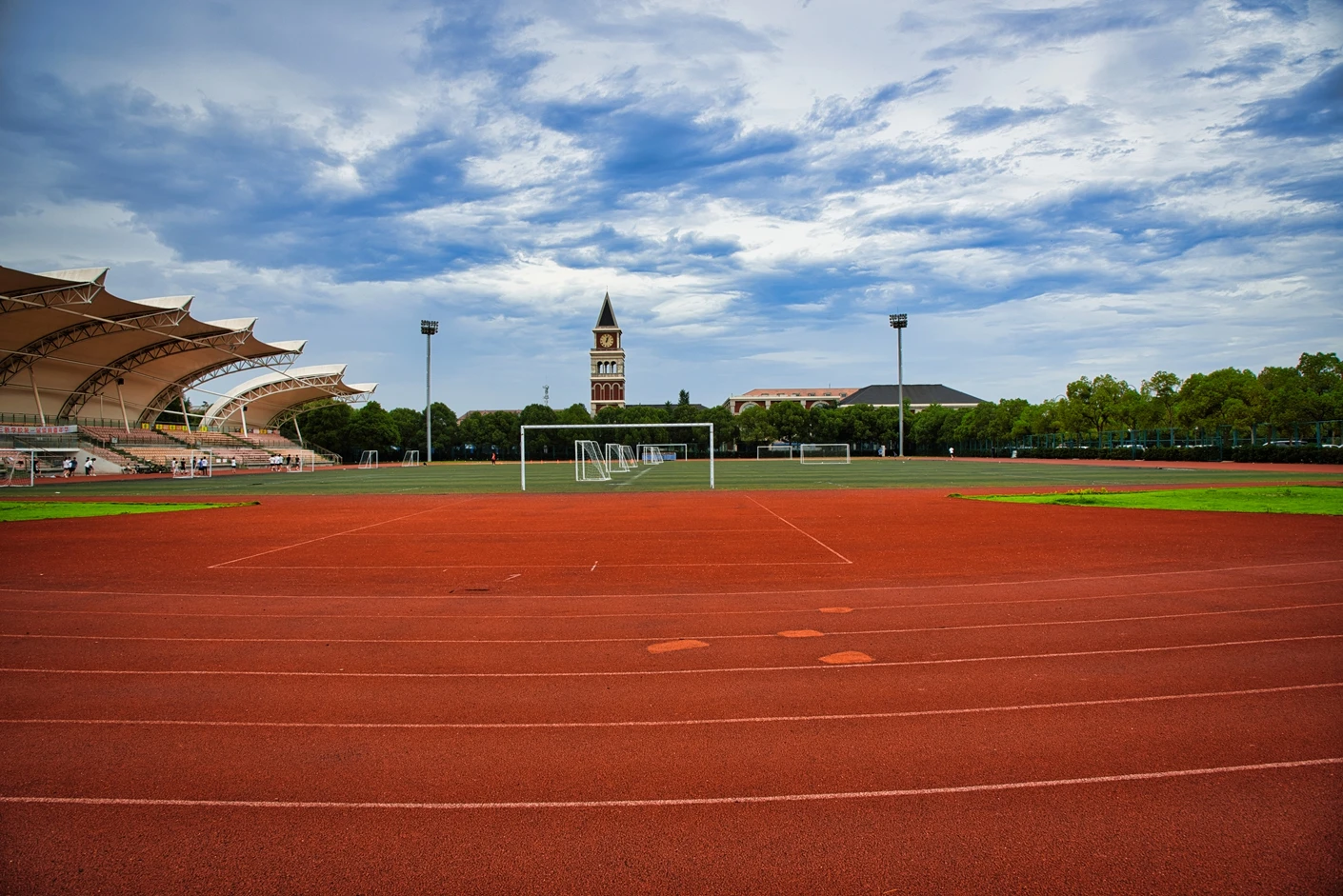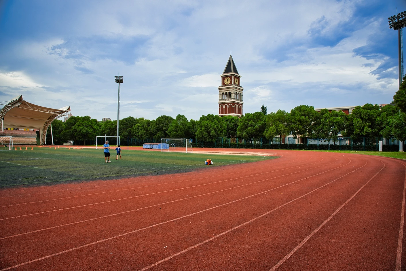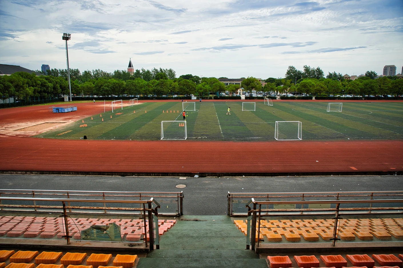 体育场的观赛与保障设施同样完善贴心。全场设有2360 个固定座位,且观众席全部覆盖遮阳棚,无论烈日还是小雨,都能为观赛师生提供舒适的观赛环境,充分体现了人文关怀。为打破时间限制,实现全天候运动,体育场四边专门设置了20 米高的专业夜间照明灯,灯光布局科学,光线均匀柔和、无眩光,照度完全满足教学训练与赛事活动要求,让师生在晚间也能享受高质量的运动体验。同时,场地支持车辆停放,极大方便了大型活动物料运输、校外赛事团队接待等需求,提升了场地的综合服务能力。