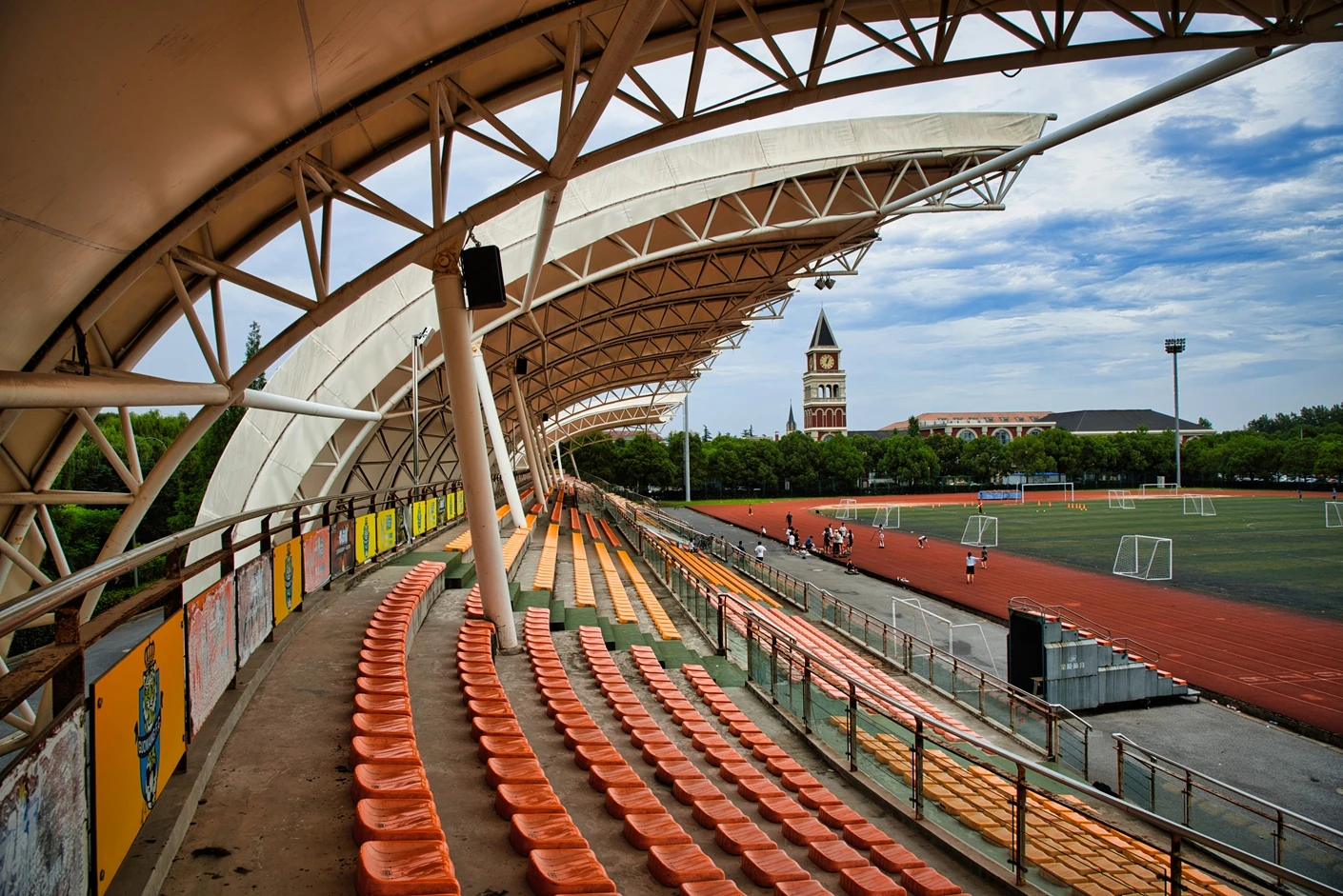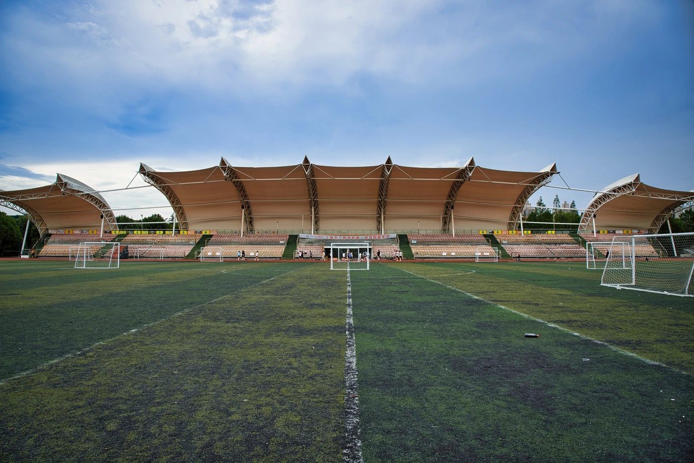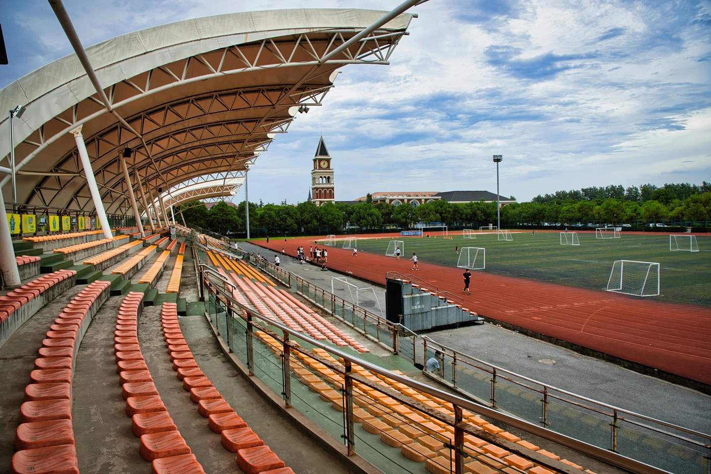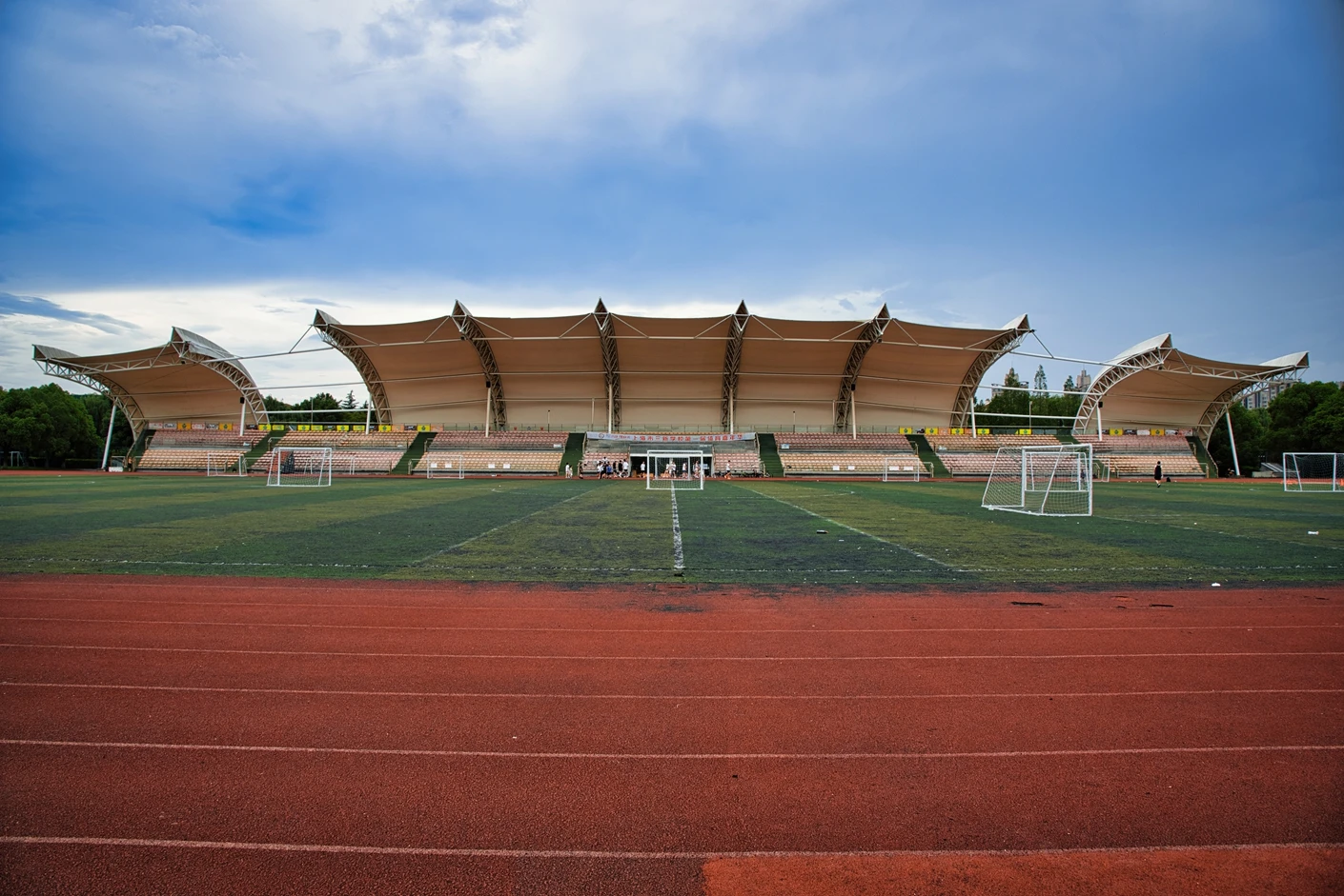 体育场的观赛与保障设施同样完善贴心。全场设有2360 个固定座位,且观众席全部覆盖遮阳棚,无论烈日还是小雨,都能为观赛师生提供舒适的观赛环境,充分体现了人文关怀。为打破时间限制,实现全天候运动,体育场四边专门设置了20 米高的专业夜间照明灯,灯光布局科学,光线均匀柔和、无眩光,照度完全满足教学训练与赛事活动要求,让师生在晚间也能享受高质量的运动体验。同时,场地支持车辆停放,极大方便了大型活动物料运输、校外赛事团队接待等需求,提升了场地的综合服务能力。