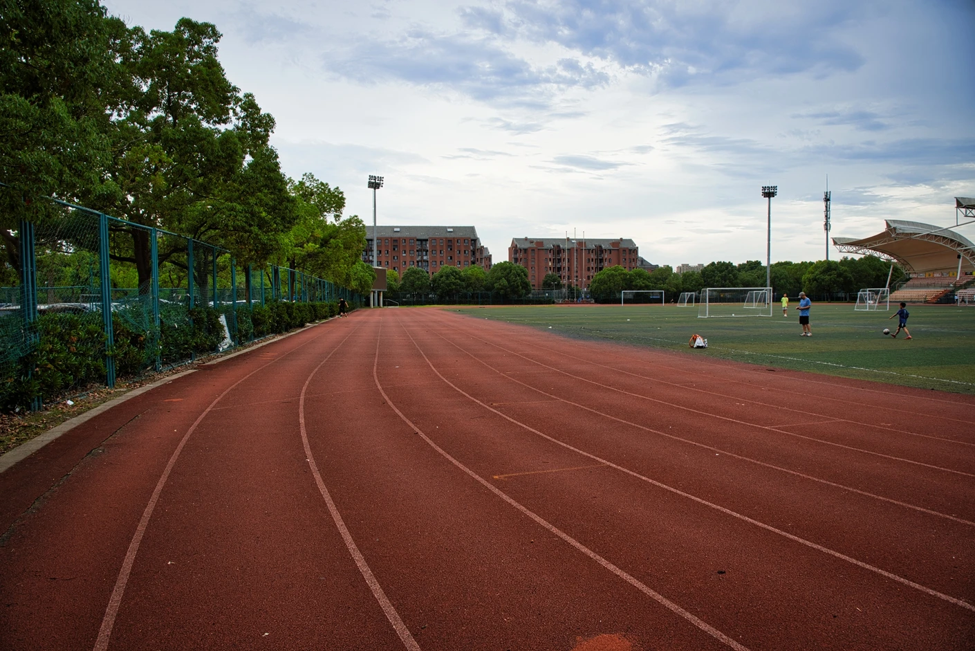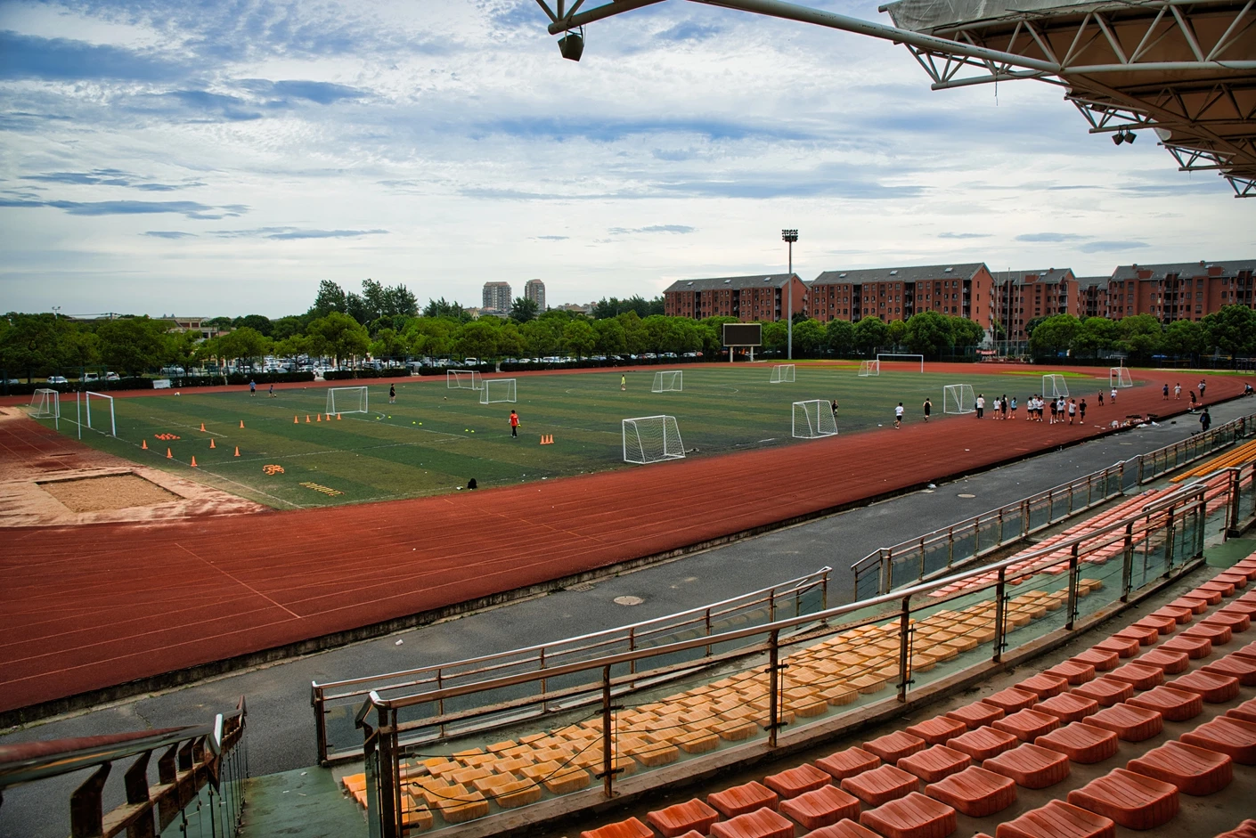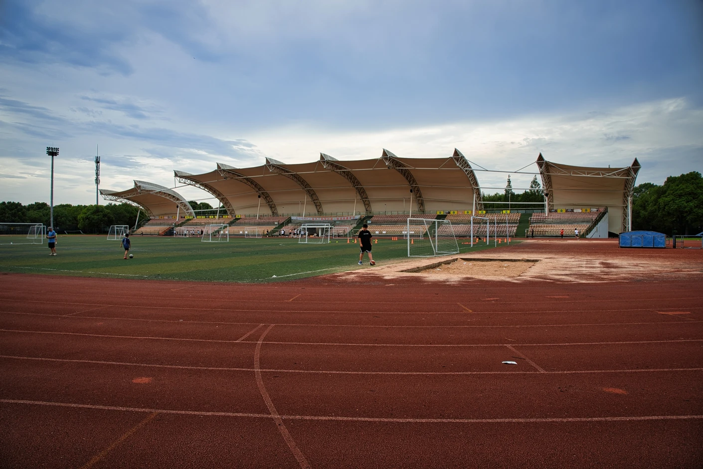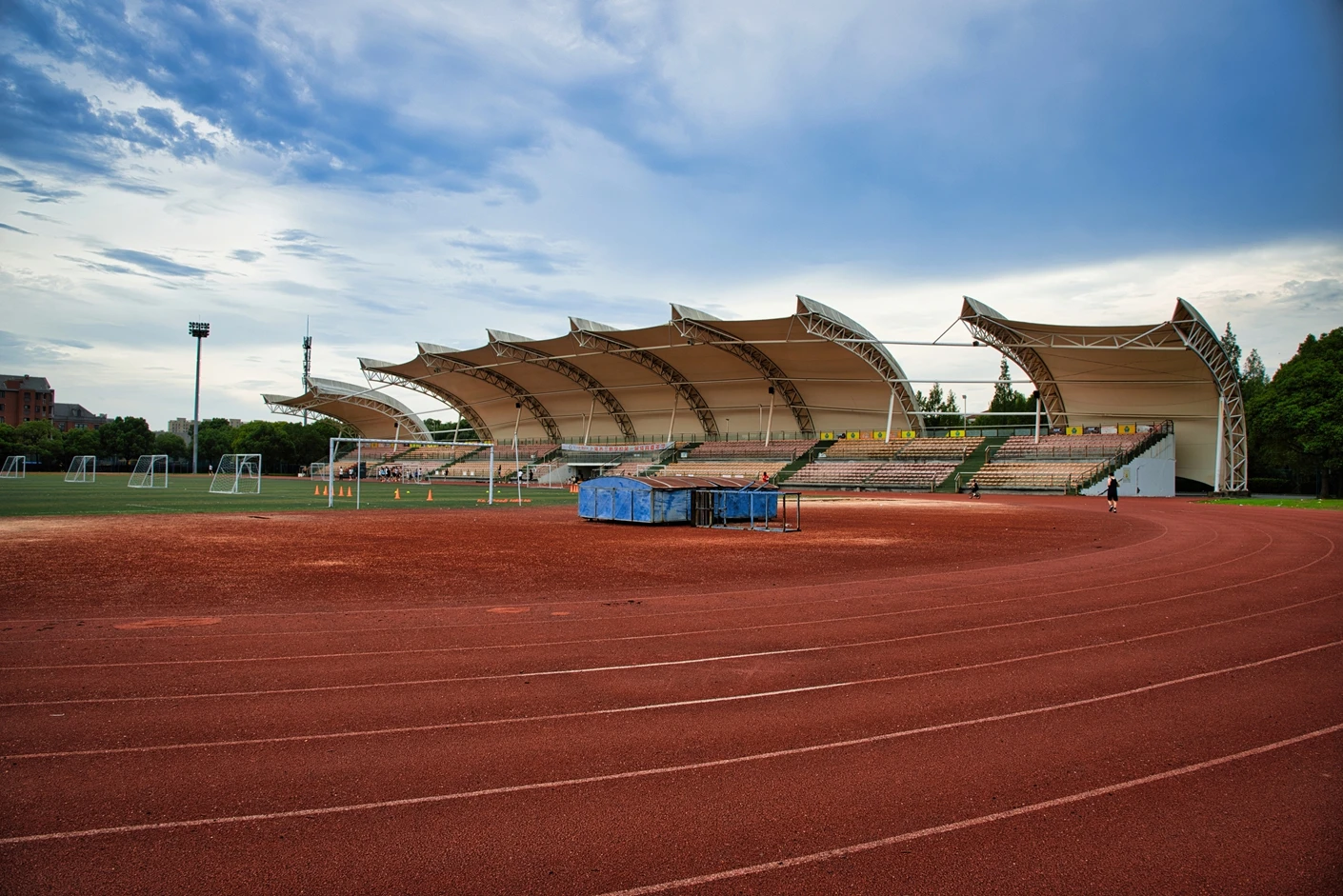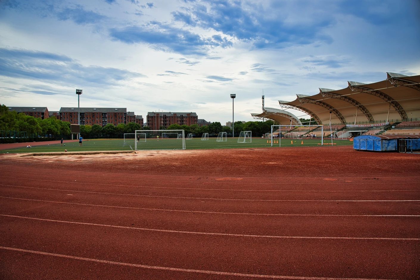 该体育场整体规划科学、硬件配置对标专业标准,核心区域涵盖8 跑道标准田径场与人工草坪标准足球场,为师生提供了安全优质的运动空间。田径场跑道采用高品质塑胶材质,弹性适中、防滑耐磨,能有效缓冲运动冲击力,降低运动损伤风险;足球场人工草坪经过专业翻新升级,在沥青地基与草皮间增设了海绵缓冲垫,触感柔软舒适,兼具出色的排水性能,保障全天候运动需求。场地功能分区明确,配套设施一应俱全,设有专业沙坑、铅球场等田径项目专用场地,满足跳远、三级跳、铅球等多种竞技项目的教学与训练需求;配备的专业音响系统,音质清晰、覆盖全面,为运动会、开幕式等大型活动提供稳定的音频支持。